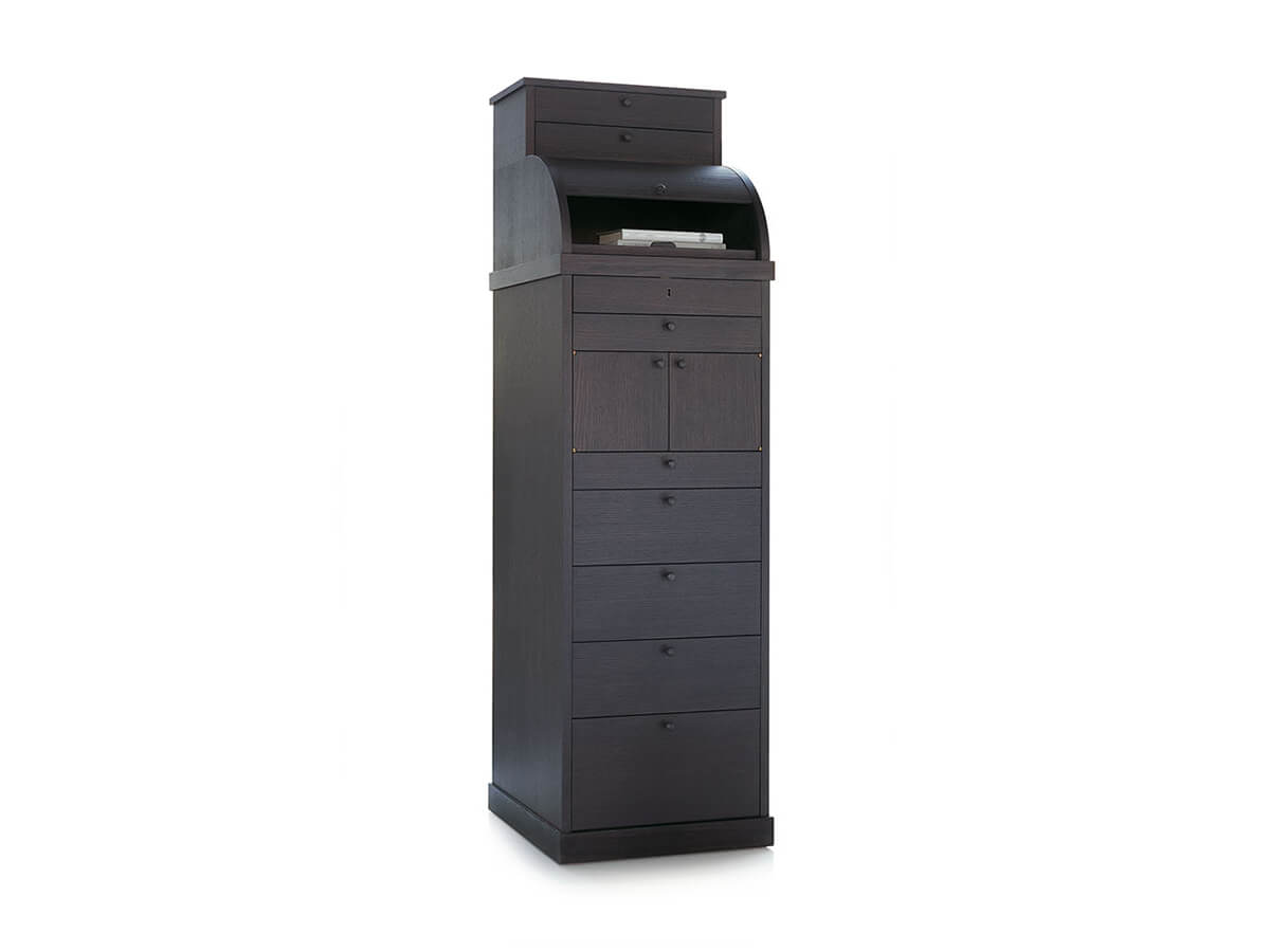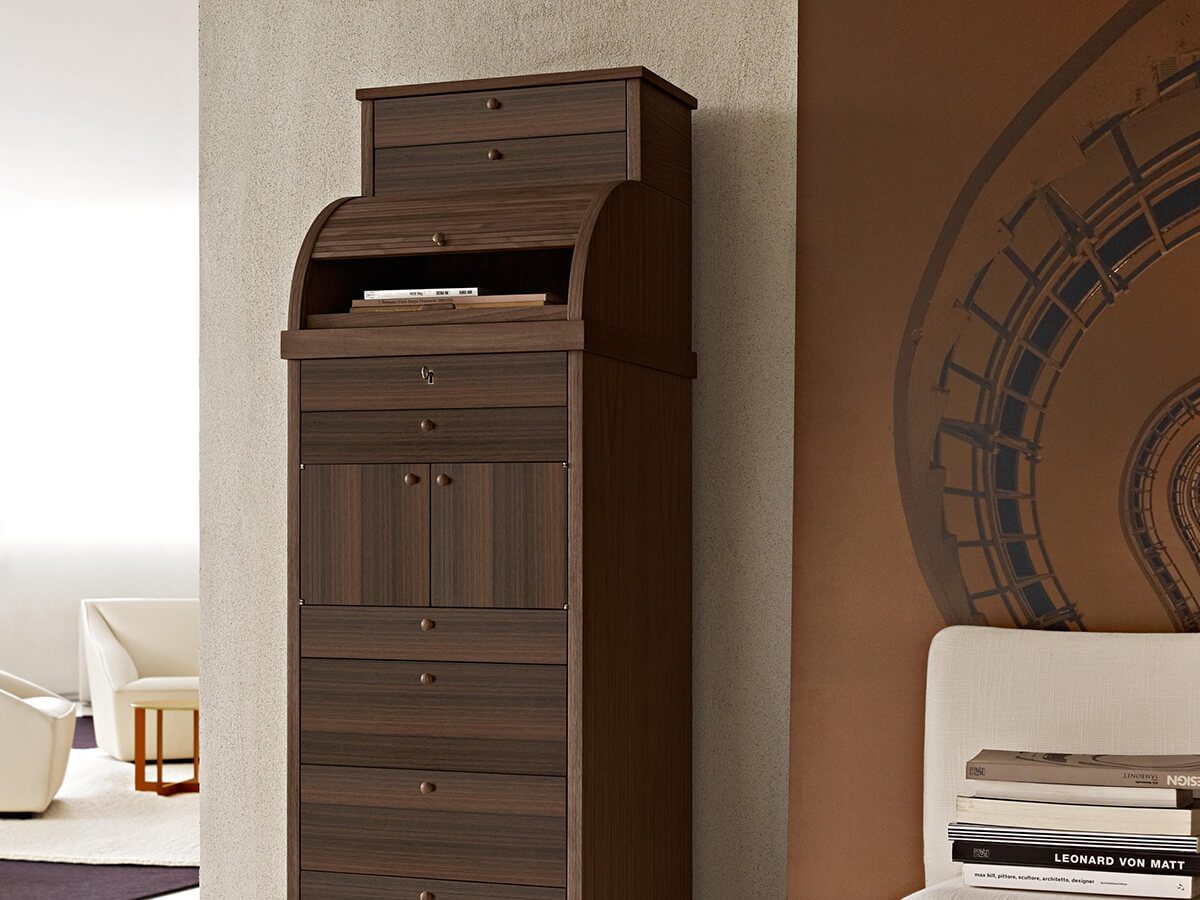 Un elemento d’arredo dal sapore antico e nuovo, capace di suscitare ispirazioni diverse a seconda dell’ambiente e dello stile con cui lo si circondi. Carteggio è un mobile secretaire a cassetti in essenza, con ripiani estraibili protetti da una tapparella scorrevole. È un elemento indispensabile per chi abbia documenti o vari file da riordinare e organizzare in uno spazio sicuro e protetto dagli agenti esterni. Carteggio è disponibile in diverse essenze e finiture per meglio conciliarsi con le esigenze estetiche della casa. Comunque si presenti, in ogni caso, offre forti suggestioni e rimandi stilistici dal carattere sobrio e ben definito, frutto dell’estetica di Aldo Rossi.