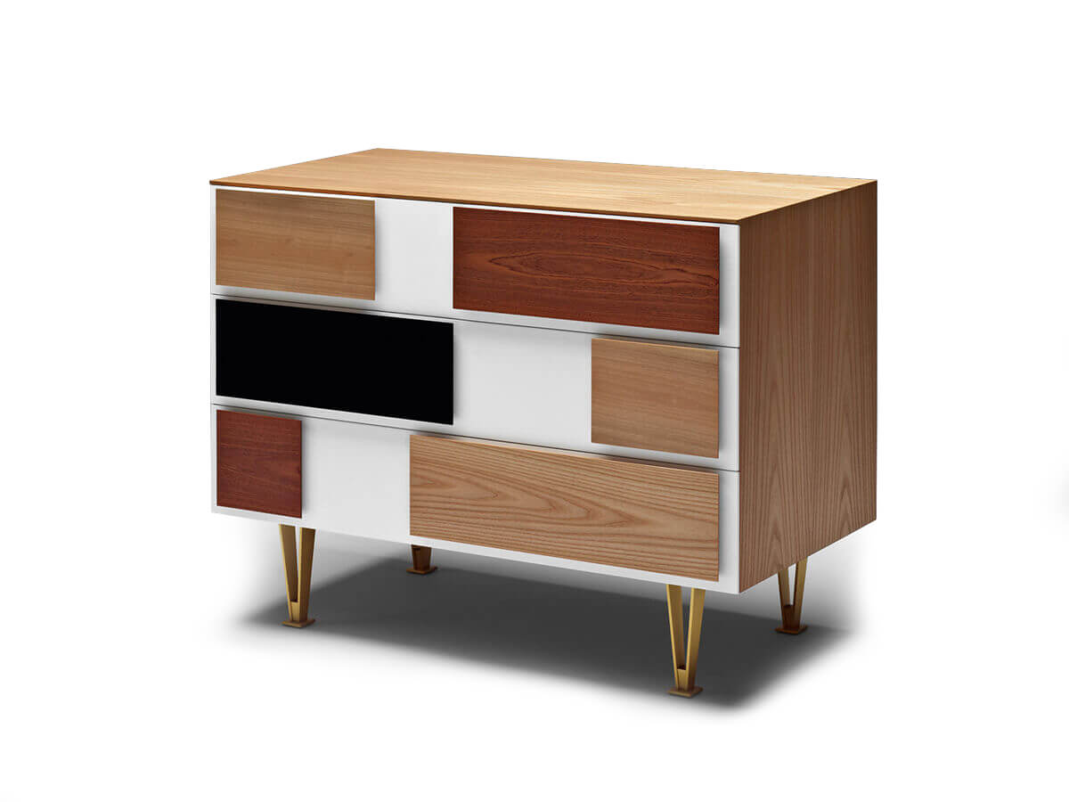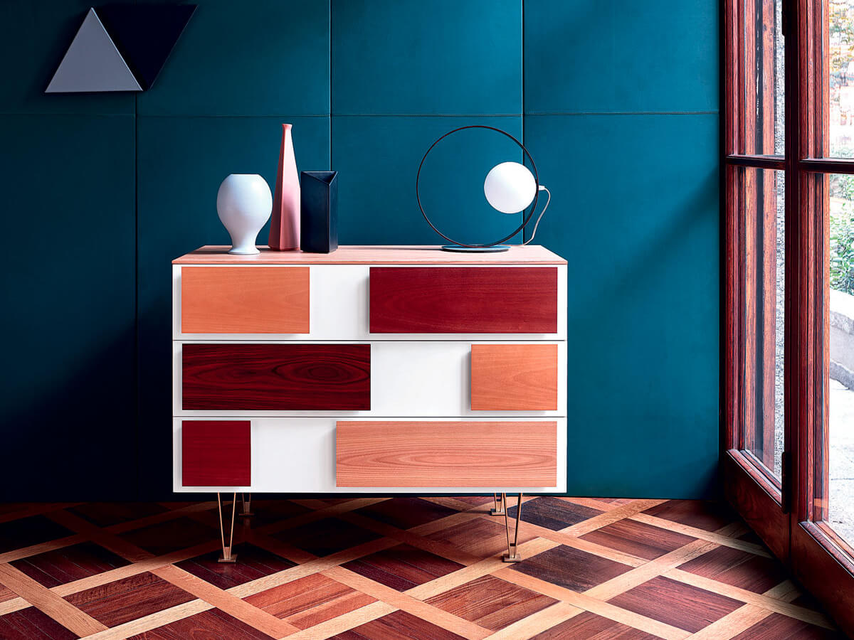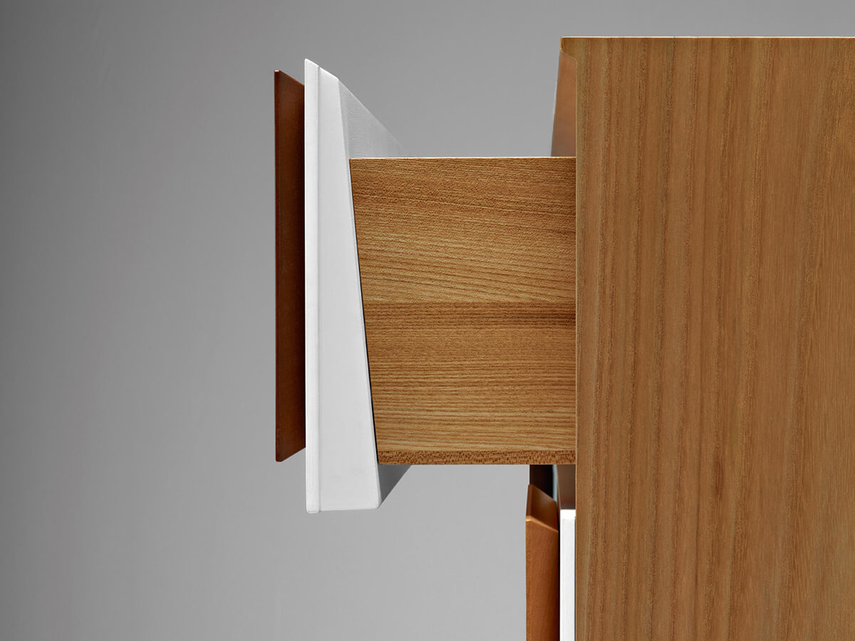 Un elemento d’arredo fuori dagli schemi, capace di unire a stile e gusto una buona dose di giocosità che ne stemperano le forme austere in favore di un’estetica più dinamica e ricca di ispirazioni. La madia D.655.1 è caratterizzata dai frontali dei cassetti verniciati a mano in colore bianco con maniglie applicate di varie essenze fra cui olmo, noce nazionale, mogano e palissandro. Disegnata nel 1952, ha visto riedizioni più recenti prodotte sulla base dei disegni originali custoditi nei Gio Ponti Archives. La struttura è sostenuta da piedi in ottone satinato che ne accrescono la bellezza e finezza stilistiche.