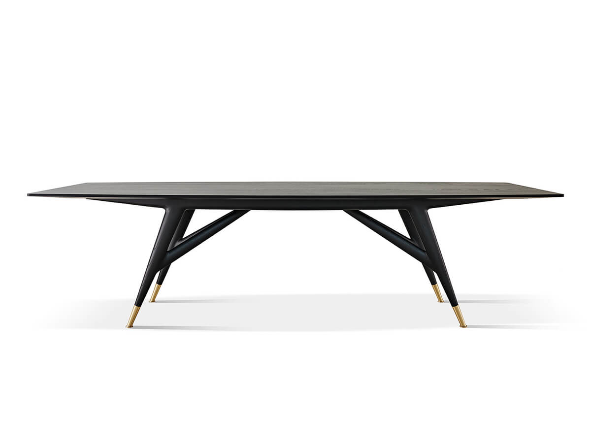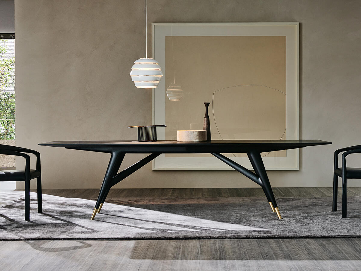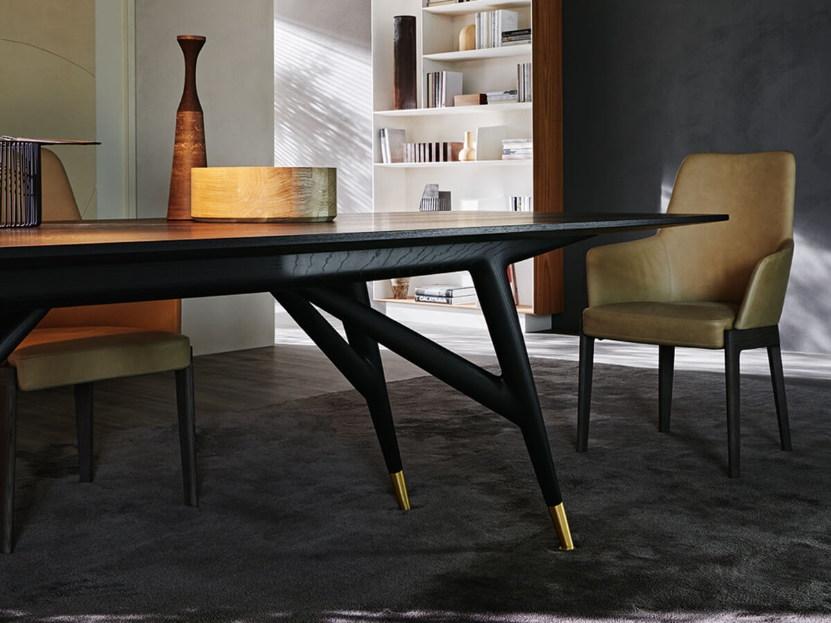 La serie di Poltrona, sedie e tavoli D è il frutto di uno studio particolarmente ispirato di Gio Ponti. Una riflessione tracciata nella suprema ricerca di elementi comodi, eleganti, e versatili, liberamente collocabili in diversi ambienti della casa a seconda del gusto o della necessità. D.859.1 nasce come tavolo per conferenze, fino a dieci posti, disegnato per spiccare non solo per l’imponenza delle sue dimensioni ma anche per il raffinato disegno impresso dal suo creatore. Un tempo realizzato in frassino con puntali d’ottone, viene oggi proposto sia in versione originale che in legno su tonalità scure. Disponibili anche in versioni più contenute per meglio adattarsi agli spazi domestici o zone living differenziate.