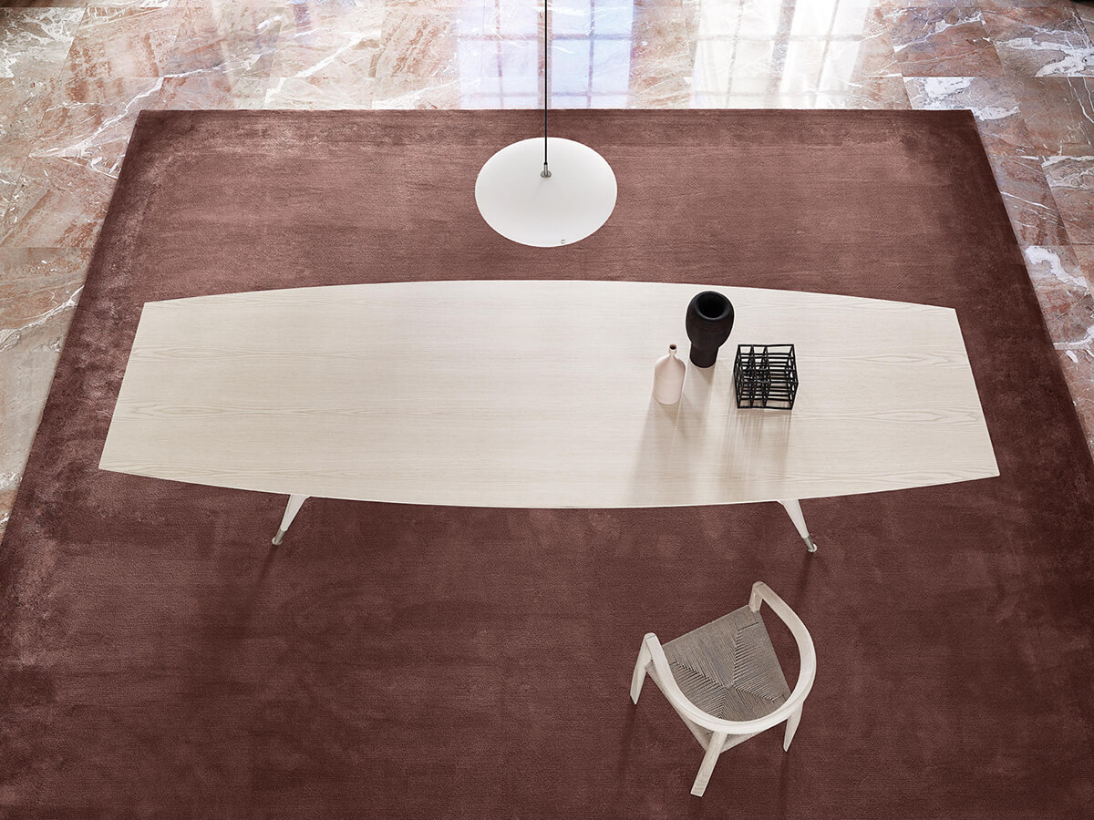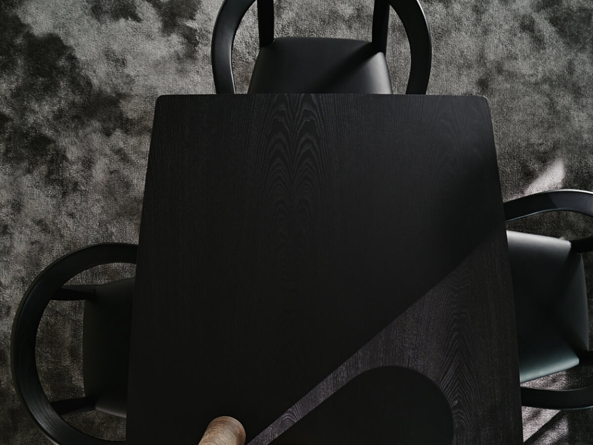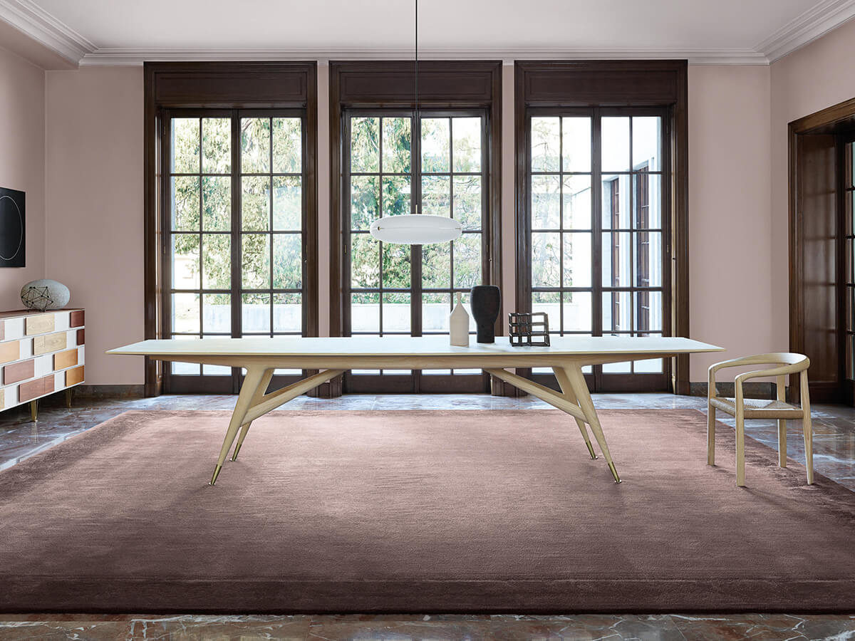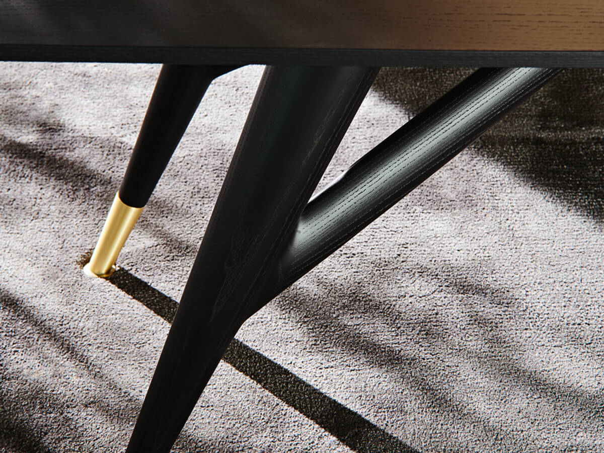 La serie di Poltrona, sedie e tavoli D è il frutto di uno studio particolarmente ispirato di Gio Ponti. Una riflessione tracciata nella suprema ricerca di elementi comodi, eleganti, e versatili, liberamente collocabili in diversi ambienti della casa a seconda del gusto o della necessità. D.859.1 nasce come tavolo per conferenze, fino a dieci posti, disegnato per spiccare non solo per l’imponenza delle sue dimensioni ma anche per il raffinato disegno impresso dal suo creatore. Un tempo realizzato in frassino con puntali d’ottone, viene oggi proposto sia in versione originale che in legno su tonalità scure. Disponibili anche in versioni più contenute per meglio adattarsi agli spazi domestici o zone living differenziate.