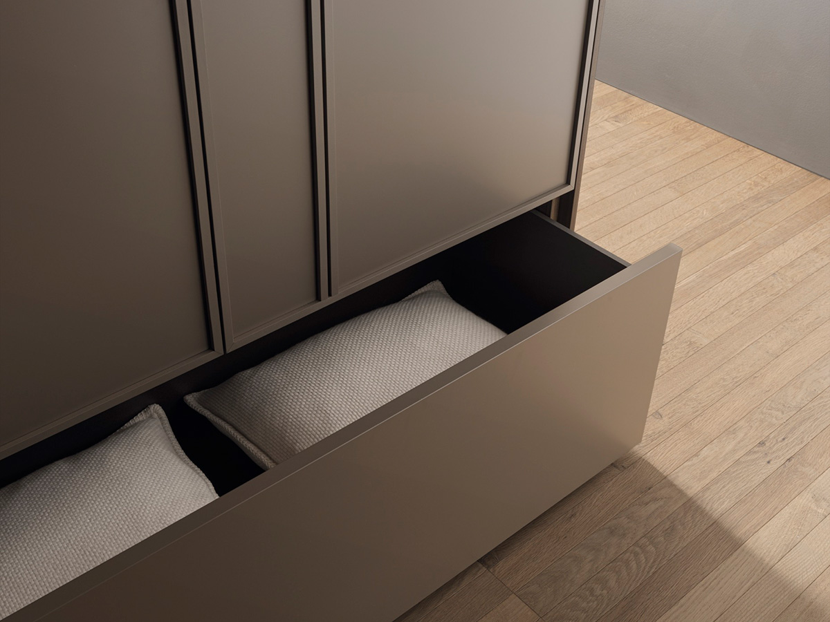 Molteni&C ha arricchito le numerose proposte di catalogo armadi con un nuovo oggetto di estrema qualità, un nuovo elemento capace come sempre di riassumere l’eleganza e la qualità artigianale del marchio proposti in chiave del tutto innovativa, pur mantenendo come sempre un contatto con il passato. La parte anteriore di Gliss Master-Blend è disponibile in diverse configurazioni e può essere dotata di un’anta a tutta altezza o di cassetti più bassi, disponibili in diverse finiture come laccato opaco, legno naturale o in versione specchiata. La capienza di Blend è ulteriormente personalizzabile con la possibilità di aggiungere cassetti modulari in diverse finiture. La parte anteriore è impreziosita da un rivestimento in tessuto disponibile in numerose configurazioni con dettagli dal tocco esclusivo. La gamma di tonalità è varia, ideale per adattarsi alle più diverse esigenze.