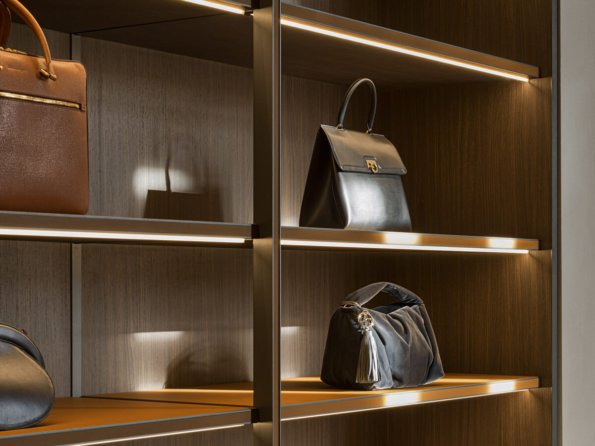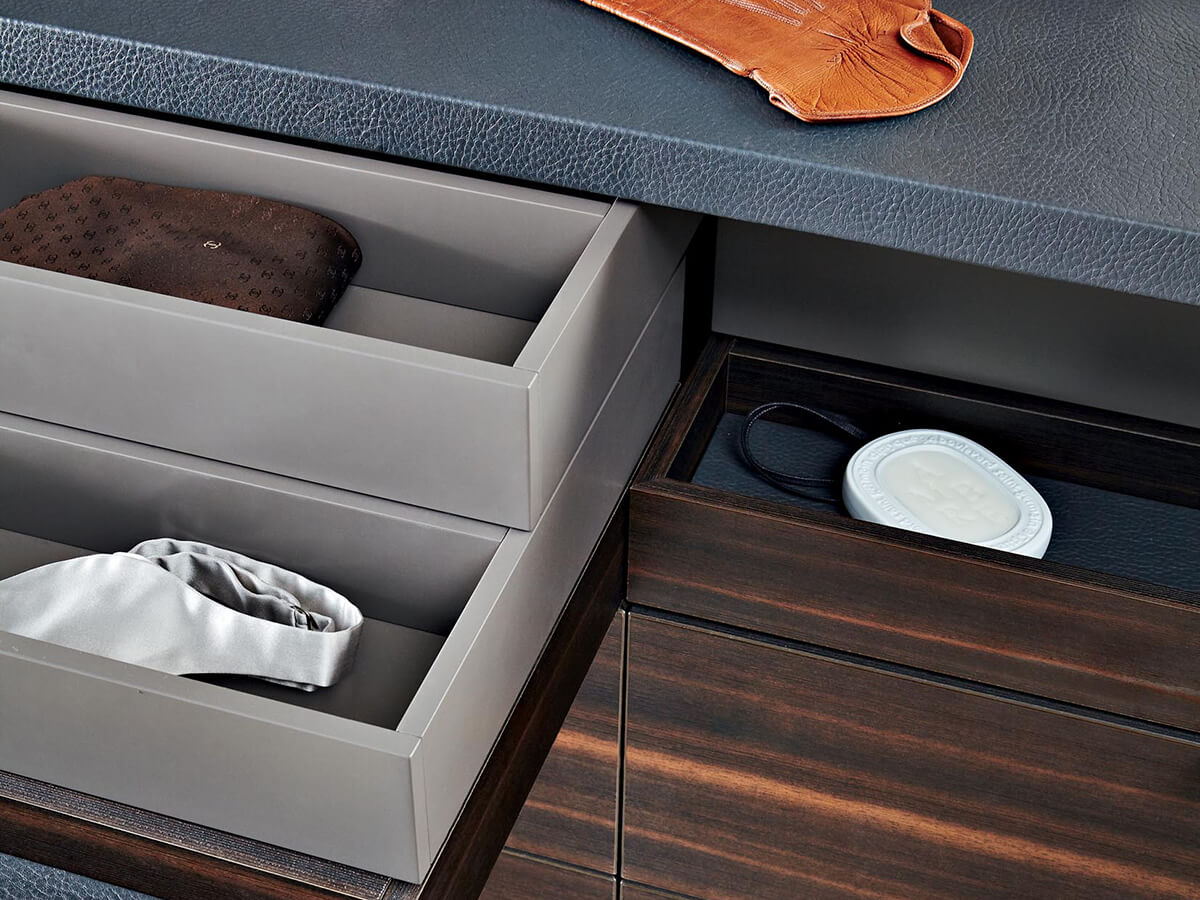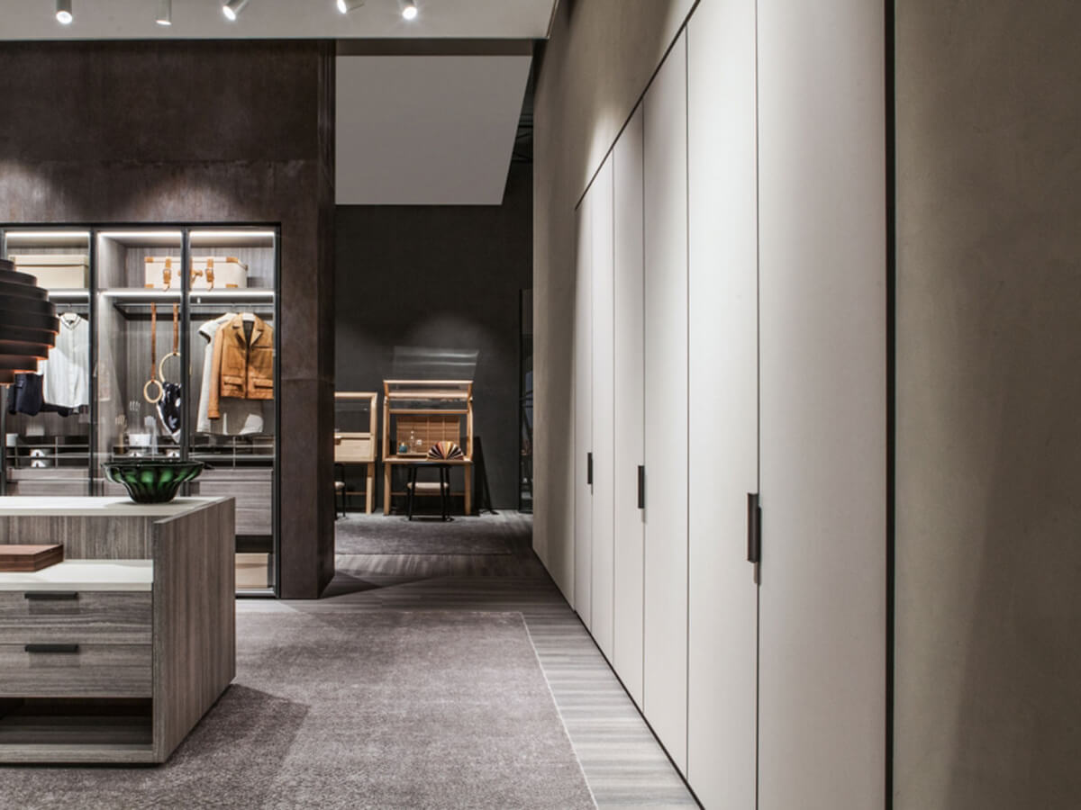 La cabina armadio Gliss Master declina in una sofisticata versione senza ante l’apprezzata collezione Gliss Master, fiore all’occhiello della proposta Molteni & C. per la zona notte: un sistema di armadi che copre la fascia alta di mercato, proponendo finiture pregiate e dettagli costruttivi ricercati, dedicati agli intenditori del design che anche per la zona notte non si vogliono accontentare delle proposte più semplici. Adatta sia per soluzioni lineari che angolari, la cabina Gliss Master dà grande rilievo all’ampia scelta di attrezzature interne, permettendo una personalizzazione capillare: dalle cassettiere sospese ai ripiani portascarpe, dai vassoi estraibili ai vani portaoggetti e cassetti attrezzati con divisori, e molto altro ancora.