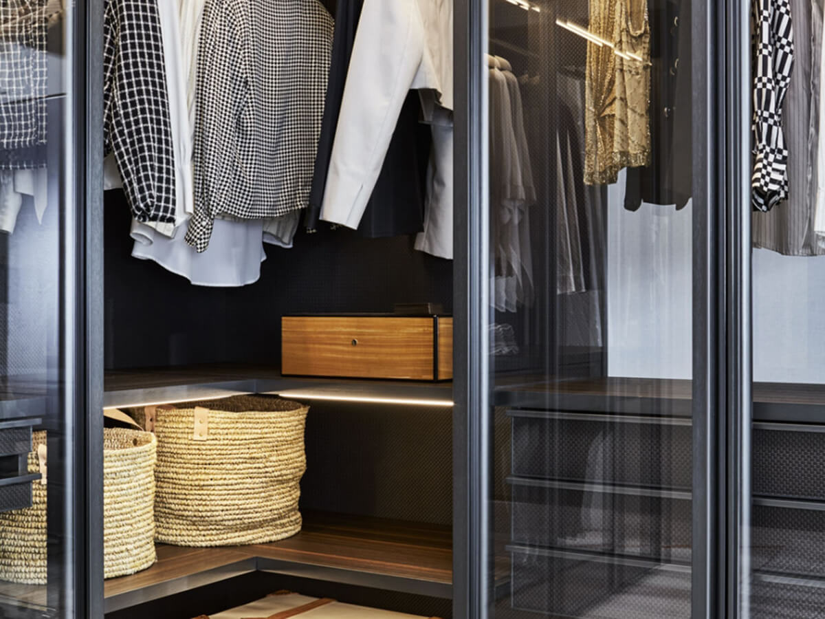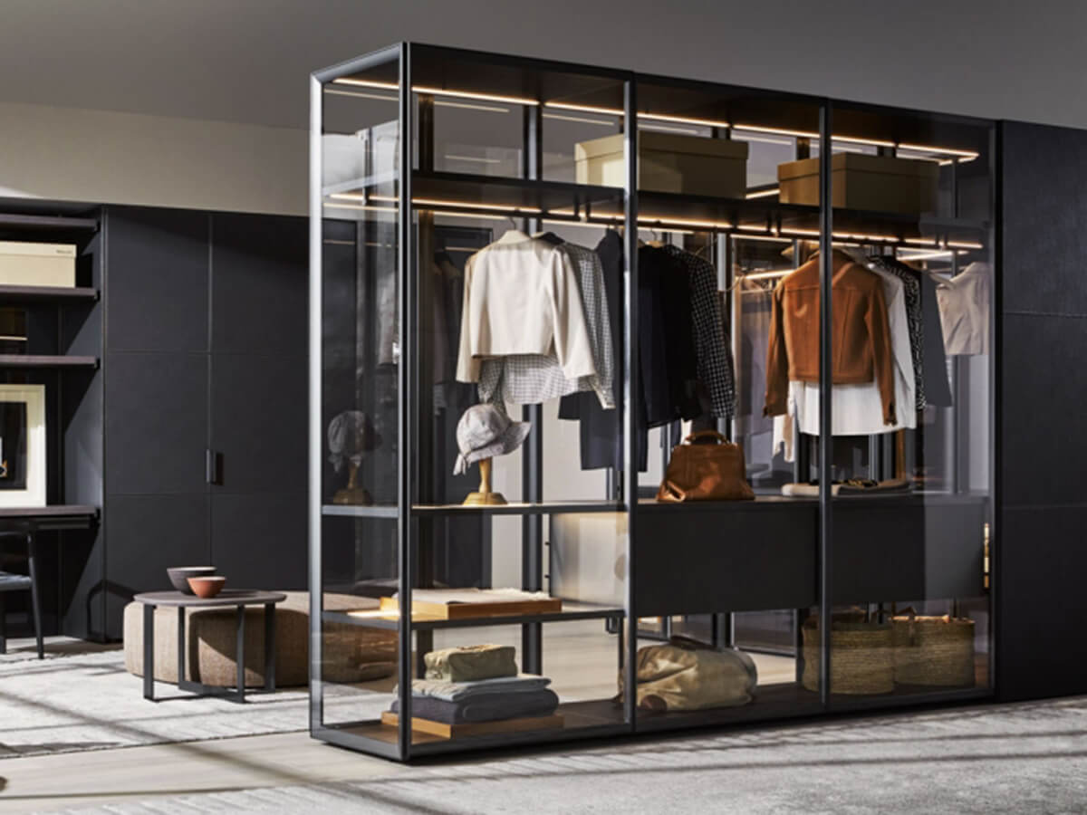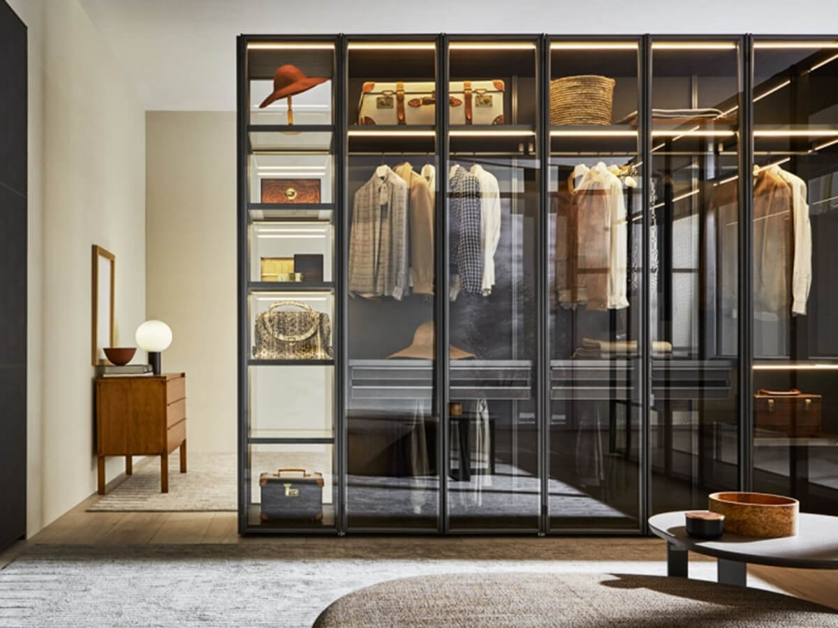 L’armadio Gliss Master rappresenta il fulcro della proposta Molteni & C. per la zona notte: un sistema di armadi che copre la fascia alta di mercato, proponendo finiture pregiate e dettagli costruttivi ricercati, dedicati agli intenditori del design che anche per la zona notte non si vogliono accontentare delle proposte più semplici. L’anta Glass declina questa filosofia in una delle tipologia di armadi più lussuosa e spettacolare: quelli con le ante in vetro. Abiti e altri contenuti dell’armadio risultano contemporaneamente protetti dalla polvere ed esposti alla vista in maniera elegante e ordinata, valorizzati dalla scenografica illuminazione a led opzionale. Questa anta è disponibile unicamente in versione battente, con cerniere che prevedono un’apertura di 180° incassata nella spalla. Può inoltre essere associata a spalle e telaio in vetro, che permettono un uso a centro stanza sfruttando al massimo le sue trasparenze.