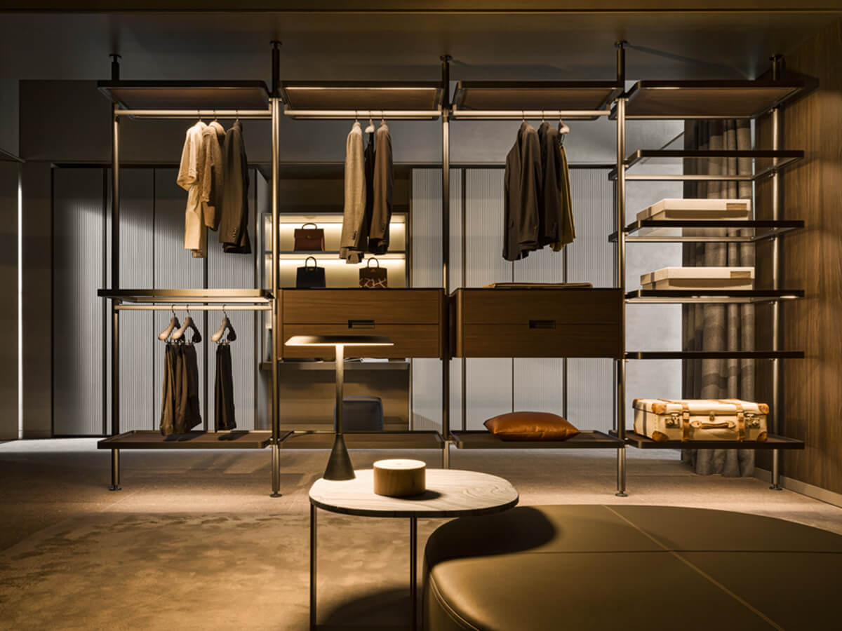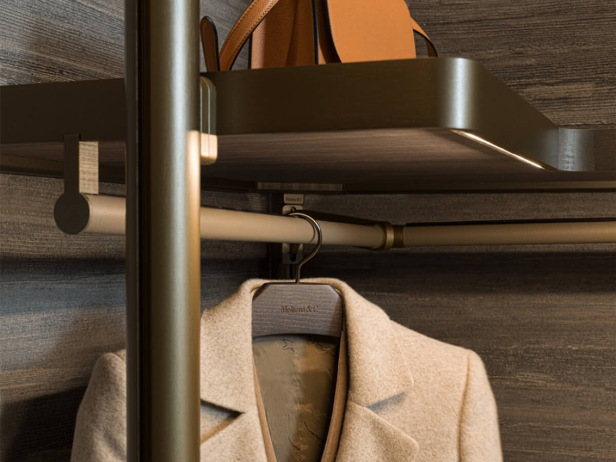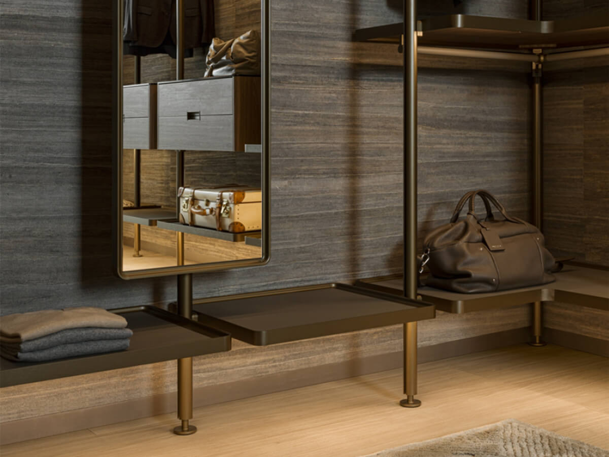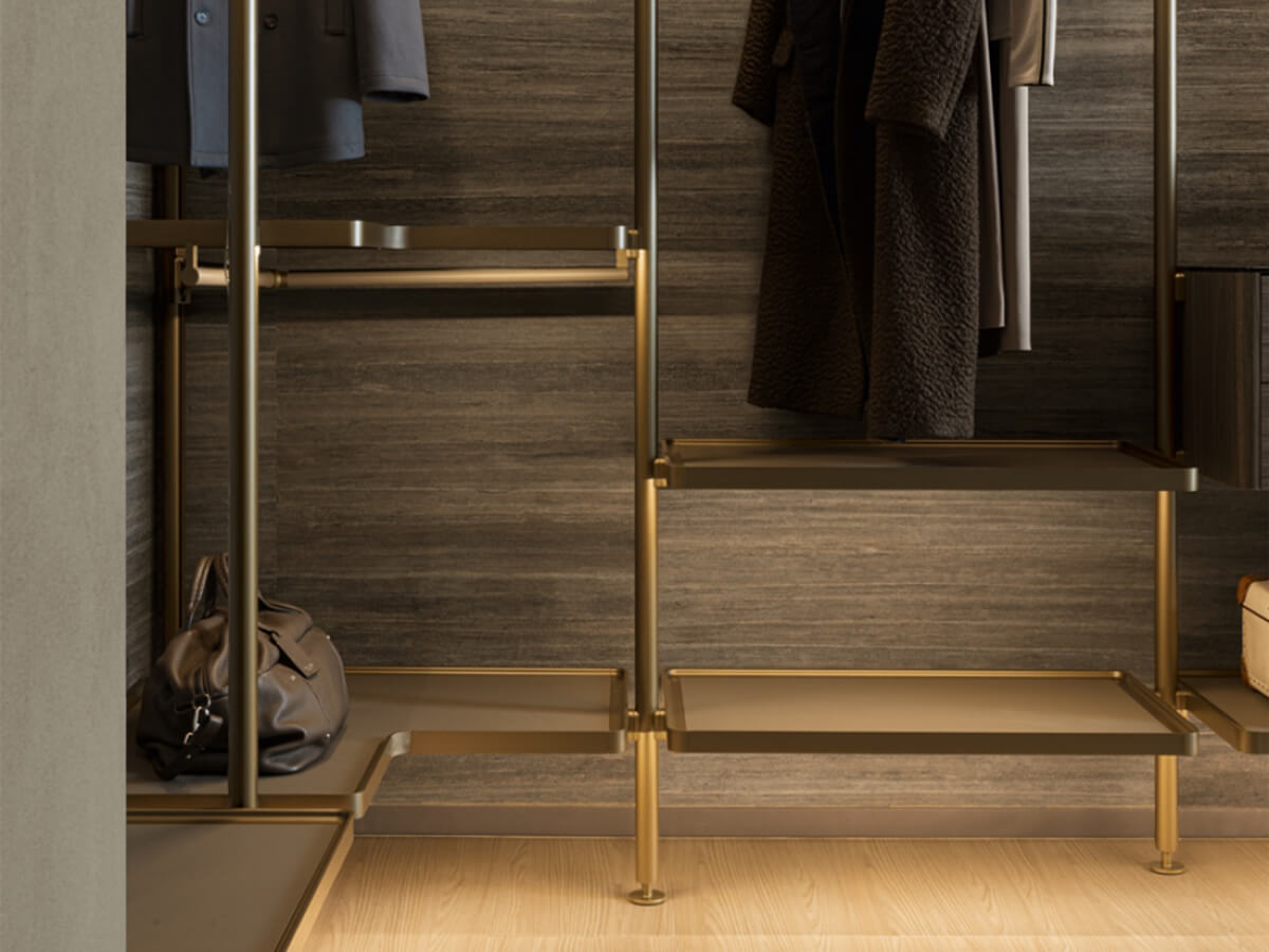 Hector Night è una cabina armadio di lusso dal forte segno espressivo. Grandi protagonisti di questa composizione sono i montanti, che vanno da terra a soffitto e fungono da elemento stilistico caratterizzante, oltre che ricoprire la funzione di ancoraggio per ripiani, cassettiere, specchiere e tutti gli altri elementi dell’attrezzatura. Un sistema rivelatosi di grande successo già come soggiorno e libreria, che si conferma sorprendentemente flessibile ed efficace anche nella zona notte, animando composizioni dedicate a chi non si accontenta di un contenitore neutro per i propri abiti ma è in cerca di un armadio raffinato che sappia con la sua sola presenza valorizzare ed arricchire l’ambiente. La possibilità di illuminare a led i ripiani contribuisce a creare giochi di luce che ne massimizzano l’effetto spettacolare.
