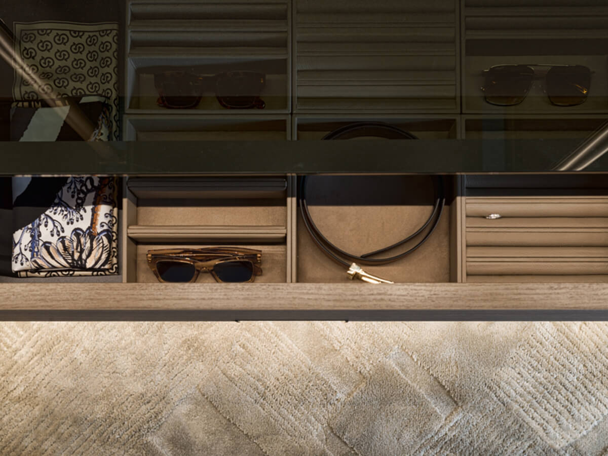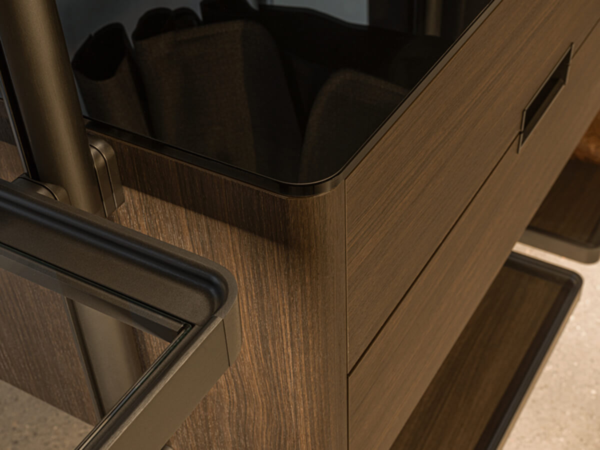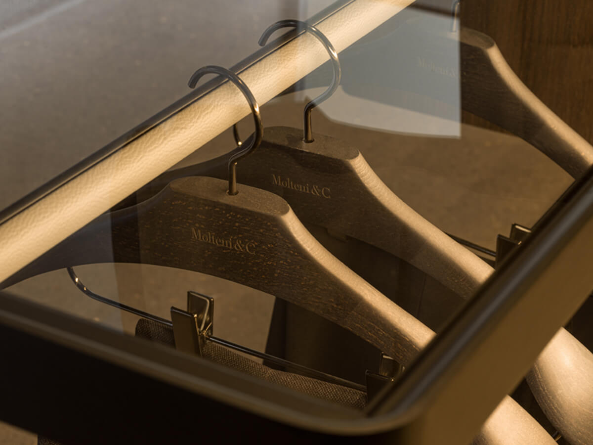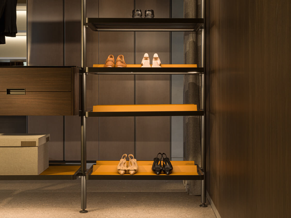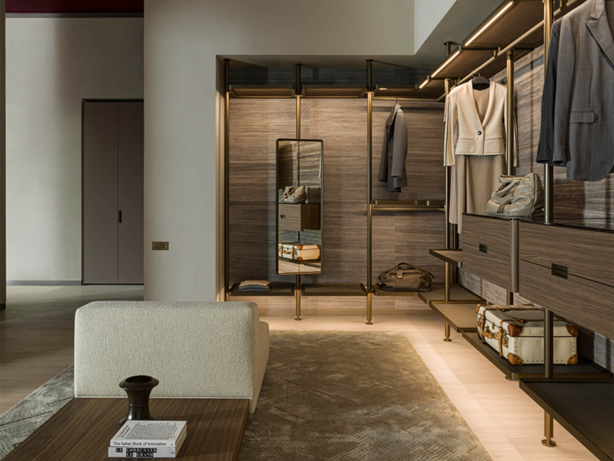 Hector Night è una cabina armadio di lusso dal forte segno espressivo. Grandi protagonisti di questa composizione sono i montanti, che vanno da terra a soffitto e fungono da elemento stilistico caratterizzante, oltre che ricoprire la funzione di ancoraggio per ripiani, cassettiere, specchiere e tutti gli altri elementi dell’attrezzatura. Un sistema rivelatosi di grande successo già come soggiorno e libreria, che si conferma sorprendentemente flessibile ed efficace anche nella zona notte, animando composizioni dedicate a chi non si accontenta di un contenitore neutro per i propri abiti ma è in cerca di un armadio raffinato che sappia con la sua sola presenza valorizzare ed arricchire l’ambiente. La possibilità di illuminare a led i ripiani contribuisce a creare giochi di luce che ne massimizzano l’effetto spettacolare.