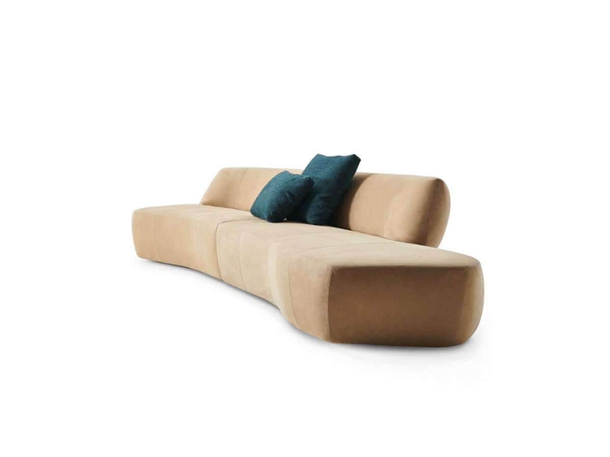 Un sistema componibile che sembra trarre spunto dal mondo dell’hospitality per dar vita a soluzioni comode e di grande linearità, ideale elemento di qualunque spazio living. La seduta è integrata con la base e spicca per le forme gentili e arrotondate dove gli schienali vengono poggiati delicatamente formando angoli avvolgenti e leggermente sporgenti. L’ergonomia che ne deriva è unica e particolarmente gradevole, oltre che visivamente accattivante. L’utilizzo di schiuma poliuretanica rende possibile questo intreccio perfetto di volumi cui si aggiunge la possibilità di scegliere fra elementi rettilinei, chaise longue, ad angolo e terminali parzialmente privi di schienale. La combinazione è non solo elegante, ma particolarmente ingegnosa.