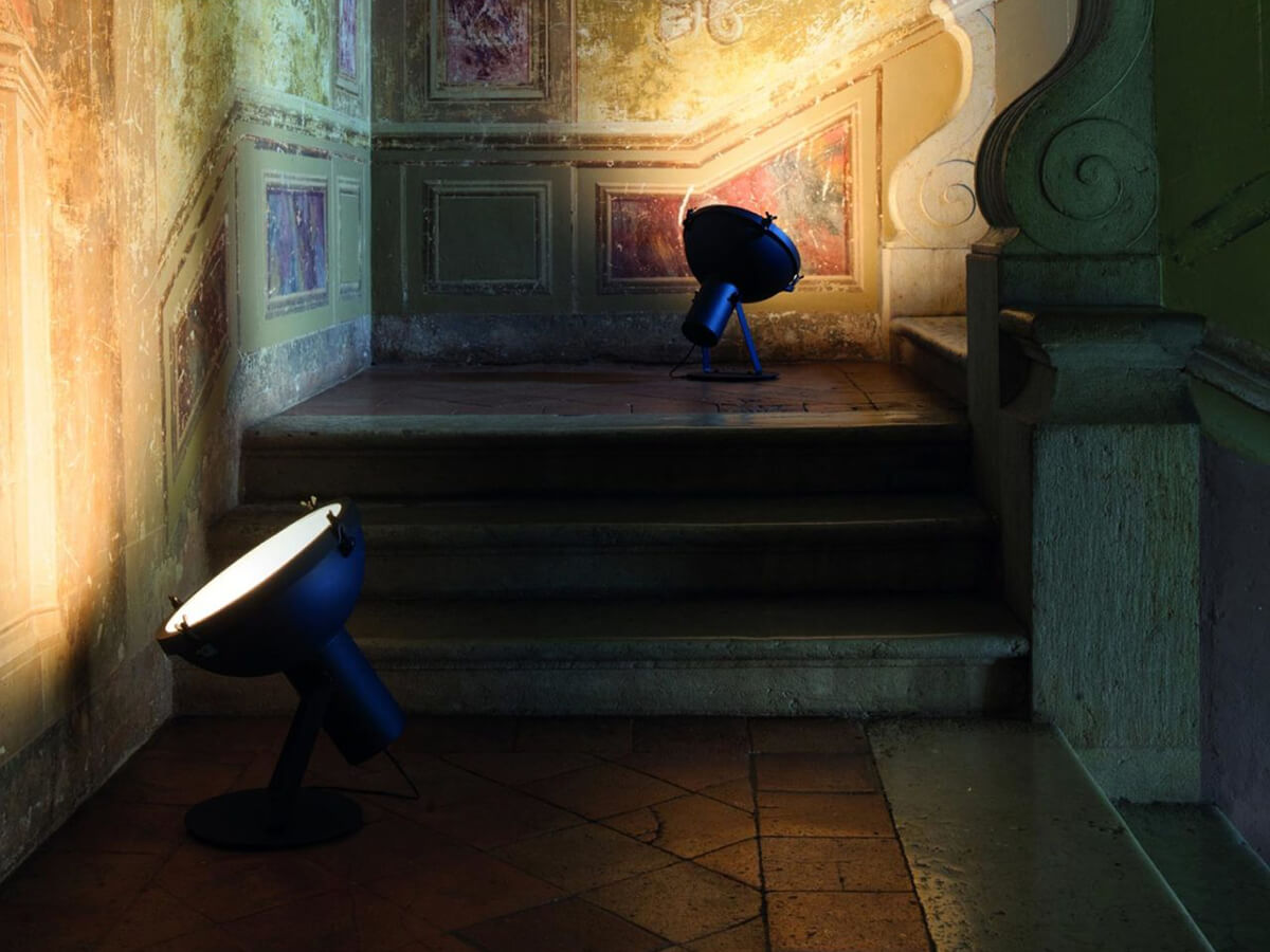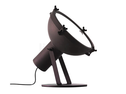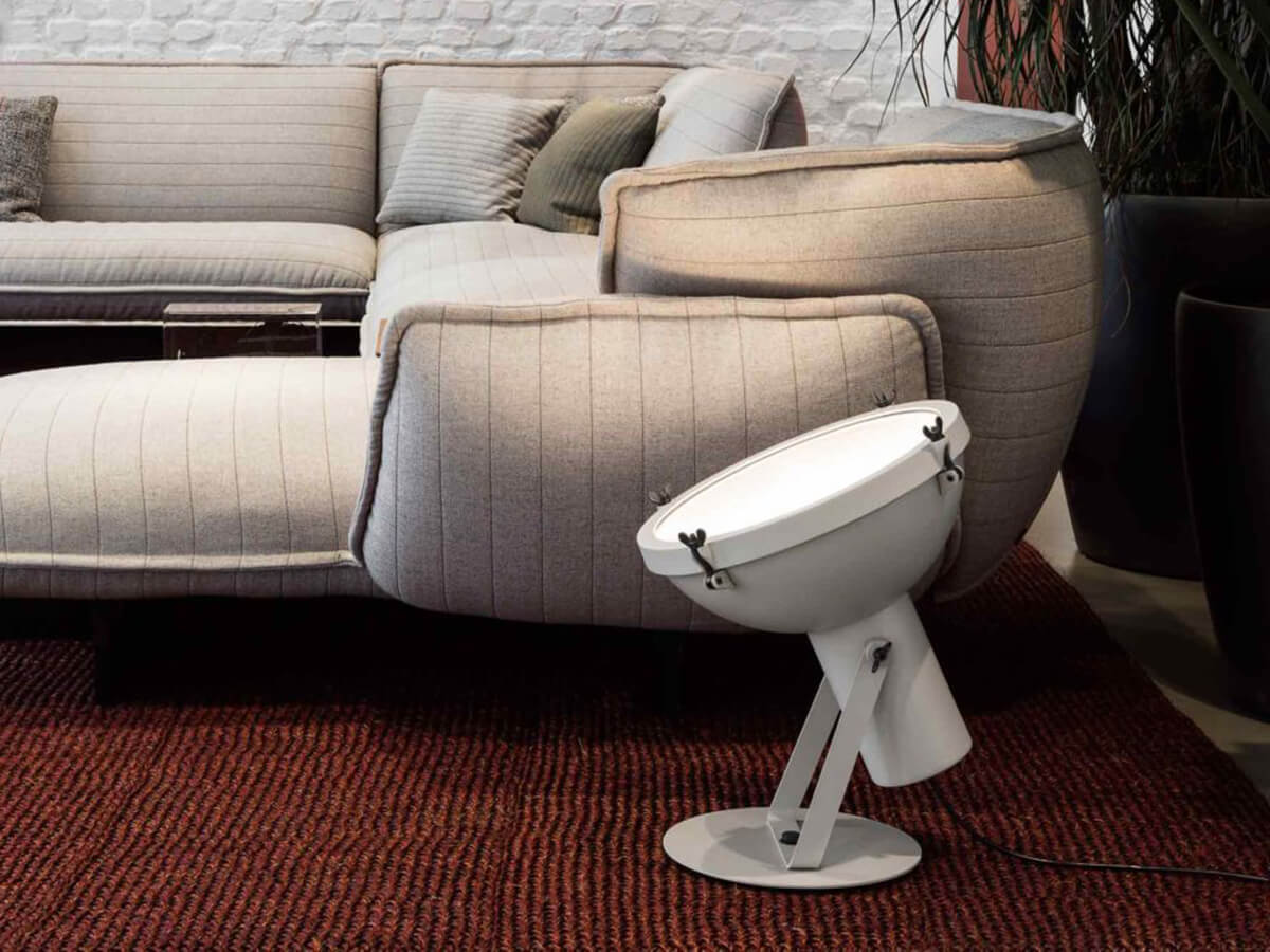 La lampada da terra Projecteur 365 di Nemo venne originariamente disegnata da Le Corbusier per l’Alta Corte di Chandigarh, un progetto passato alla storia dell’architettura, per alcuni vero e proprio opus magnum del grande maestro svizzero che ebbe modo in quell’occasione di cimentarsi con la progettazione di un’intera città. Disponibile anche in versione a sospensione o da parete/soffitto, Projecteur nella sua configurazione da terra assume la forma di un grande faretto poggiato su una base circolare, a sostegno di un diffusore bombato e sabbiato internamente. Sono molto evidenti i gancetti chiusura, enfatizzati per passare da puro elemento funzionale a sobrio complemento decorativo.