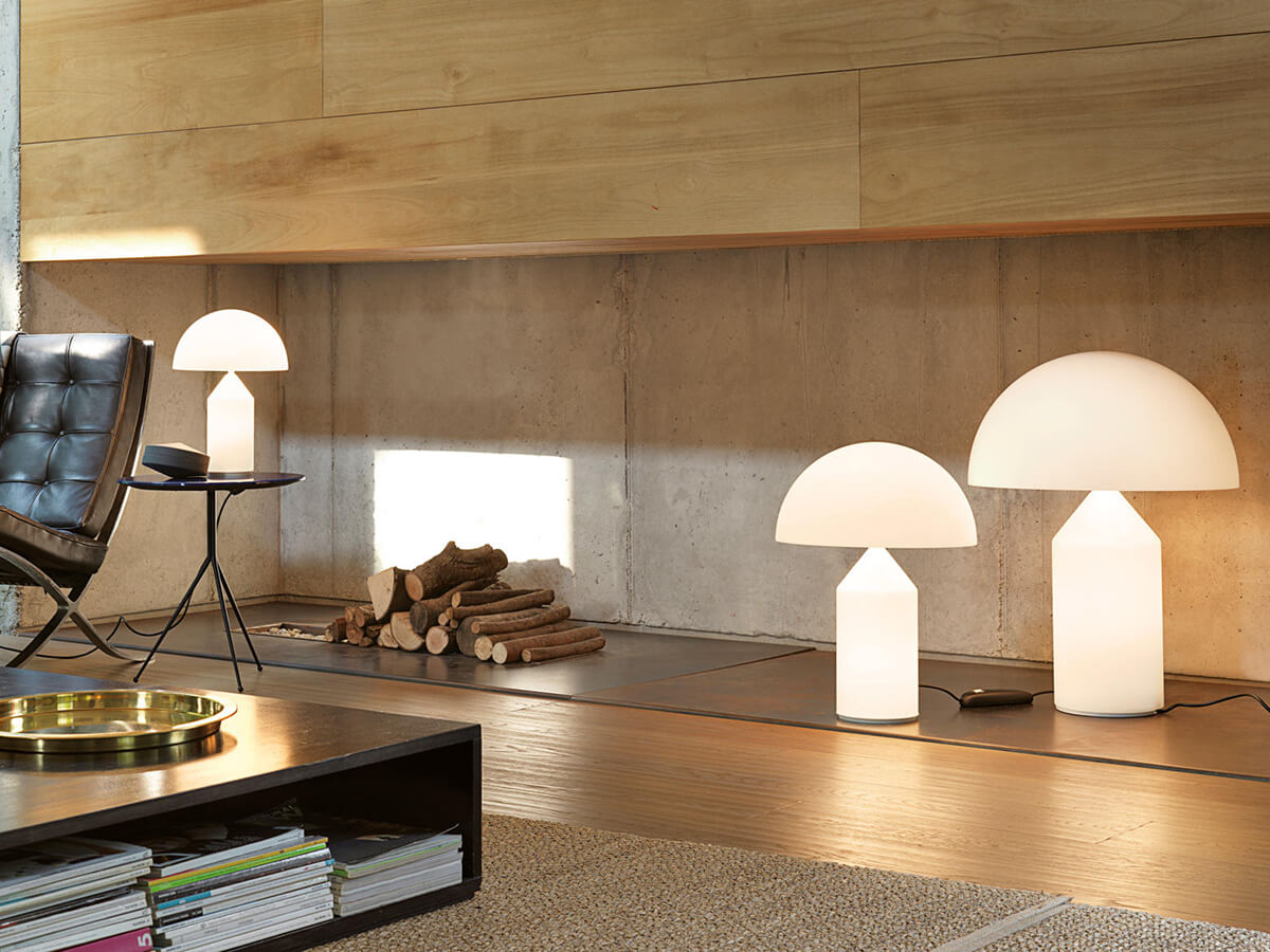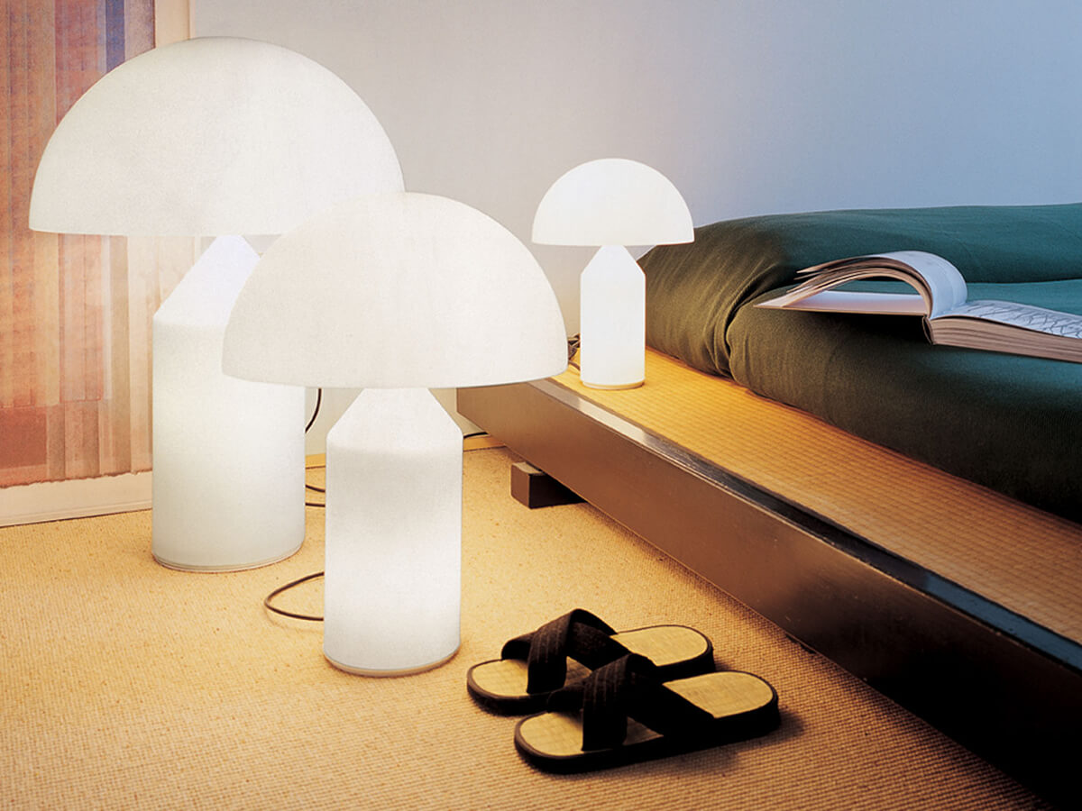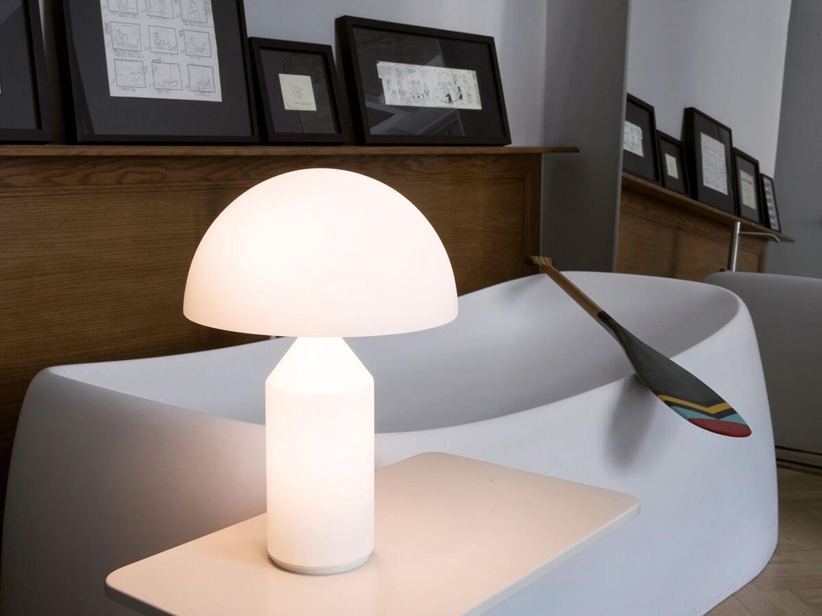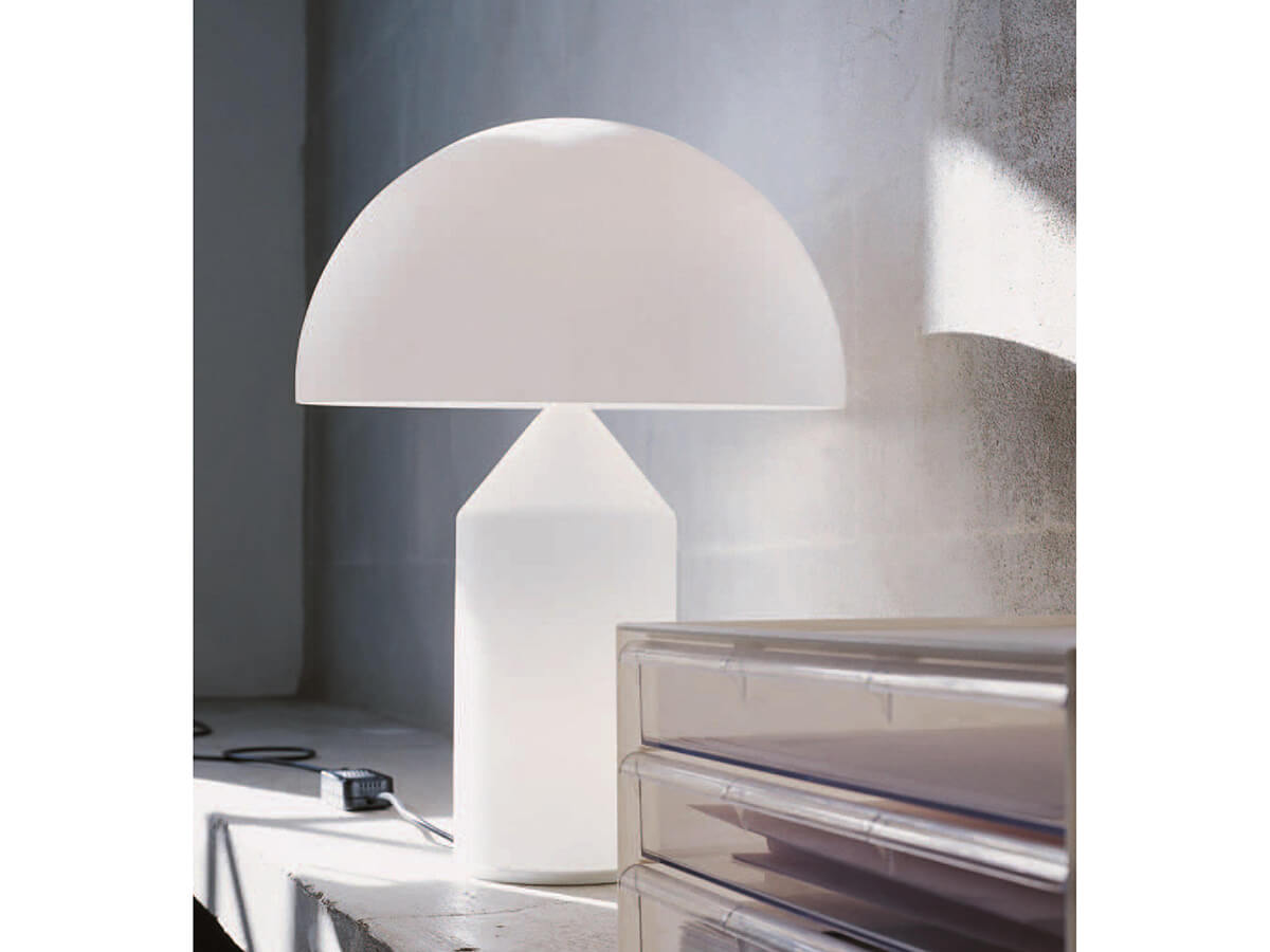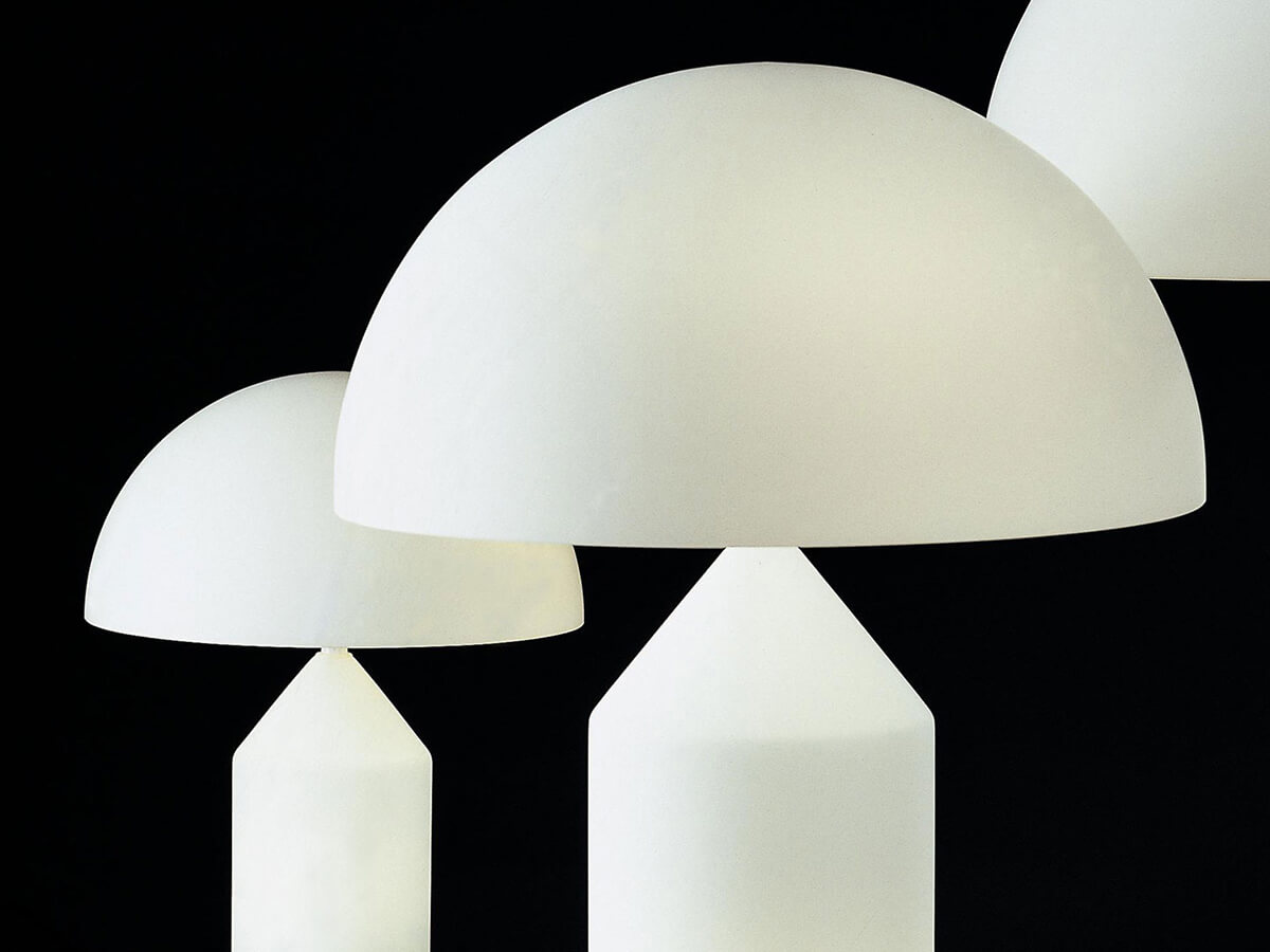 Icona del design contemporaneo, e non solo, Atollo è l’esempio perfetto di uno stile capace di mantenersi inalterato nel tempo. Fin dalla sua creazione avvenuta nel 1977 ha resistito alle mode del tempo divenendo autentico archetipo della lampada da tavolo. Vincitrice del compasso d’oro nel 1979, oggi continua ad arredare case e ambienti di tutto il mondo. Le forme geometriche che la compongono, cilindro, cono e semisfera, hanno dato vita a un prodotto decorativo ed essenziale allo stesso tempo, slegato dal periodo storico dalle mode del momento e divenuto oramai un caposaldo dello stile di qualunque tempo. Atollo è disponibile in diverse dimensioni e finiture fra cui metallo bianco, nero, bronzo satinato e oro satinato.