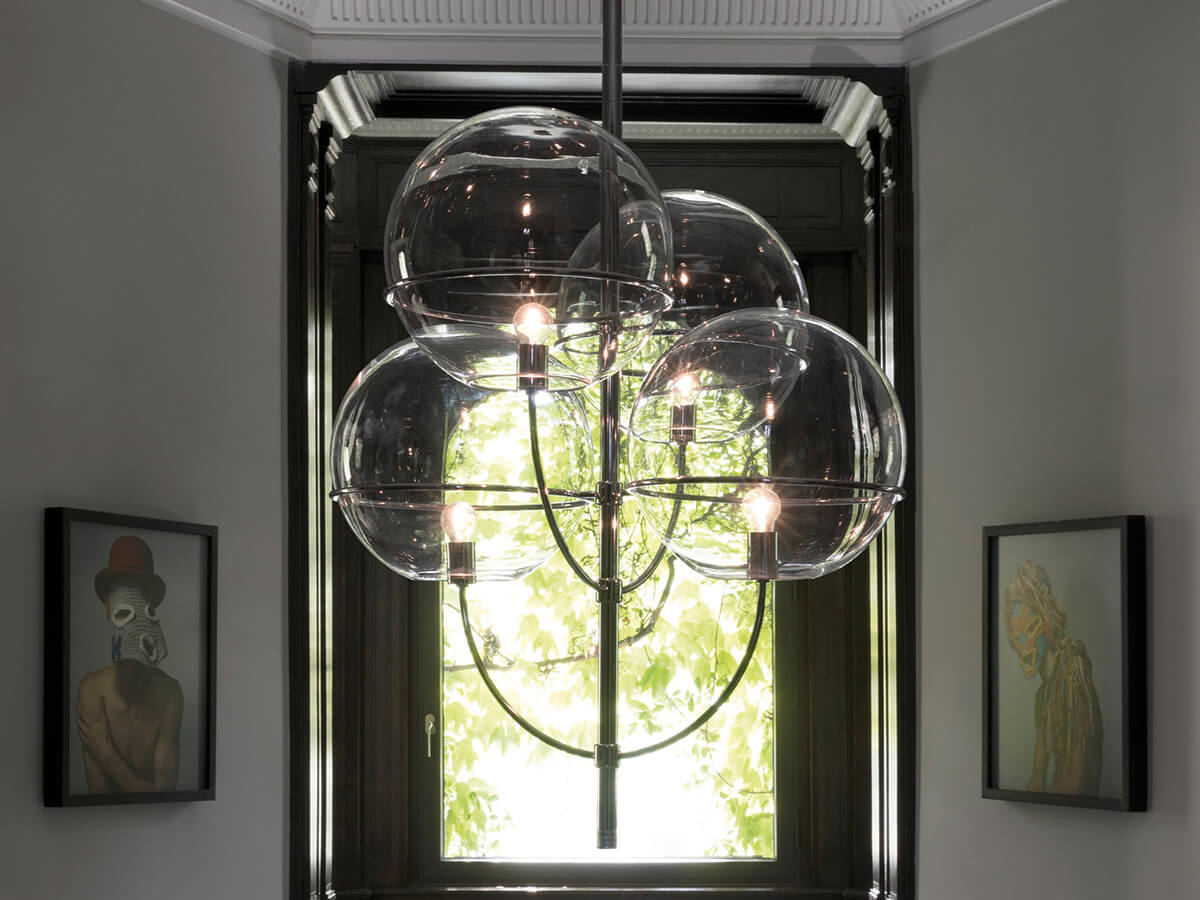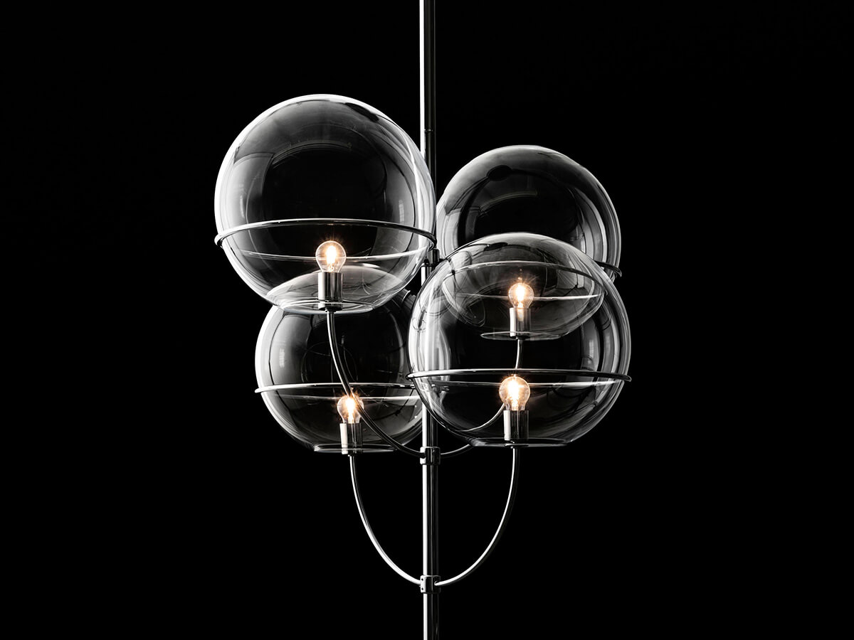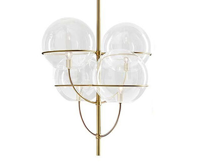 La lampada a sospensione Lyndon di Oluce riporta subito alla mente grandi suggestioni da Belle Époque: lunghi viali alberati illuminati a gas, serate danzanti rischiarate da preziosi chandelier, la vivace folla che riempie i caffè piena di speranze per il futuro. Lyndon, con le forme che sono in fondo la trasognata citazione di un passato forse immaginario, è in realtà più recente: è stata disegnata infatti da Vico Magistretti nel 1977. È costituita da quattro sfere in vetro trasparente che ospitano ciascuna una piccola lampadina, sostenute da una sinuosa struttura metallica disponibile sia cromata che in finitura oro satinato.
