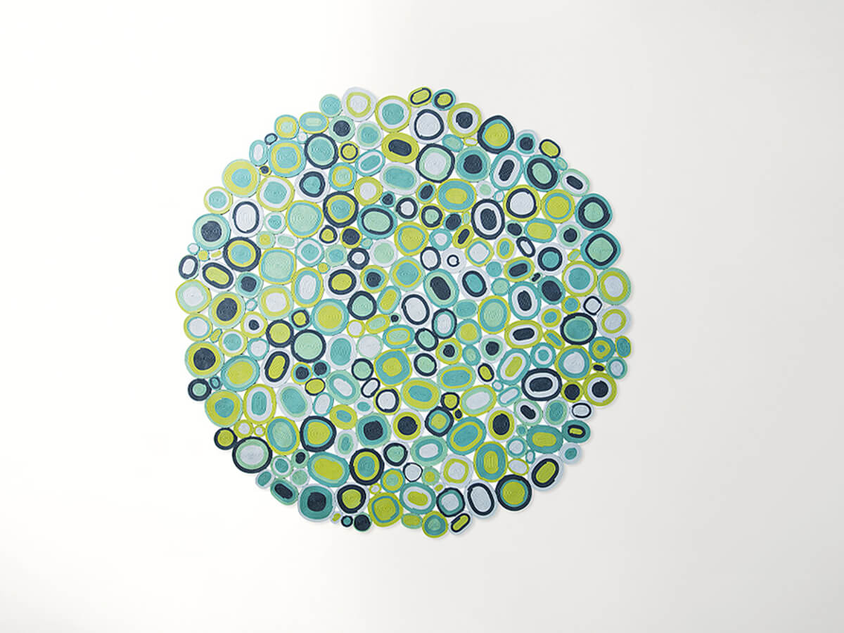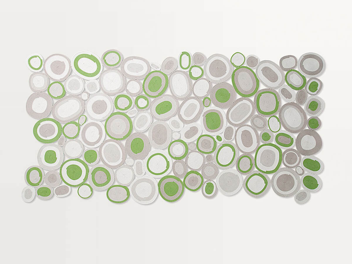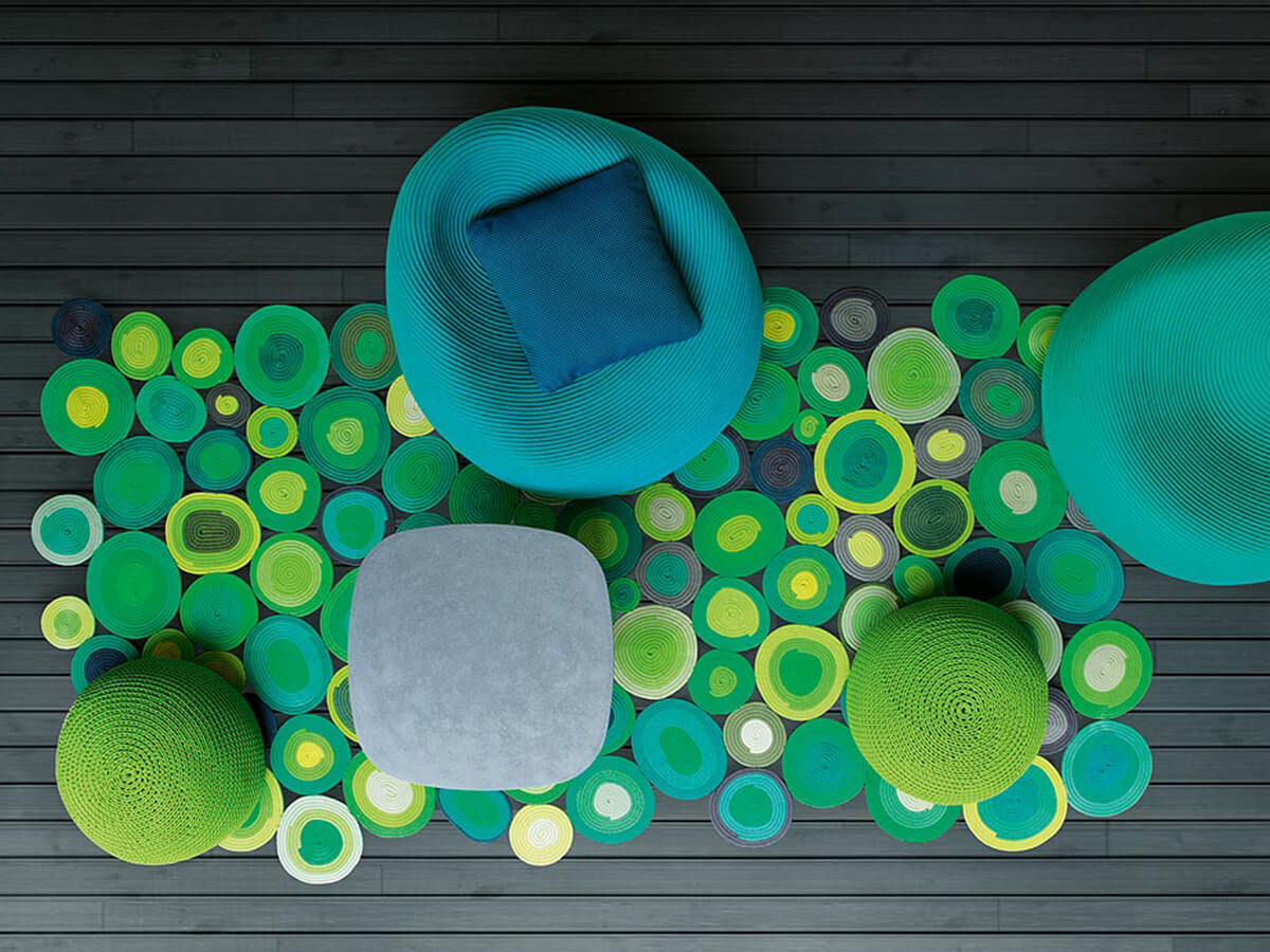 Colore ed espressione si incontrano dando vita a un oggetto a cavallo fra arte, design e pura immaginazione. Ellissi è un tappeto per esterni e interni, realizzati dall’unione di singoli elementi prodotti con corde tinta unita o bicolore. L’effetto è quello di camminare su un sentiero di ciottoli o un quadro impressionista. Le corde sono sagomate e cucite a mano per formare elementi decorativi tondi e ovali. Ogni elemento viene poi unito agli altri con uno schema libero per formare superfici di diverse dimensioni. Attraverso gli spazi lasciati liberi si può notare il pavimento in un pregevole effetto di sovrapposizione. Si possono scegliere più colori per poter creare spunti unici e personalizzati. Caratteristiche tecniche: composizione in Corda Rope in 100% poliolefine