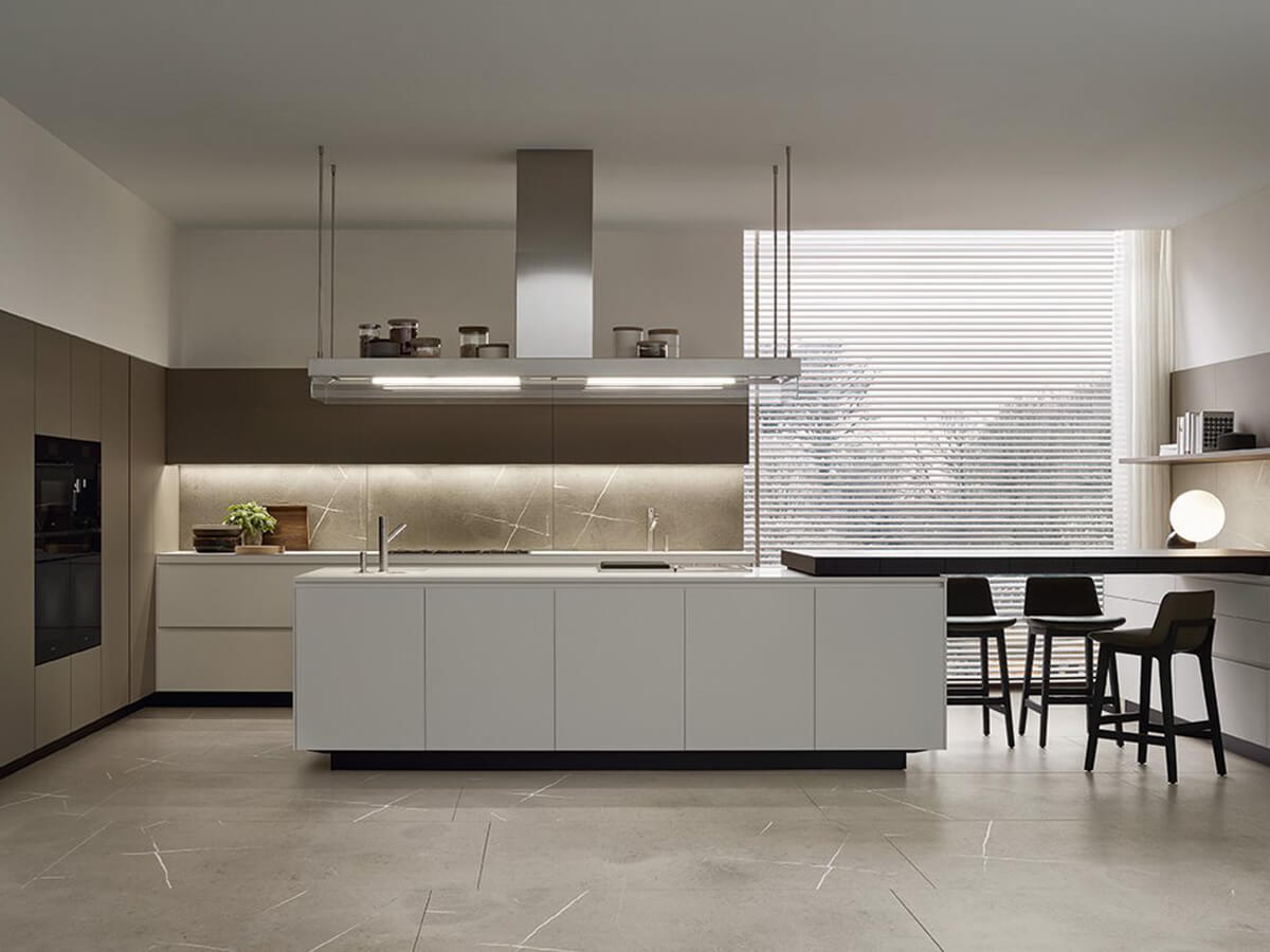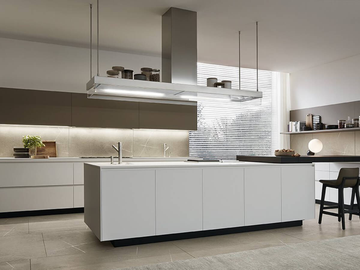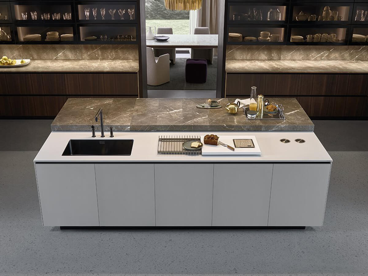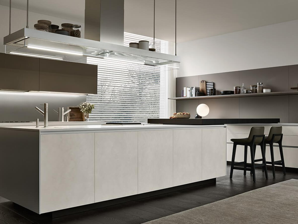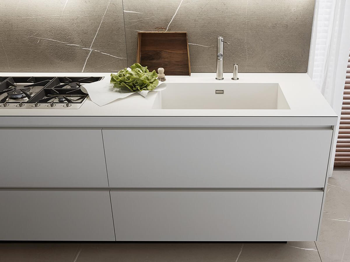 La cucina Alea è il modello più versatile fra quelli disponibili nel catalogo Poliform. Di grande flessibilità compositiva, può essere utilizzato per realizzare ambenti cucina per ogni genere ed esigenza, dalle semplici cucine di servizio in laminato a lussuose composizioni valorizzate da materiali preziosi come marmo o acciaio.Dallo stile solido e minimalista, si caratterizza per l’assenza di maniglie e per le essenziali aperture a gola delle sue ante, rigorosamente squadrate a 90°. Una cucina moderna dall’aspetto pulito, tutta giocata sulle forme primarie, perfetta per gli amanti del design.