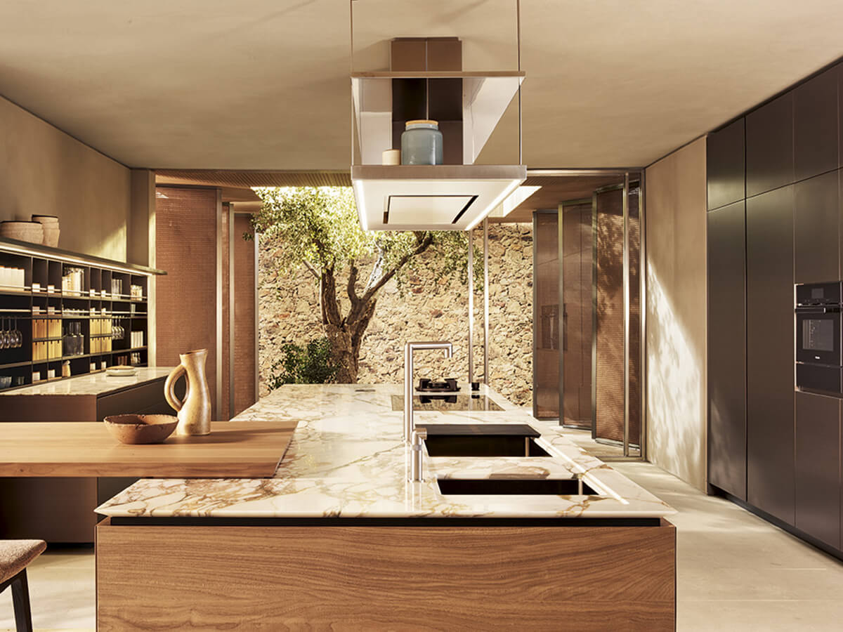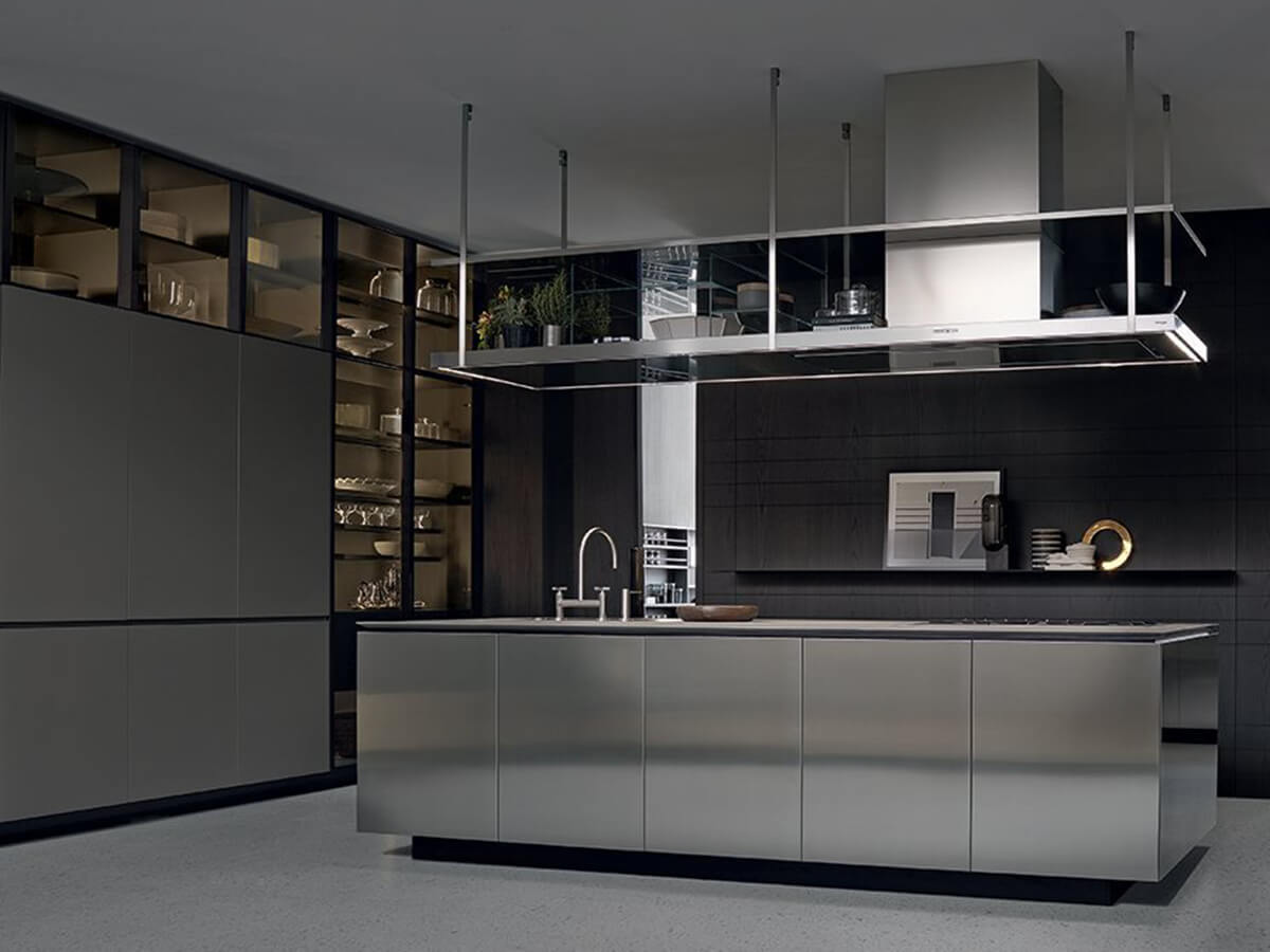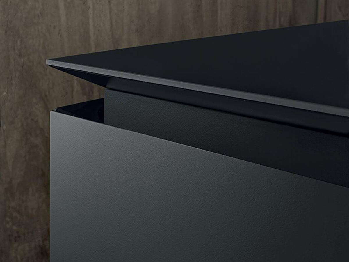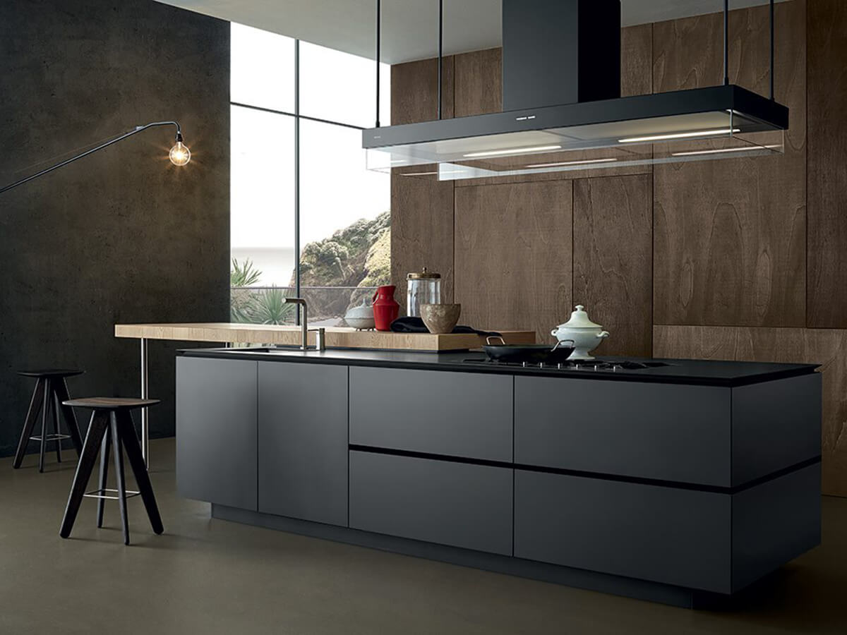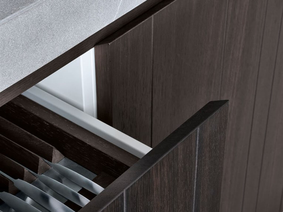 La cucina Artex è uno dei modelli più scultorei disponibili nell’offerta di cucine Poliform. Le ante, valorizzate da ampi spessori, presentano un’apertura a gole senza maniglie, con una lavorazione obliqua che corre lungo tutto il piano superiore dell’anta. Anche il piano può essere proposto con uno smusso che richiama quello dell’anta, in un gioco di volumi e vuoti di raffinata eleganza.Una caratteristica costruttiva peculiare di Artex è la possibilità di realizzare isole o penisole in cui la gola corre lungo tutto lo spessore del piano, senza interrompersi negli angoli, dando vita a monoliti dal forte valore plastico.