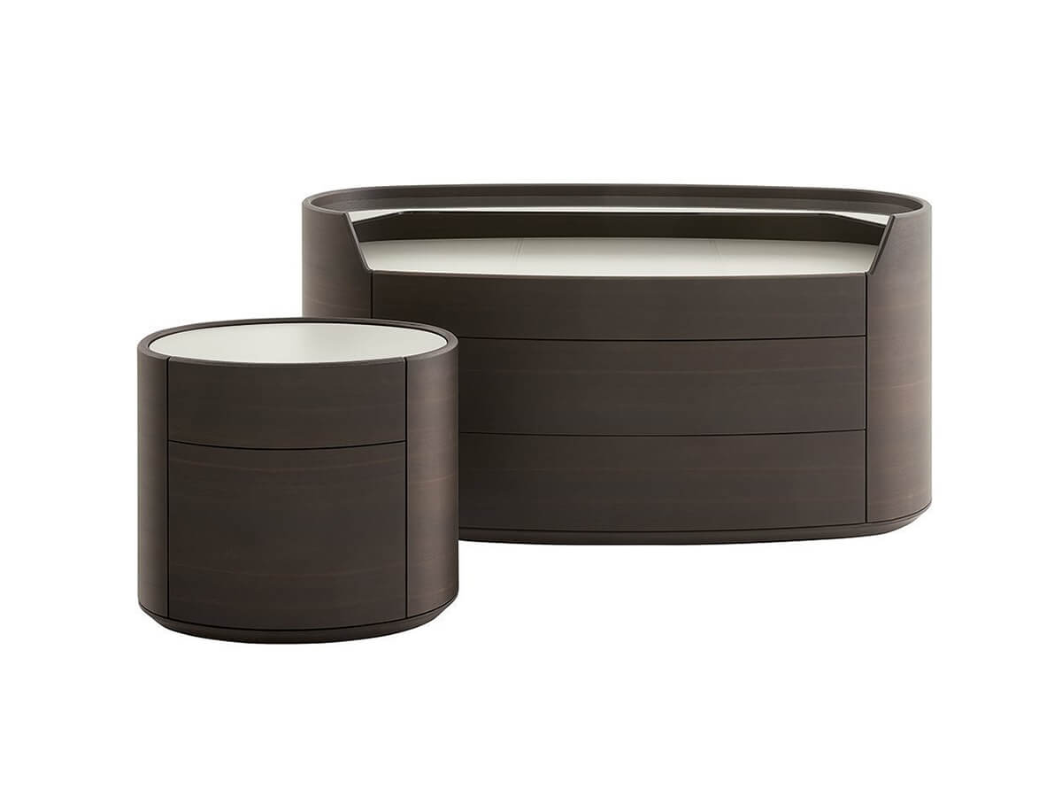 Emmanuel Gallina disegna un assortito numero di contenitori per la zona notte, spaziando fra diverse dimensioni, forme, finiture e superfici di estremo gusto. Sperimentazione e artigianalità si fondono qui in un tutt’uno, dando vita a opere capace di rispondere alle più diverse esigenze dell’abitare. La collezione Kelly comprende numerosi comodini, comò, cassettoni e tipologie di contenitori connotati da solide strutture in pannelli di particelle di legno impiallacciato intrecciate e preziosi top in cuoio, marmo e altro ancora. Nulla viene lasciato al caso per garantire praticità e durabilità nel tempo al netto di una quotidianità contemporanea. Nelle numerose varianti disponibili, Poliform garantisce la personalizzazione di ogni proposta. *Caratteristiche tecniche: la cassettiera è disponibile anche in versione con mensola superiore in vetro fumé