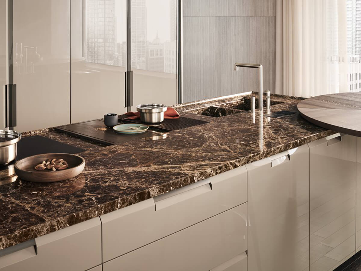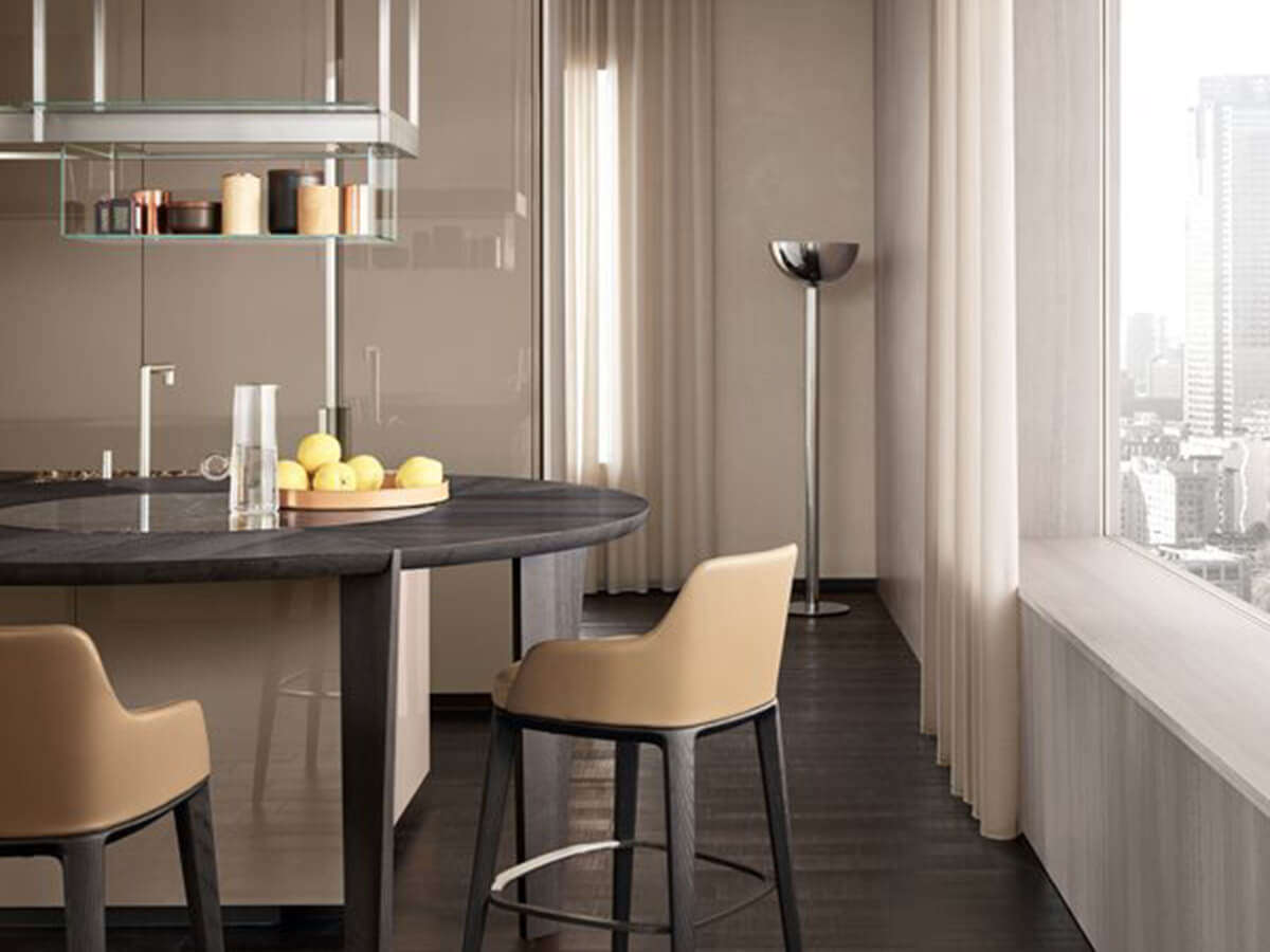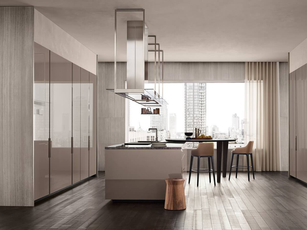 Shape è una cucina di lusso, dalle forme decise e ricercate, fortemente connotate dalla modanatura che percorre tutte le basi e le colonne e che dona alle composizioni un aspetto audace e caratteristica. La maniglia è inserita ad incasso nel taglio delle ante ed è impreziosita da preziosi dettagli in metallo.Shape è un modello che si presta a composizioni pregiate e di ampio respiro, in cui l’isola centrale sia accompagnata da un elegante piano snack, spiccando per la sua capacità di donare carattere ed espressività a tutto l’ambiente.