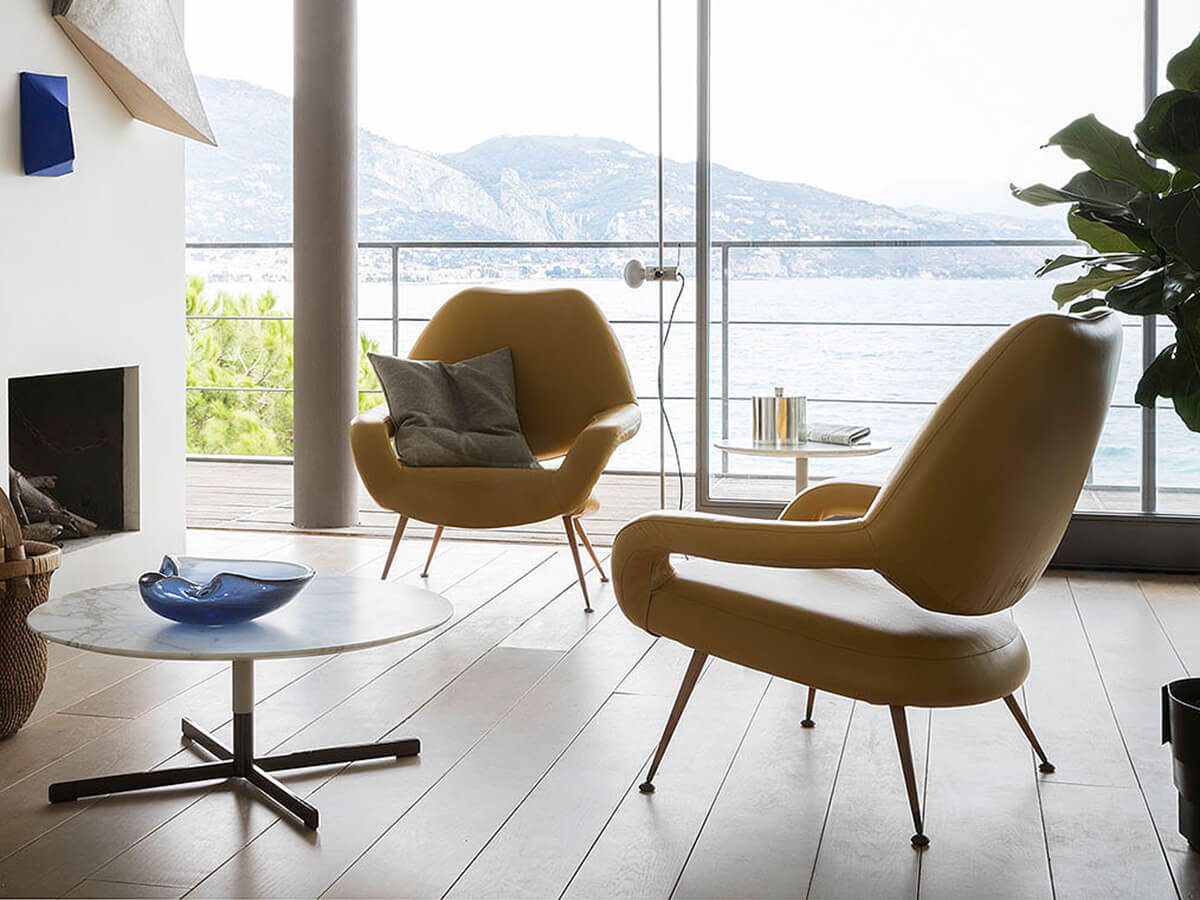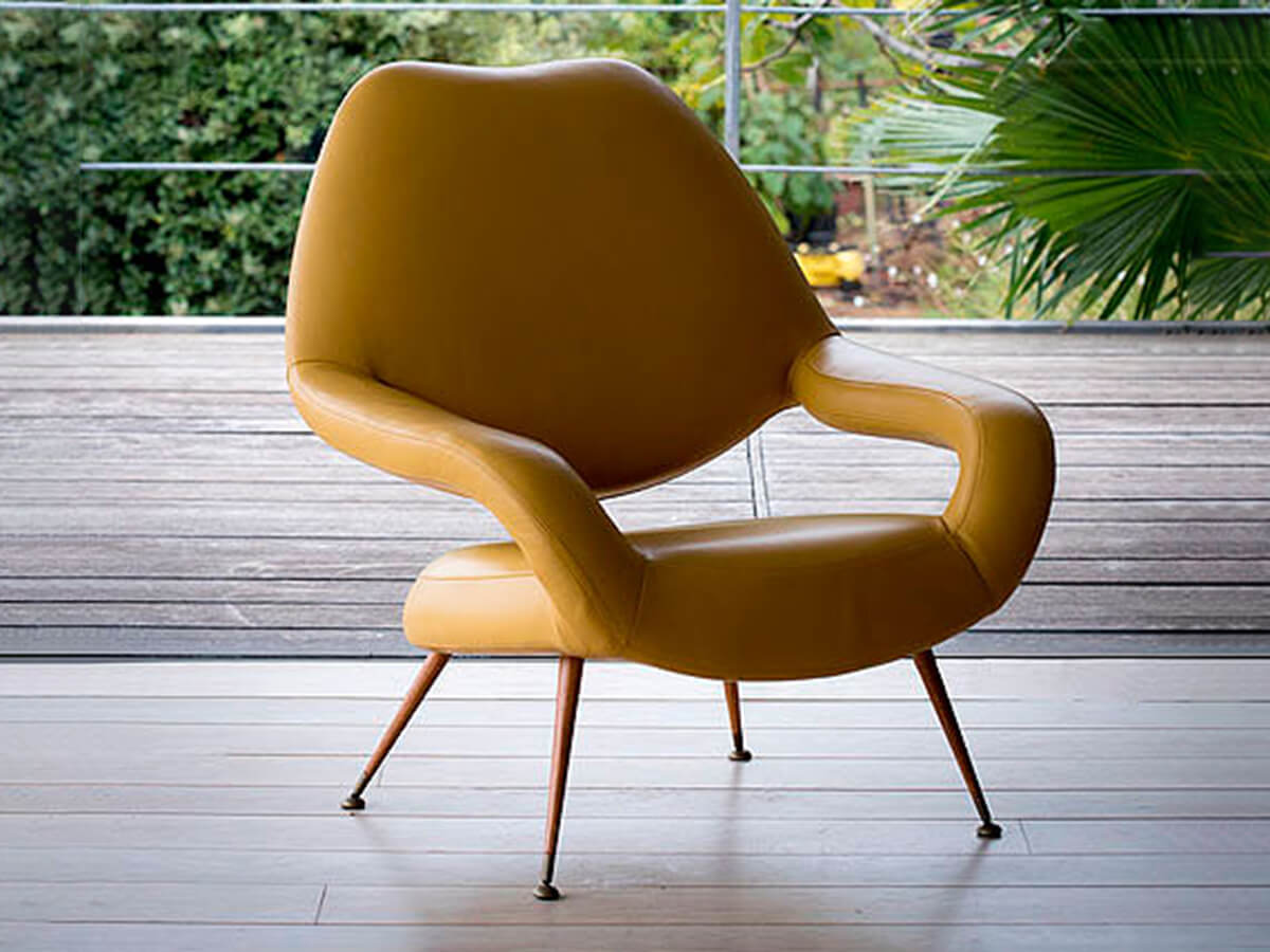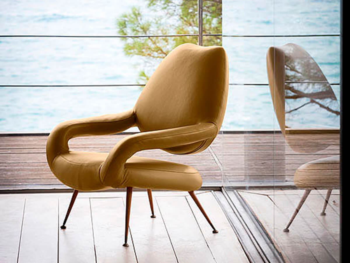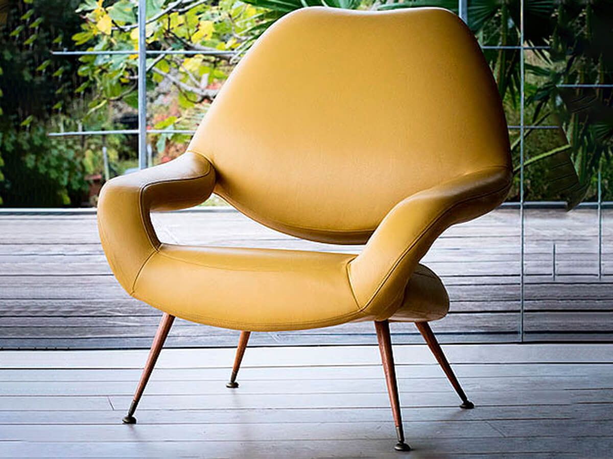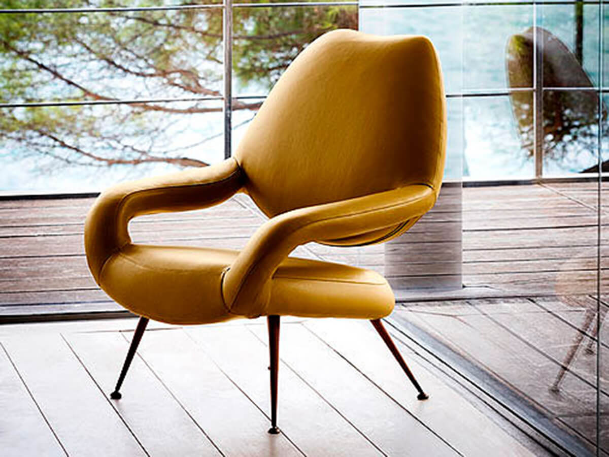 Una poltrona dalle forme arrotondate e accoglienti, capace di attrarre grazie al proprio design sofisticato e spessori fuori dal comune. Gastone Rinaldi disegna Du55 nel 1954, conferendole coerenza formale, originalità e un tocco di personalità ancora oggi impossibile da non notare. La rotondità della scocca e lo slancio dei piedini offrono stabilità e comfort, rendendo la seduta particolarmente accogliente. La struttura è in acciaio con imbottitura in poliuretano espanso. Il molleggio della seduta e dello schienale sono ottenuti con cinghie elastiche. I numerosi rivestimenti di questa poltrona offrono massima personalizzazione, rendendola adatta a qualsiasi ambiente a seconda del gusto o delle necessità.