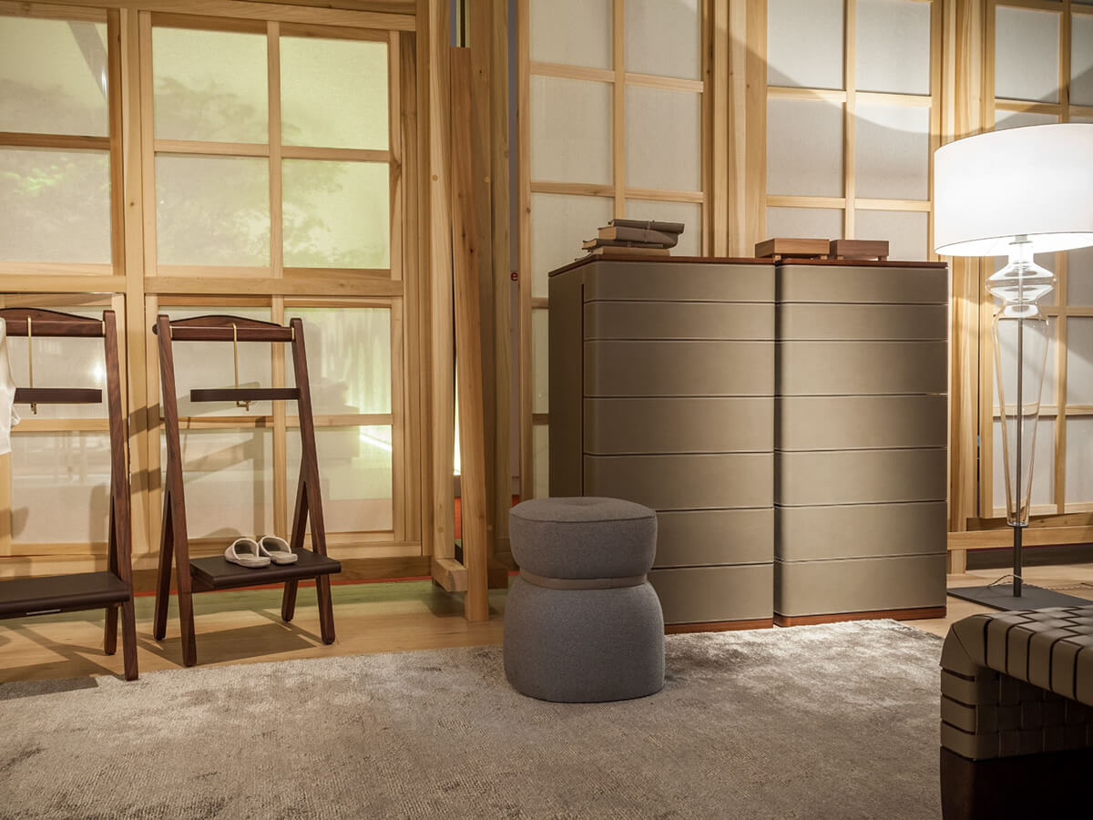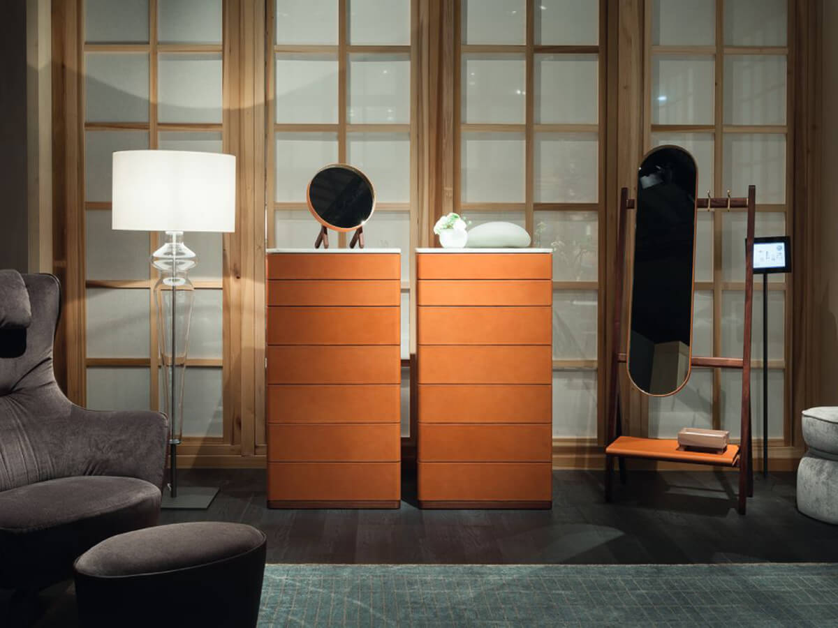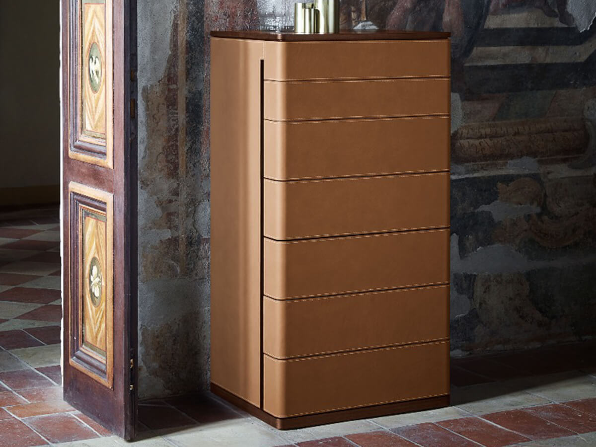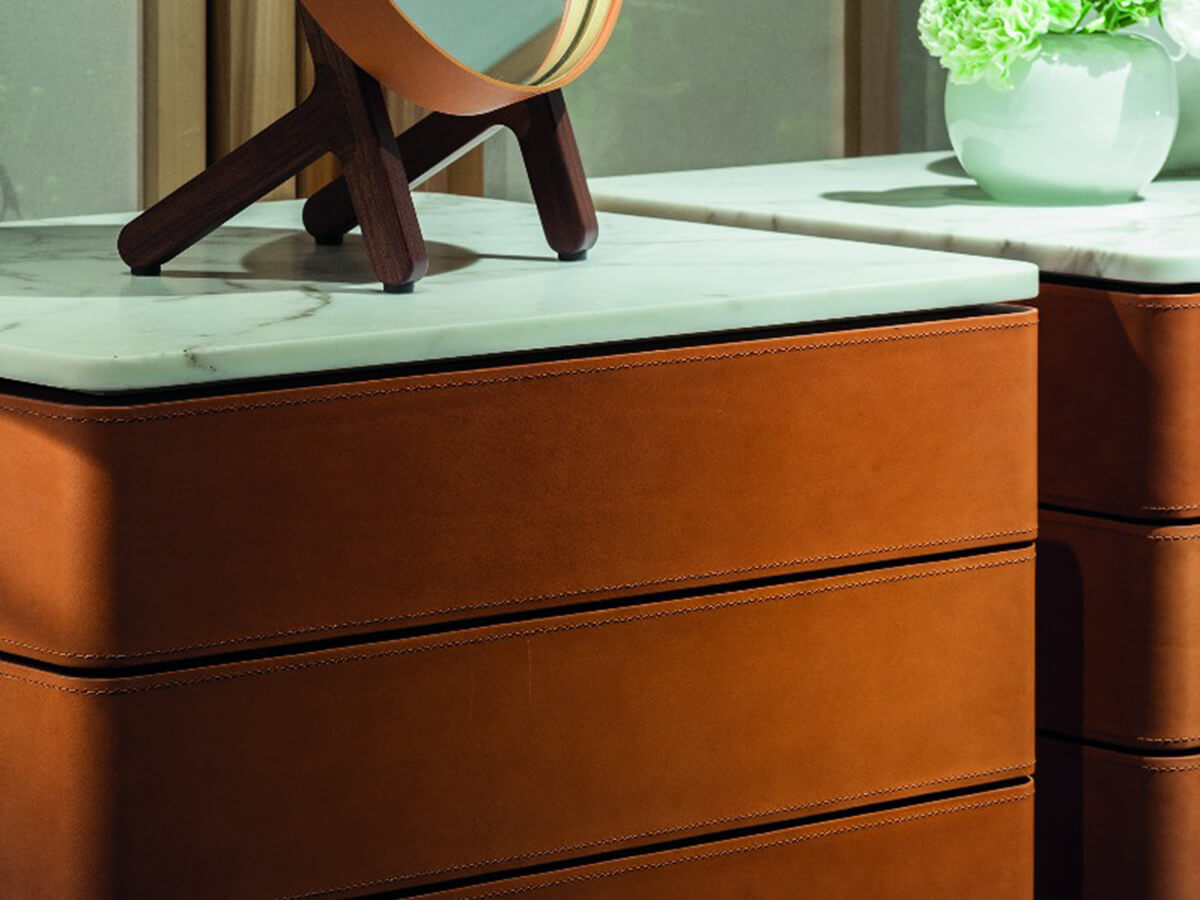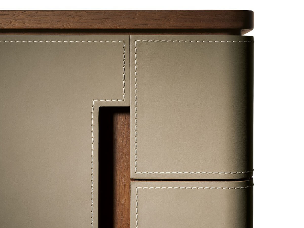 La cassettiera Fidelio Notte è l’elemento d’arredo ideale per la zona notte, complemento perfetto per chi desideri riporre nella camera da letto i propri effetti personali e oggetti di uso quotidiano. Il design di Fidelio spicca per il suo carattere asciutto e l’utilizzo di materiali preziosi. Roberto Lazzeroni sceglie dettagli funzionali per creare elementi estetici di grande personalità, come le maniglie a gola che segnano graficamente le superficie, creando elementi visivi di estrema eleganza. La struttura portante è in legno, quella esterna dei cassetti e i fianchi sono rivestiti in cuoio con cuciture tono su tono. A richiesta è possibile creare elementi di personalizzazione. *Caratteristiche tecniche: cuciture disponibili tono su tono oppure a contrasto; interno contenitori in acero naturale extrachiaro