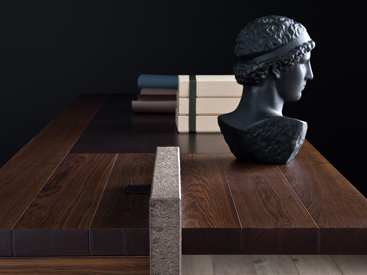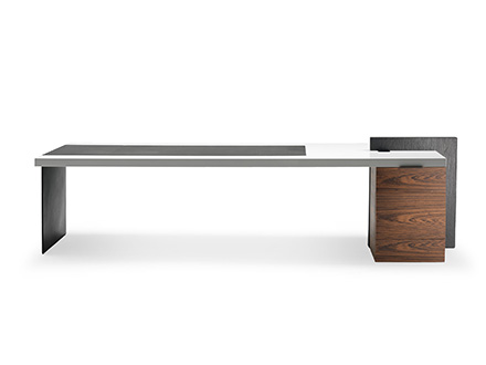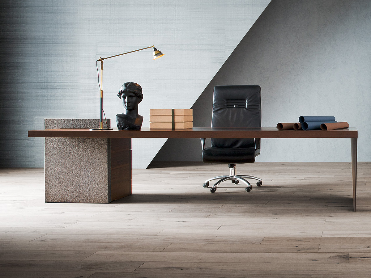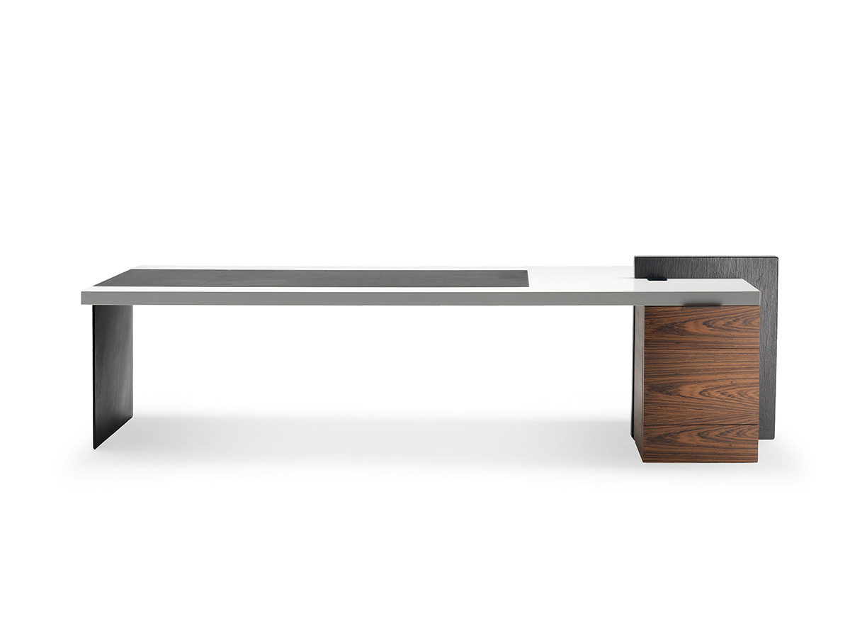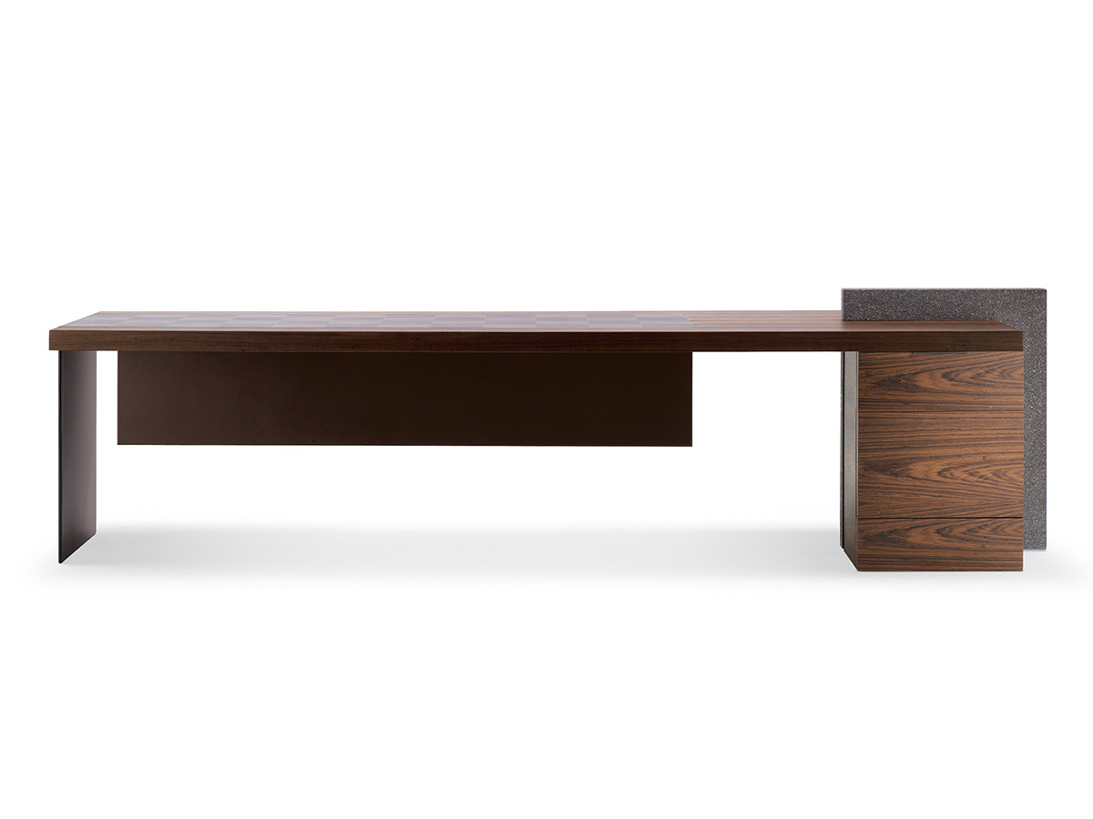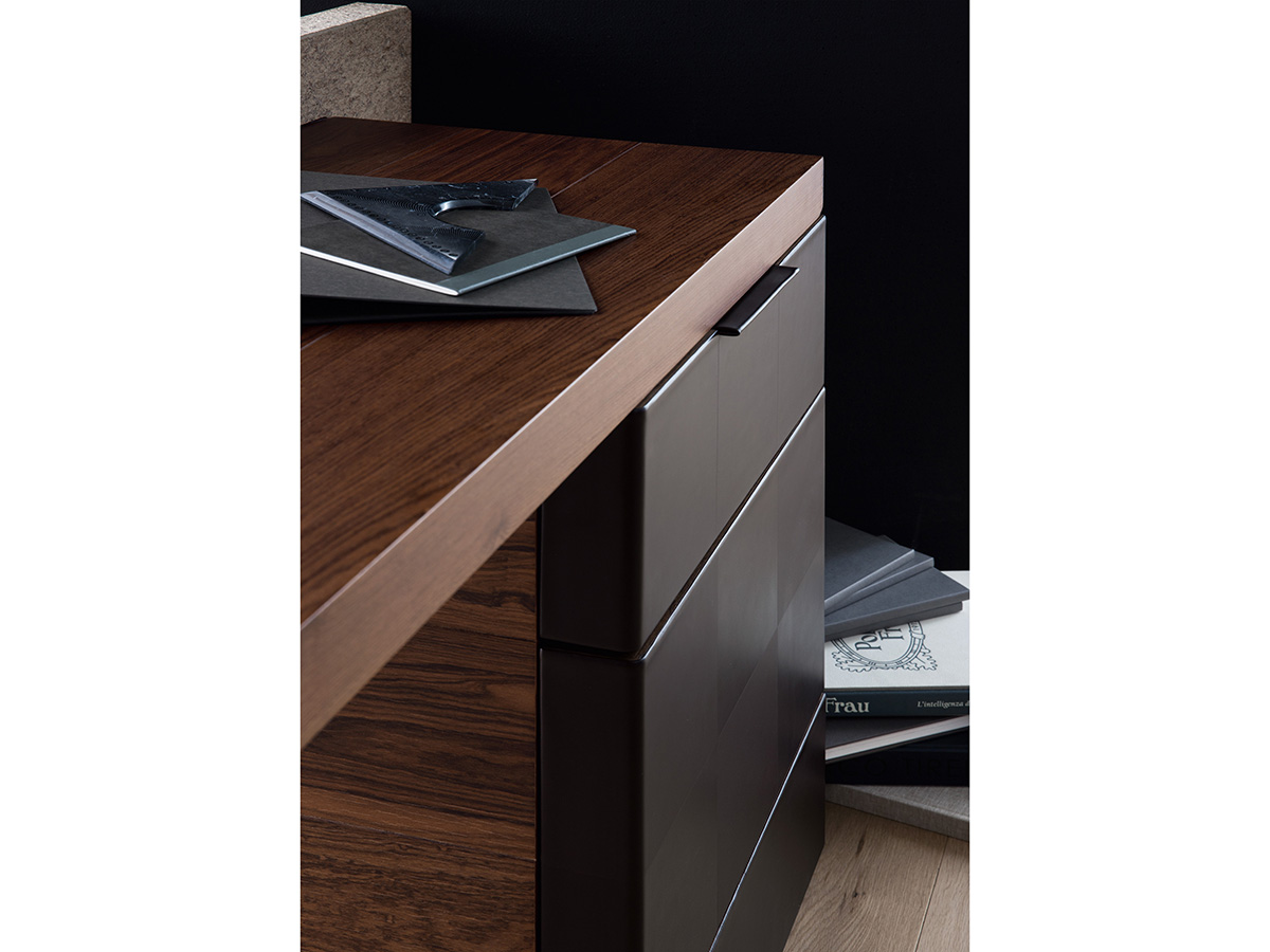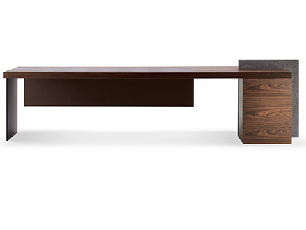 Una scrivania dal taglio deciso, realizzata da Poltrona Frau in collaborazione con Claudio Silvestrin. H_O presenta nella parte superiore un piano con fughe che delimitano la lavorazione a doghe artigianali. Il sottomano, realizzato con pannello in MDF, è rivestito in cuoio Saddle. La gamba è in metallo rivestito in cuoio abbinato al sottomano e ai frontali della cassettiera. Nel suo complesso questa scrivania si presenta con forme geometriche e lineari particolarmente asciutte, ideali per chi sia alla ricerca di un modello sobrio da ufficio o reception. Interessanti l’innesto di pelle e legno che insieme creano un connubio particolarmente elegante e definito, perfetto per chi desideri distinguersi anche in questi campi dell’arredo.