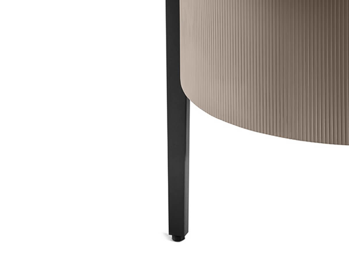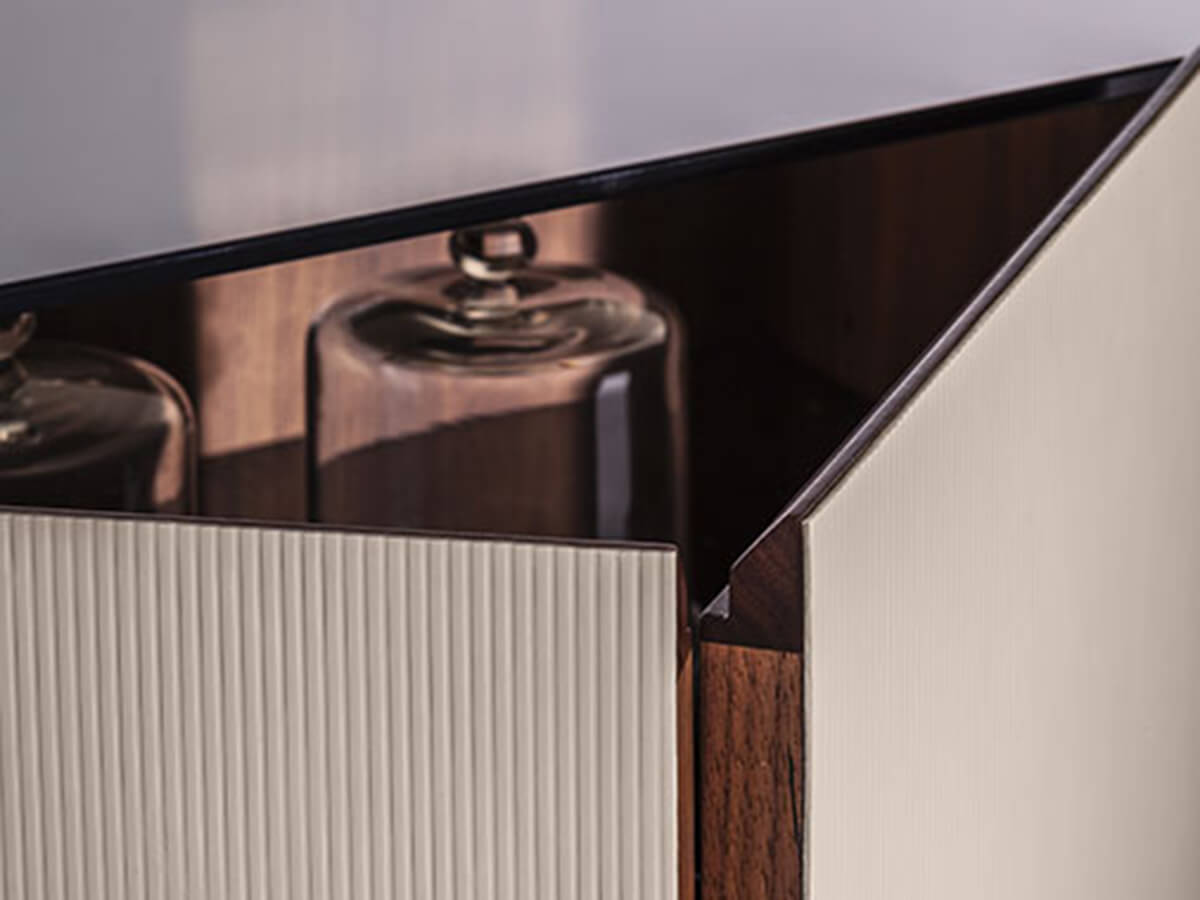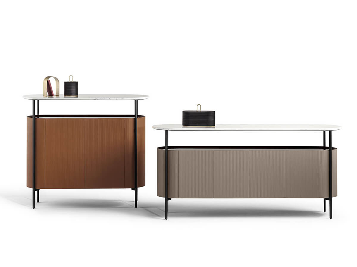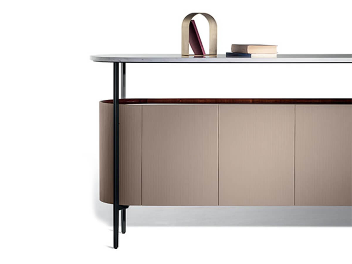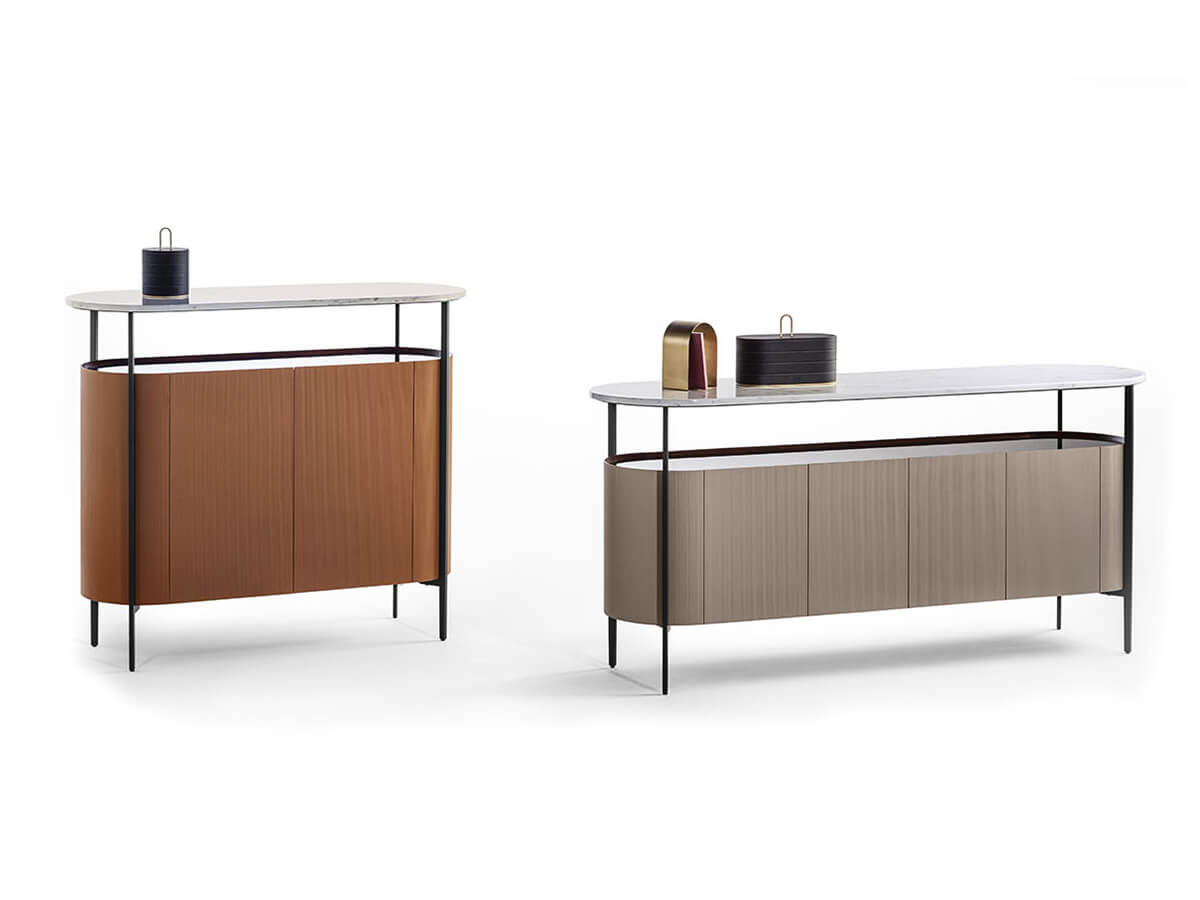 Una madia che gioca tra volumi pieni e vuoti, creando un’attenta ricerca strutturale al fine di creare un elemento d’arredo fortemente caratterizzato, unico e distinguibile nelle proposte per lo spazio giorno. Mi gioca anche sulla scelta di materiali, uniti su diversi piani al fine di creare un oggetto tridimensionale. La superficie esterna è rivestito in cuoio impreziosito da un’inedita texture canneté a righe verticali e che conferisce tridimensionalità all’insieme. Una sottile ma solida struttura in metallo incornicia il corpo del mobile e fune da collegamento con il piano sopraelevato in marmo. Ideale per spazi raffinati e di grande gusto.