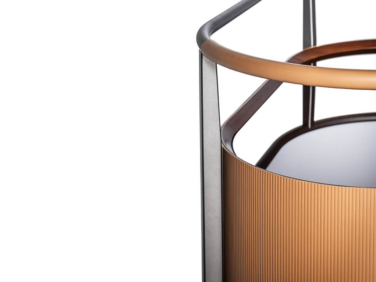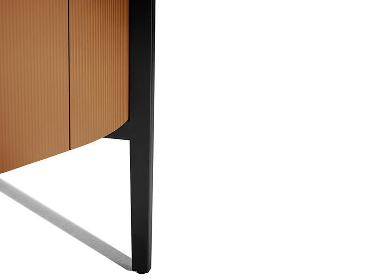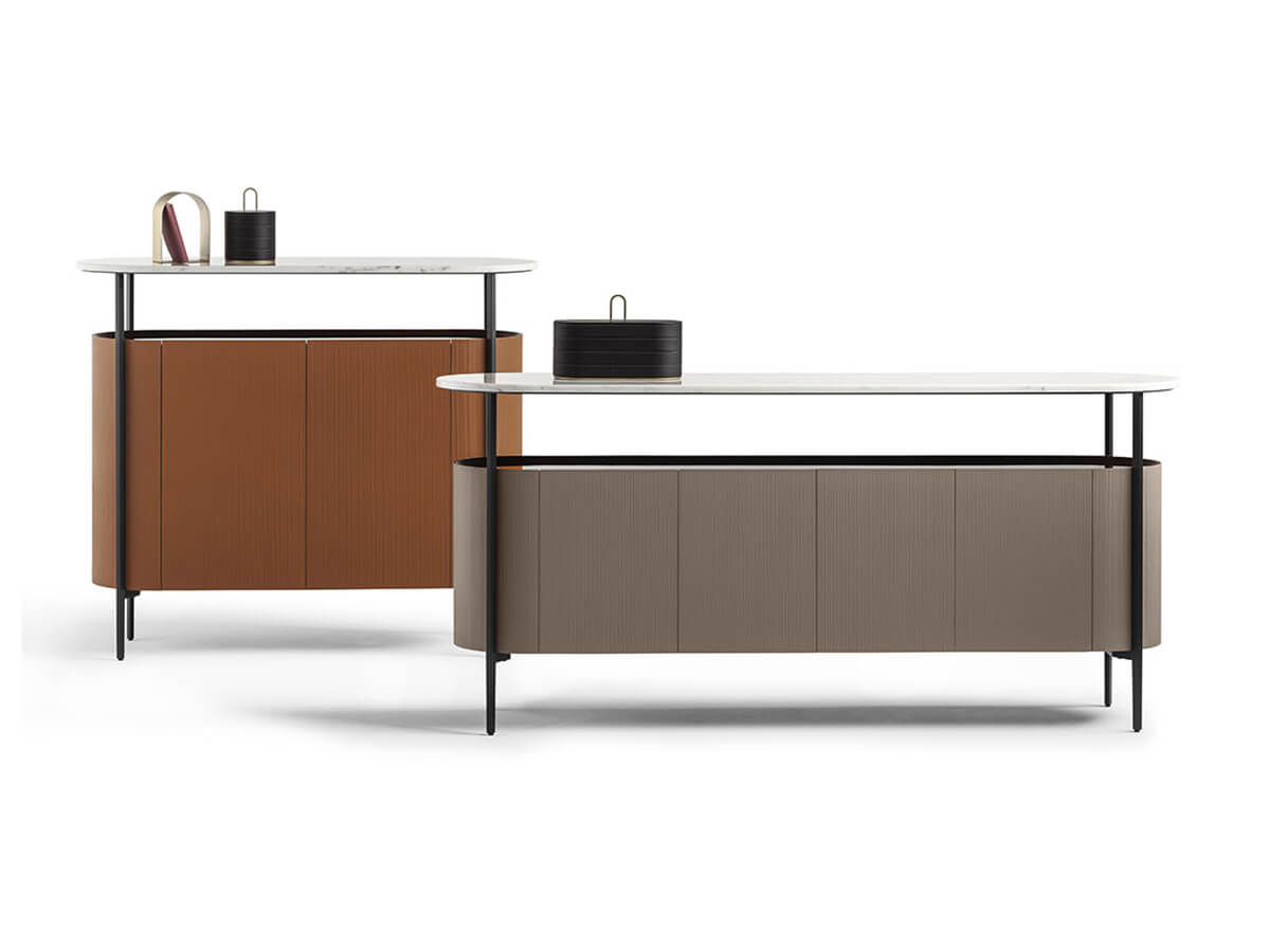 Una madia che gioca tra volumi pieni e vuoti, creando un’attenta ricerca strutturale al fine di creare un elemento d’arredo fortemente caratterizzato, unico e distinguibile nelle proposte per lo spazio giorno. Mi gioca anche sulla scelta di materiali, uniti su diversi piani al fine di creare un oggetto tridimensionale. La superficie esterna è rivestito in cuoio impreziosito da un’inedita texture canneté a righe verticali e che conferisce tridimensionalità all’insieme. Una sottile ma solida struttura in metallo incornicia il corpo del mobile e fune da collegamento con il piano sopraelevato in marmo. Ideale per spazi raffinati e di grande gusto.