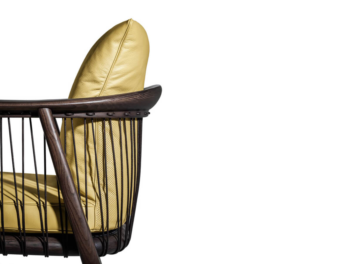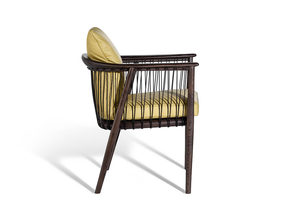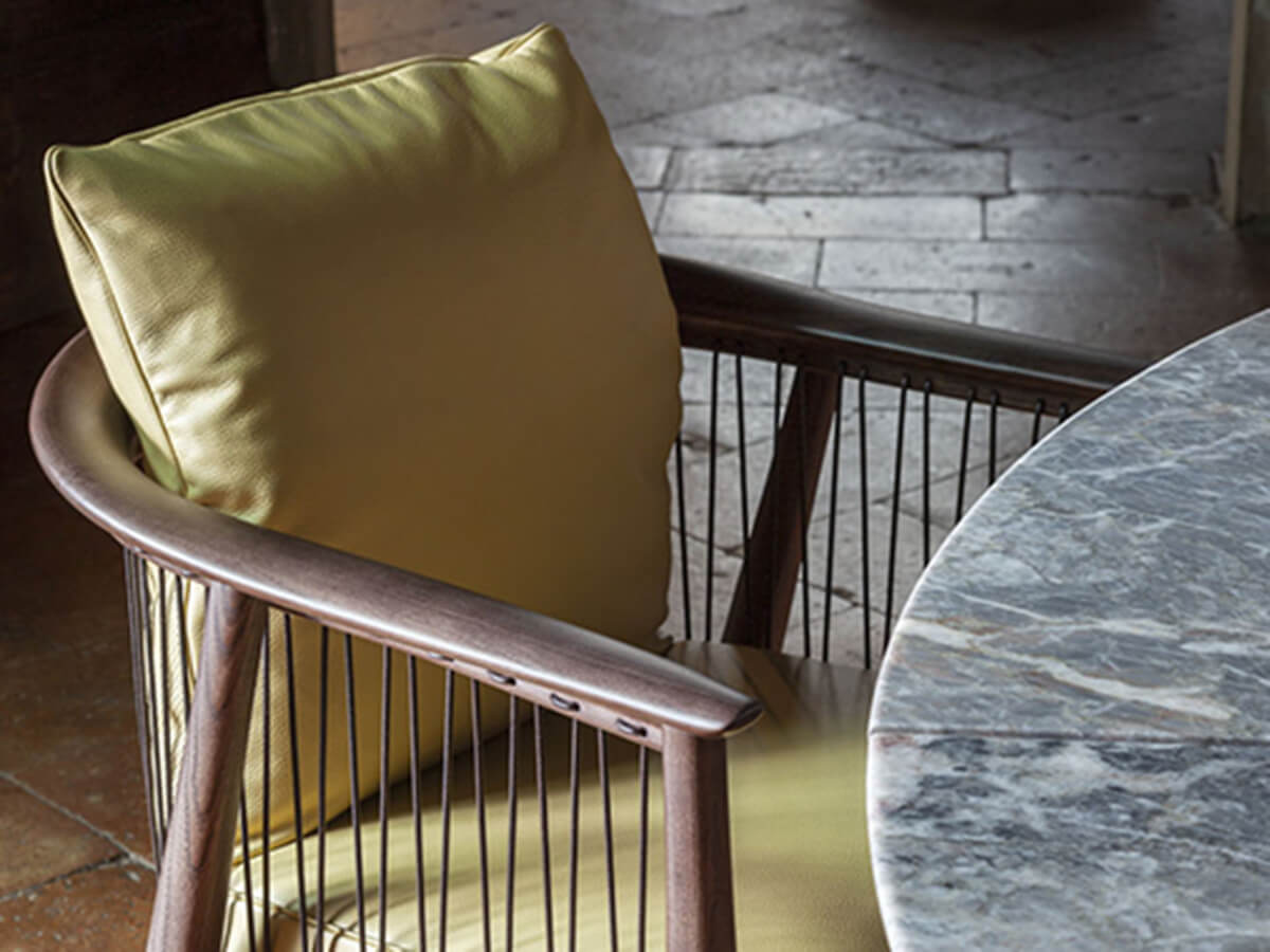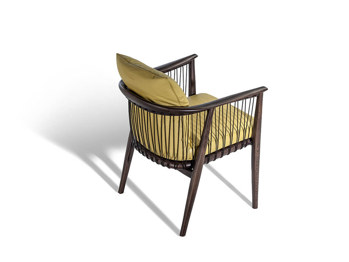 La linea Viola si declina in numerose proposte per la casa, spaziando dalla sedia alla poltroncina senza però compromettere in alcun modo la comodità di questo elemento d’arredo estremamente versatile e fruibile nei diversi ambienti della casa. Le linee classiche che ispirano Viola sono state addolcite e svecchiate donandole un tono contemporaneo fatto di pieni e vuoti che valorizzano la struttura nel suo insieme. Lo schienale in legno, grazie alla morbida e confortevole curvatura, va a creare una zona di appoggio per i gomiti, impreziosita dall’intreccio realizzato con sessanta cordoncini di cuoio che lo collegano alla struttura.