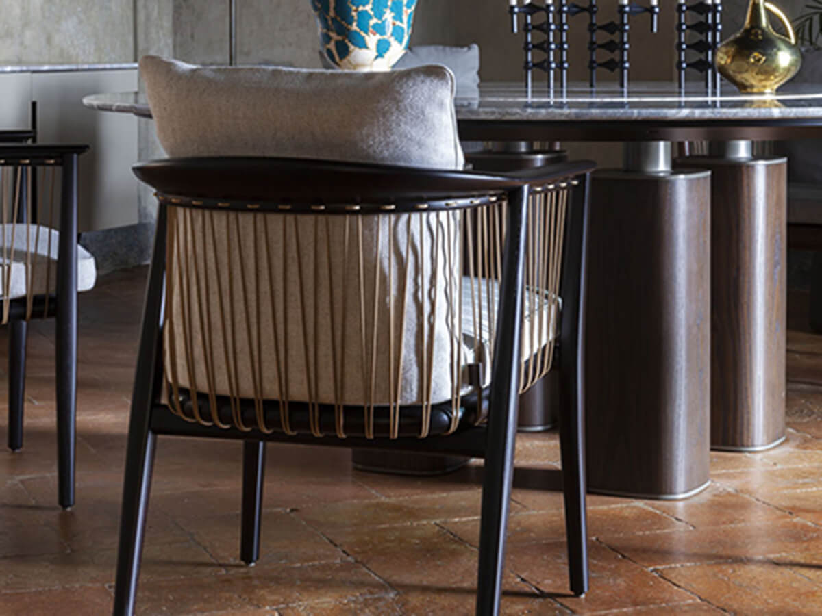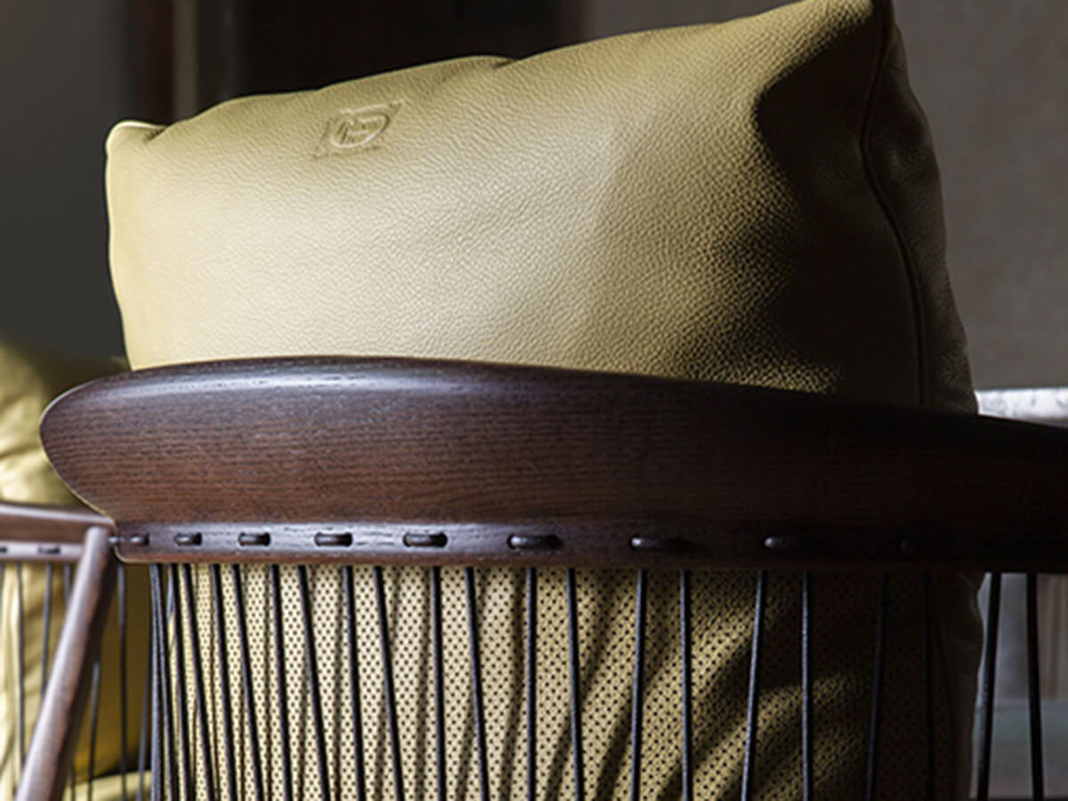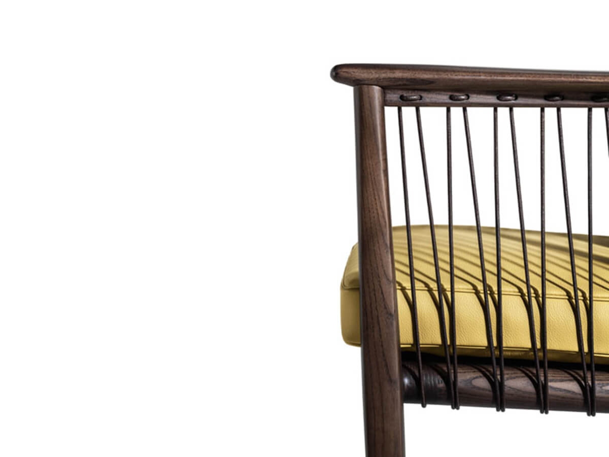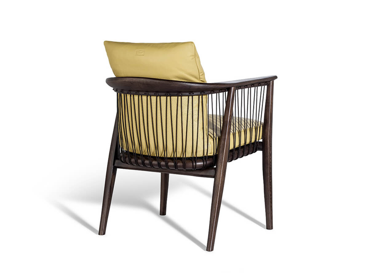 La linea Viola si declina in numerose proposte per la casa, spaziando dalla sedia alla poltroncina senza però compromettere in alcun modo la comodità di questo elemento d’arredo estremamente versatile e fruibile nei diversi ambienti della casa. Le linee classiche che ispirano Viola sono state addolcite e svecchiate donandole un tono contemporaneo fatto di pieni e vuoti che valorizzano la struttura nel suo insieme. Lo schienale in legno, grazie alla morbida e confortevole curvatura, va a creare una zona di appoggio per i gomiti, impreziosita dall’intreccio realizzato con sessanta cordoncini di cuoio che lo collegano alla struttura.