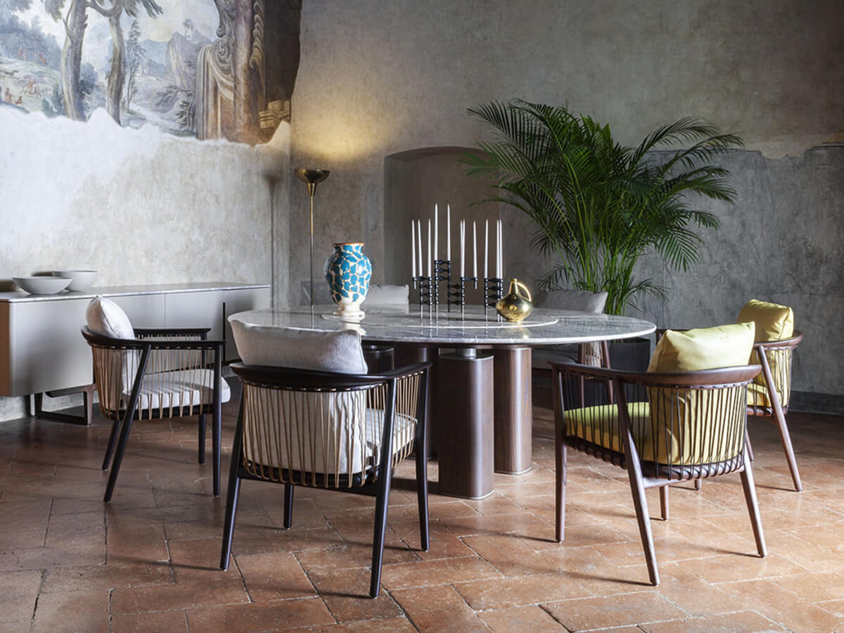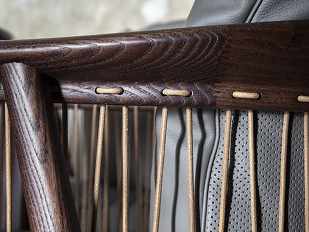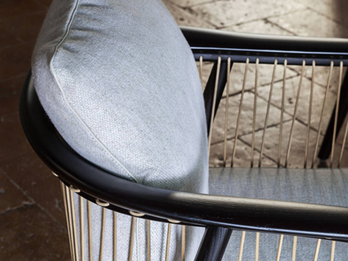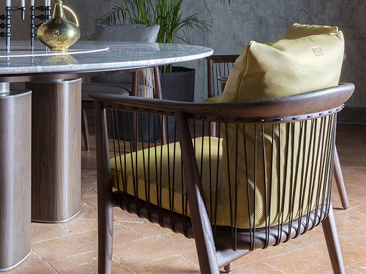 La linea Viola si declina in numerose proposte per la casa, spaziando dalla sedia alla poltroncina senza però compromettere in alcun modo la comodità di questo elemento d’arredo estremamente versatile e fruibile nei diversi ambienti della casa. Le linee classiche che ispirano Viola sono state addolcite e svecchiate donandole un tono contemporaneo fatto di pieni e vuoti che valorizzano la struttura nel suo insieme. Lo schienale in legno, grazie alla morbida e confortevole curvatura, va a creare una zona di appoggio per i gomiti, impreziosita dall’intreccio realizzato con sessanta cordoncini di cuoio che lo collegano alla struttura.