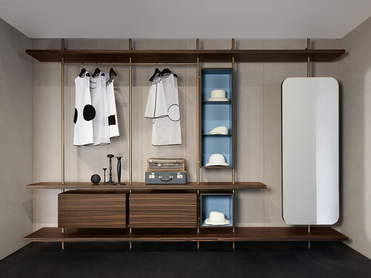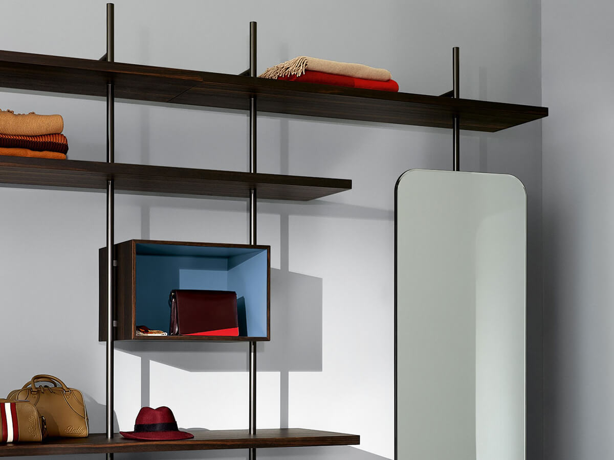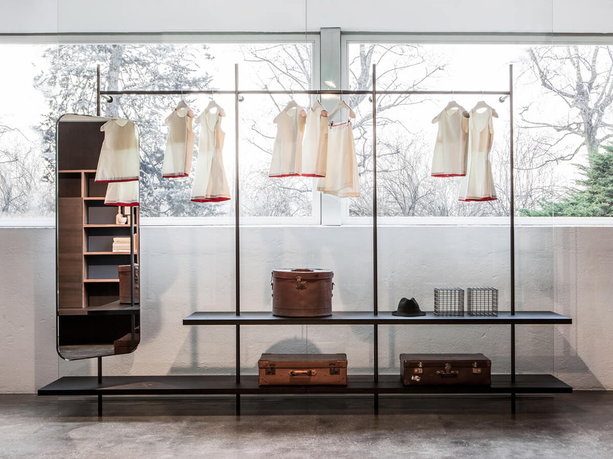 Il sistema Boutique Mast di Porro, con la leggerezza equilibrata dei suoi montanti e la precisa linearità delle sue forme, dà vita a cabine armadio agili e minimaliste, dominate dalla leggerezza dei montanti (agganciabili a parete o a soffitto) e dagli ampi spazi dedicati agli abiti. Elementi in legno con funzione di mensole e un ampio specchio possono completarne la configurazione. Boutique Mast è perfetta per aggraziate composizioni lineari, prive di angoli, e si caratterizza per la sue estrema versatilità: può infatti trovare anche agevolmente spazio in soggiorno, assumendo la forma di una pratica libreria, o può addirittura presentarsi come mobile espositore in negozi di lusso.