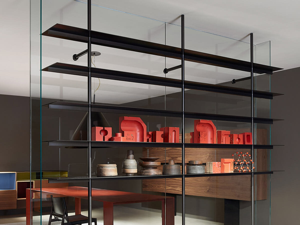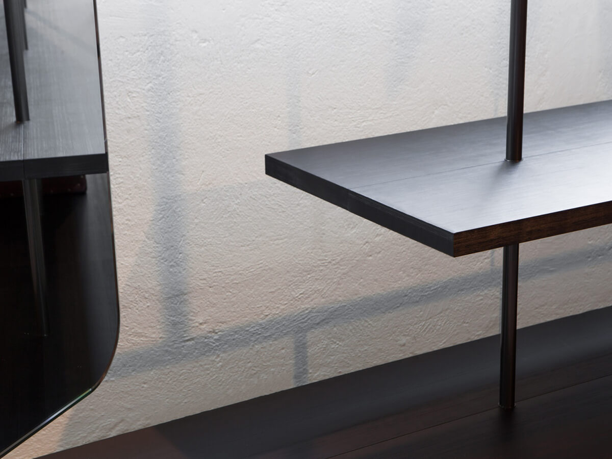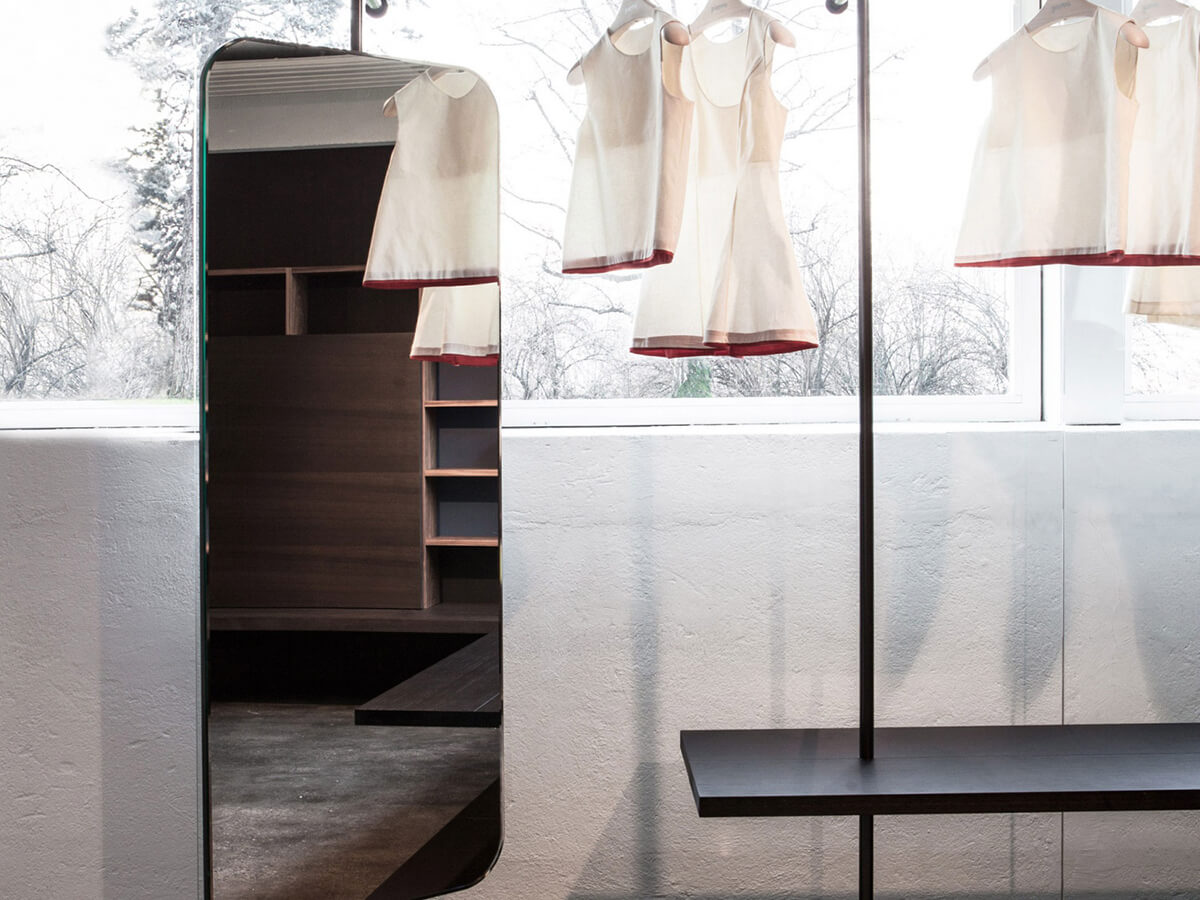 Il sistema Boutique Mast di Porro, con la leggerezza equilibrata dei suoi montanti e la precisa linearità delle sue forme, dà vita a cabine armadio agili e minimaliste, dominate dalla leggerezza dei montanti (agganciabili a parete o a soffitto) e dagli ampi spazi dedicati agli abiti. Elementi in legno con funzione di mensole e un ampio specchio possono completarne la configurazione. Boutique Mast è perfetta per aggraziate composizioni lineari, prive di angoli, e si caratterizza per la sue estrema versatilità: può infatti trovare anche agevolmente spazio in soggiorno, assumendo la forma di una pratica libreria, o può addirittura presentarsi come mobile espositore in negozi di lusso.