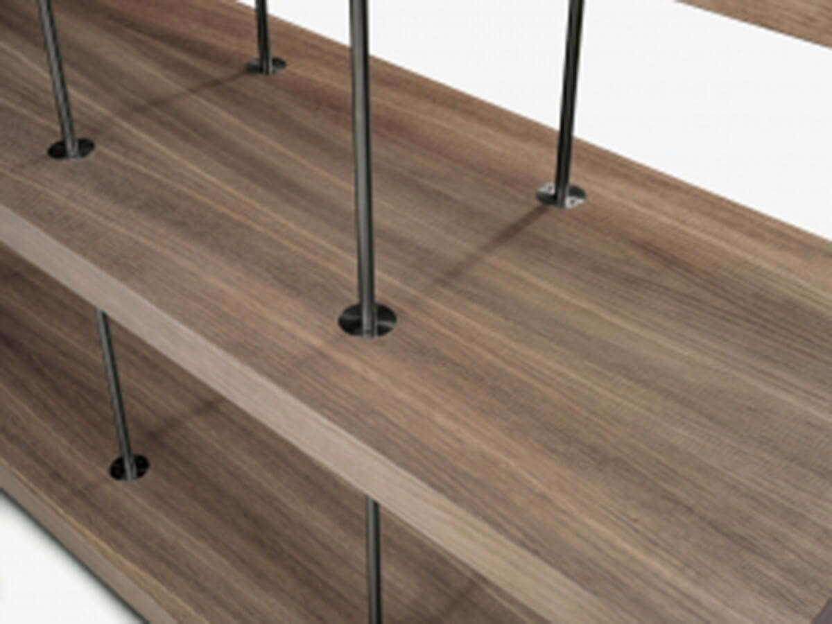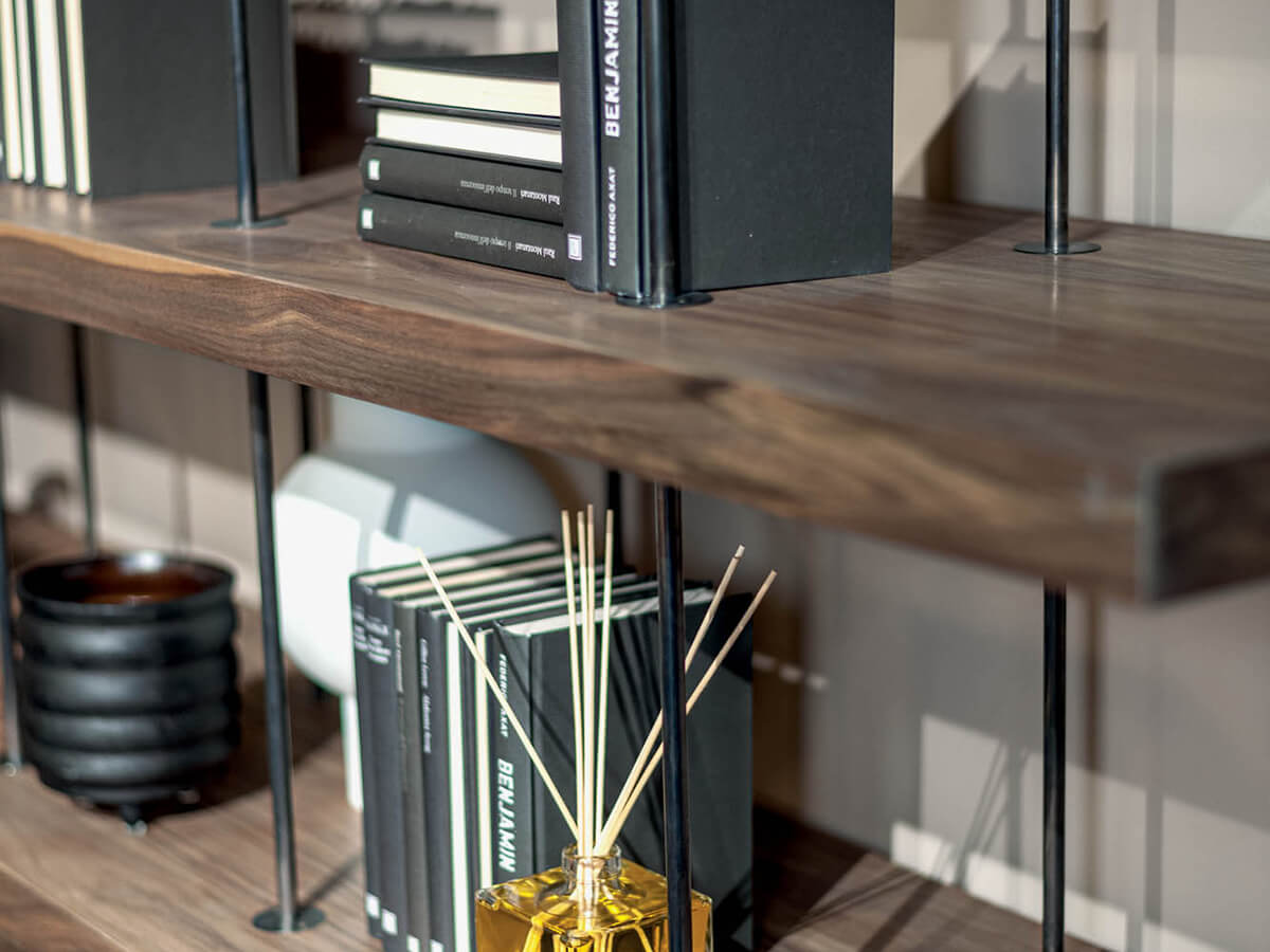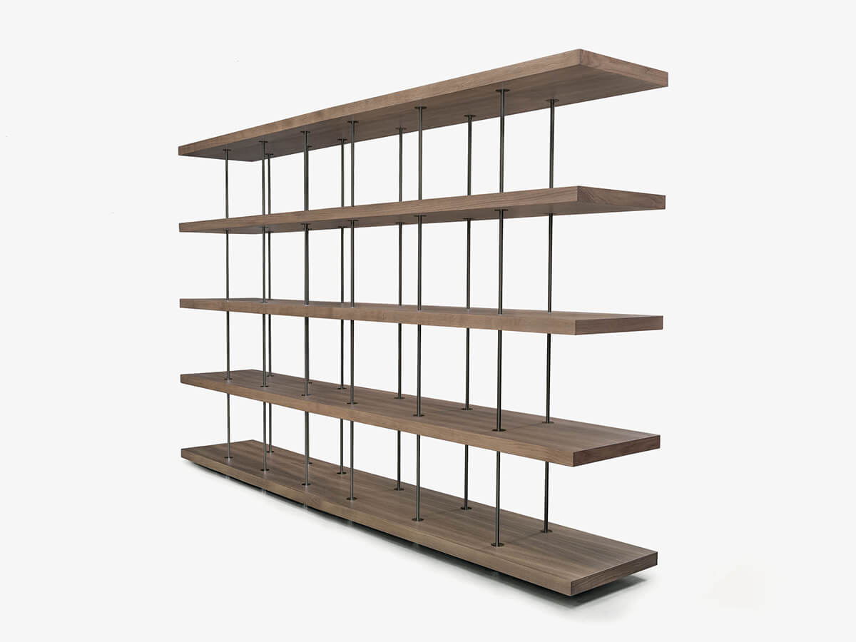 La libreria Piano Design di Riva 1920 porta la firma della più rinomata archistar del design italiano: è stata infatti disegnata da Renzo Piano, in collaborazione con il figlio Matteo. È costituita da ampi ripiani in legno massello sorrette da sottili tiranti in acciaio e coniuga il look caldo e rustica tipico della produzione Riva 1920 con una grande attenzione al rigore delle forme. È una libreria bifacciale adatta anche all’inserimento a centro stanza e può essere personalizzata con l’inserimento di contenitori ad anta battente o cassetti. La versione “Piano Deisgn Bookshelf 100” si caratterizza per la finitura brunita dei tiranti e l’utilizzo del noce “Centenarium Collection” per i ripiani.