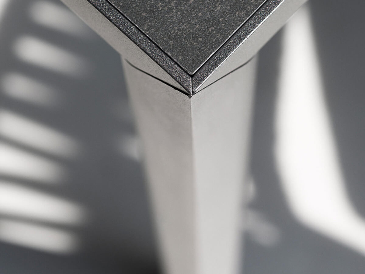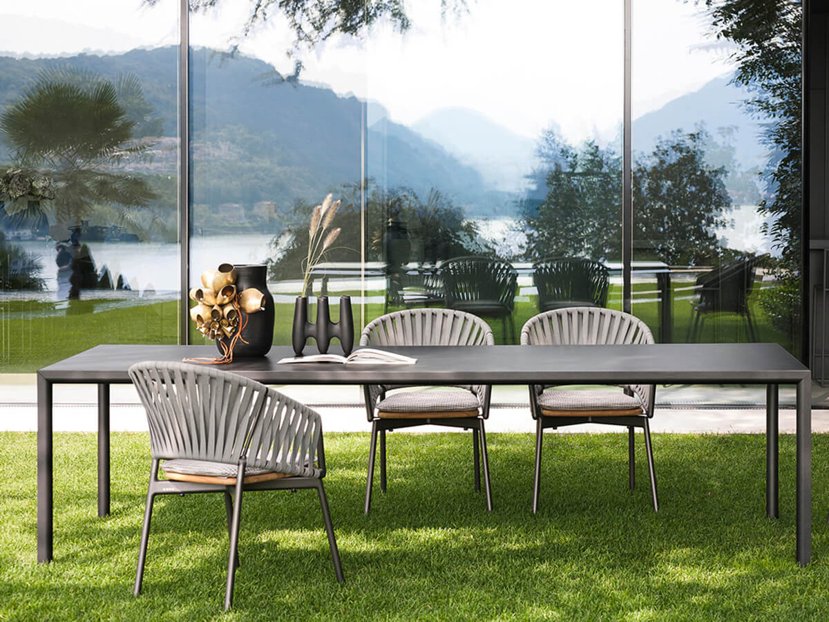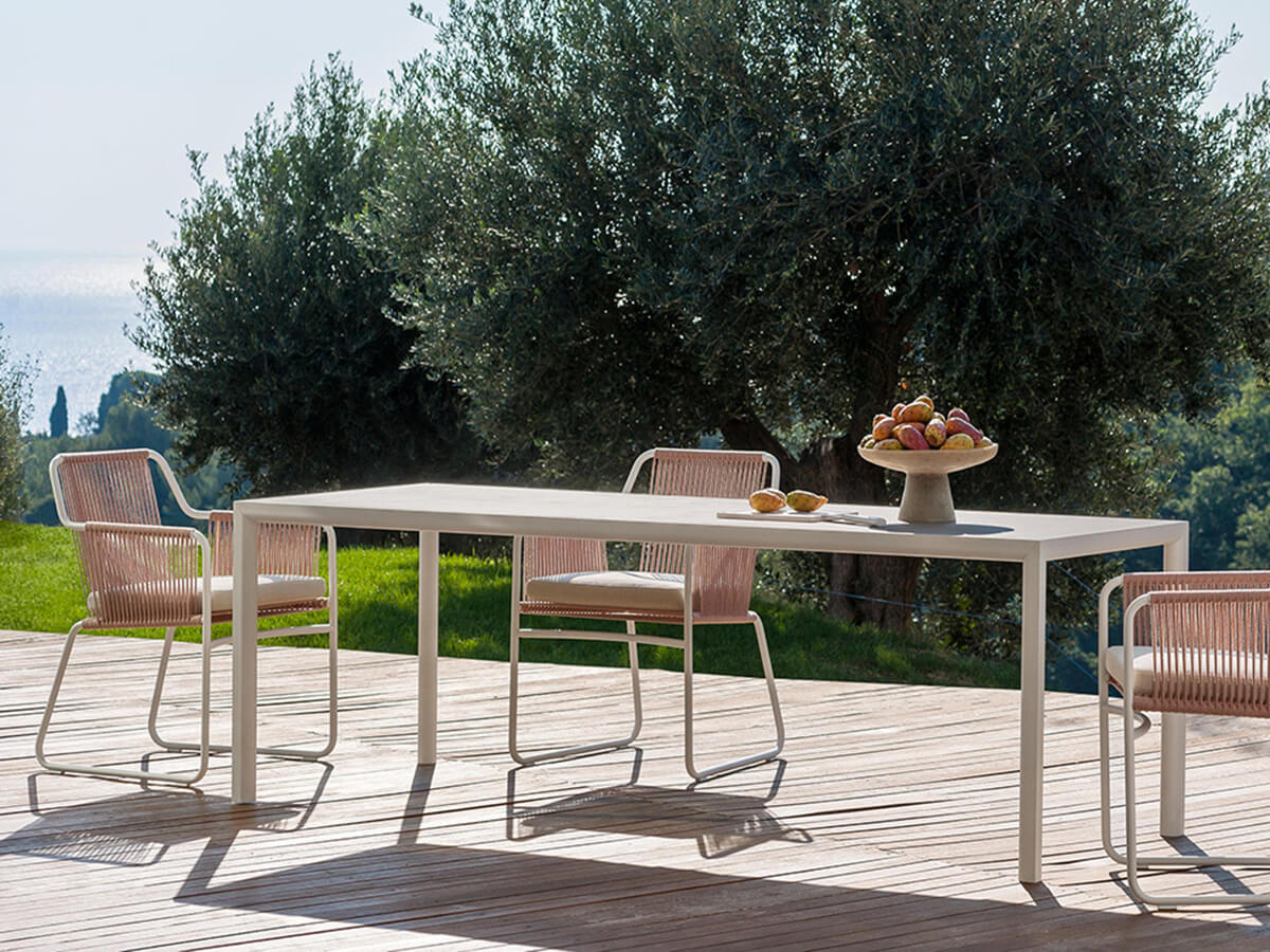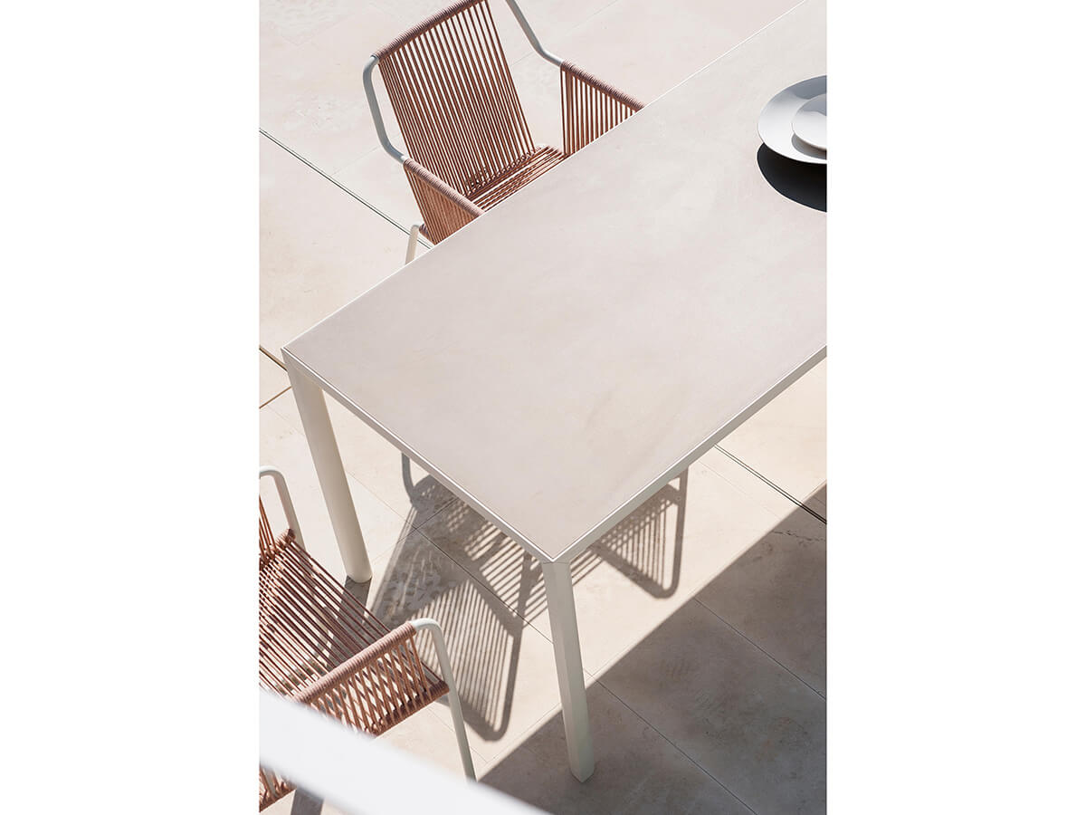 Dalla maestria artigianale declinata nelle più raffinate inclinazioni moderne nasce il tavolo Plein Air dedicato alla convivialità e alla sobrietà del soggiornare all’esterno secondo i propri gusto. La bellezza di Plein Air nasce proprio dal saper fondere un elemento d’arredo particolarmente solido con una raffinatezza determinata dalle gambe in alluminio che si innestano nella cornice del piano senza punti di giuntura a vista per dar vita a un’originale forma a goccia che esalta la pulizia estetica e migliora la resa generale voluta da Roda. Il piano in gres corre su tutta la lunghezza del tavolo, enfatizzando la sua perfetta orizzontalità. Coordinata al tavolo è la sedia Plein Air, in batyline per un corretto assortimento geometrico.