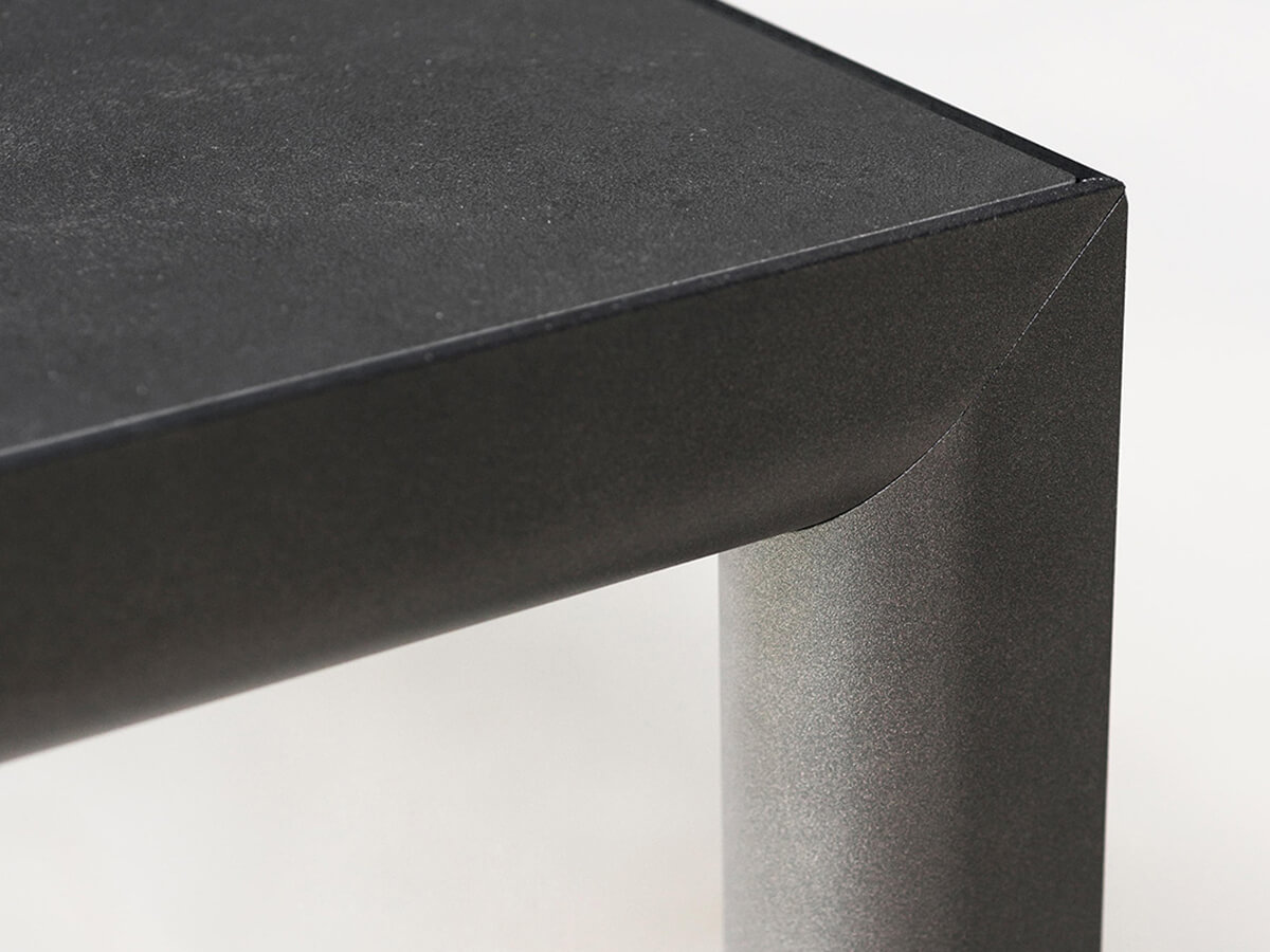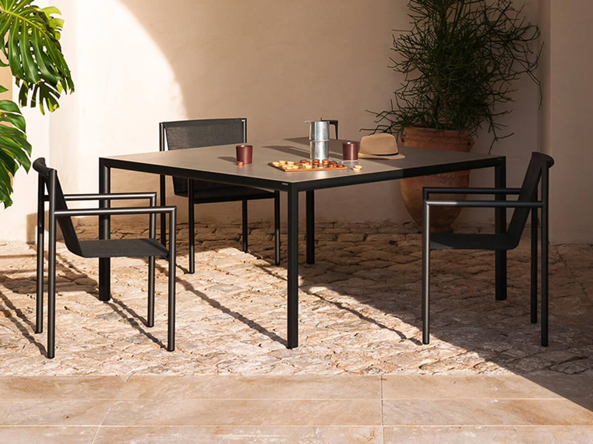 Dalla maestria artigianale declinata nelle più raffinate inclinazioni moderne nasce il tavolo Plein Air dedicato alla convivialità e alla sobrietà del soggiornare all’esterno secondo i propri gusto. La bellezza di Plein Air nasce proprio dal saper fondere un elemento d’arredo particolarmente solido con una raffinatezza determinata dalle gambe in alluminio che si innestano nella cornice del piano senza punti di giuntura a vista per dar vita a un’originale forma a goccia che esalta la pulizia estetica e migliora la resa generale voluta da Roda. Il piano in gres corre su tutta la lunghezza del tavolo, enfatizzando la sua perfetta orizzontalità. Coordinata al tavolo è la sedia Plein Air, in batyline per un corretto assortimento geometrico.