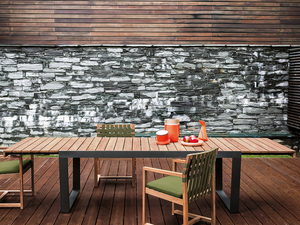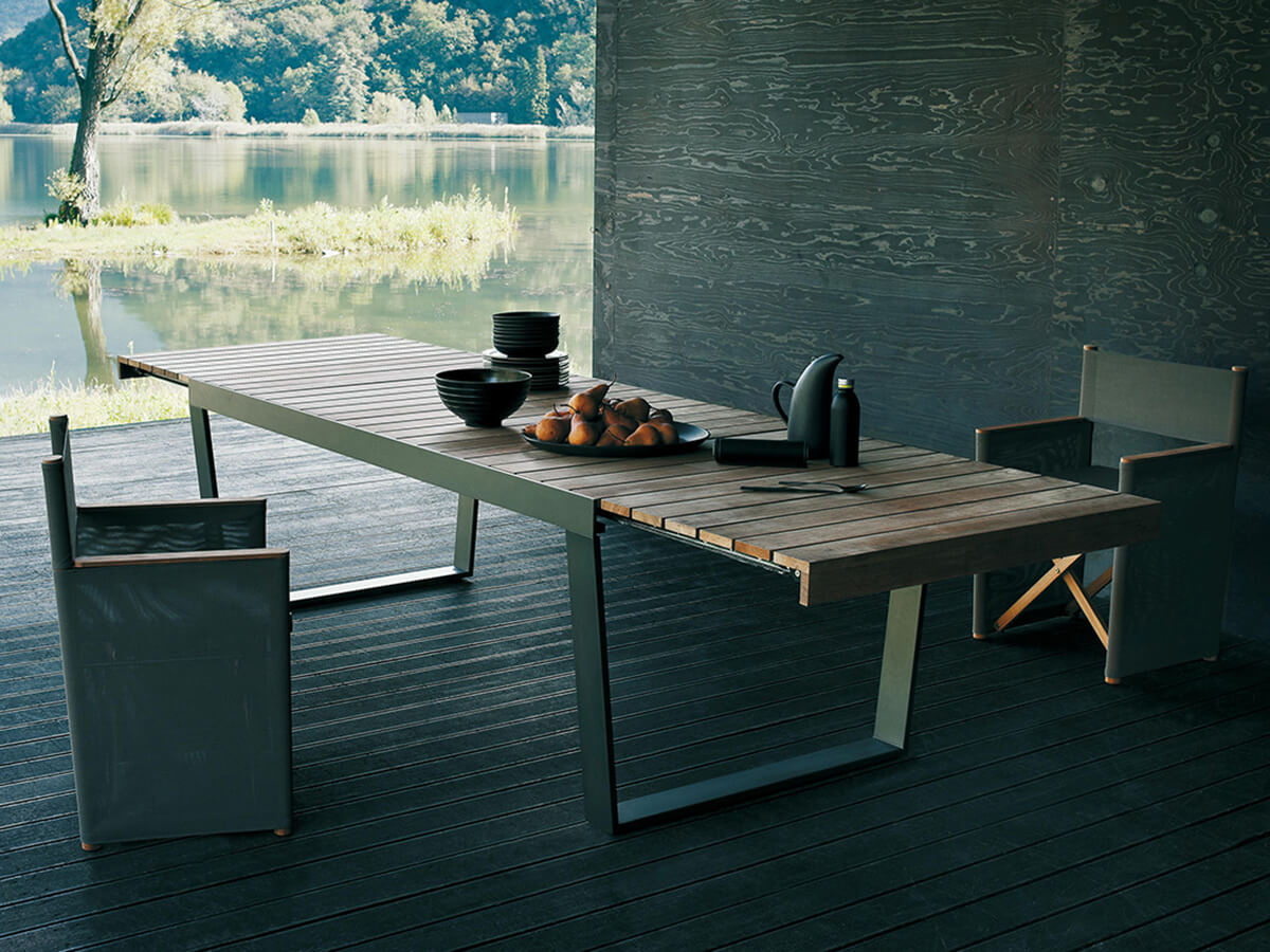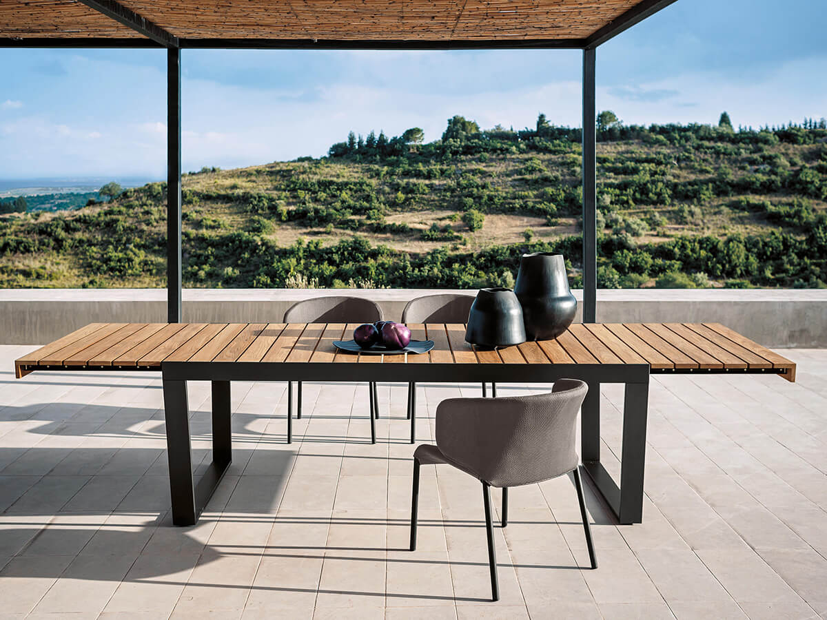 Numero uno nella produzione di arredi per l’esterno, Roda arricchisce le proprie collezioni con Spinnaker, una serie di tavoli allungabili che trae la sua forza da un design rigoroso ed estremamente moderno capace di catturare l’attenzione di un pubblico più che diversificato. Spinnaker può accogliere fino a dodici persone comodamente sedute e presenta un’apertura a ribalta dove il piano in doghe, disponibile in teak o in teak weather resistant scorre agevolmente sulle guide. Le gambe dal disegno geometrico e dal tratto continuo sono in acciaio inossidabile verniciato per esterno, ideali per resistere a ogni agente atmosferico e alla lunga permanenza all’esterno.