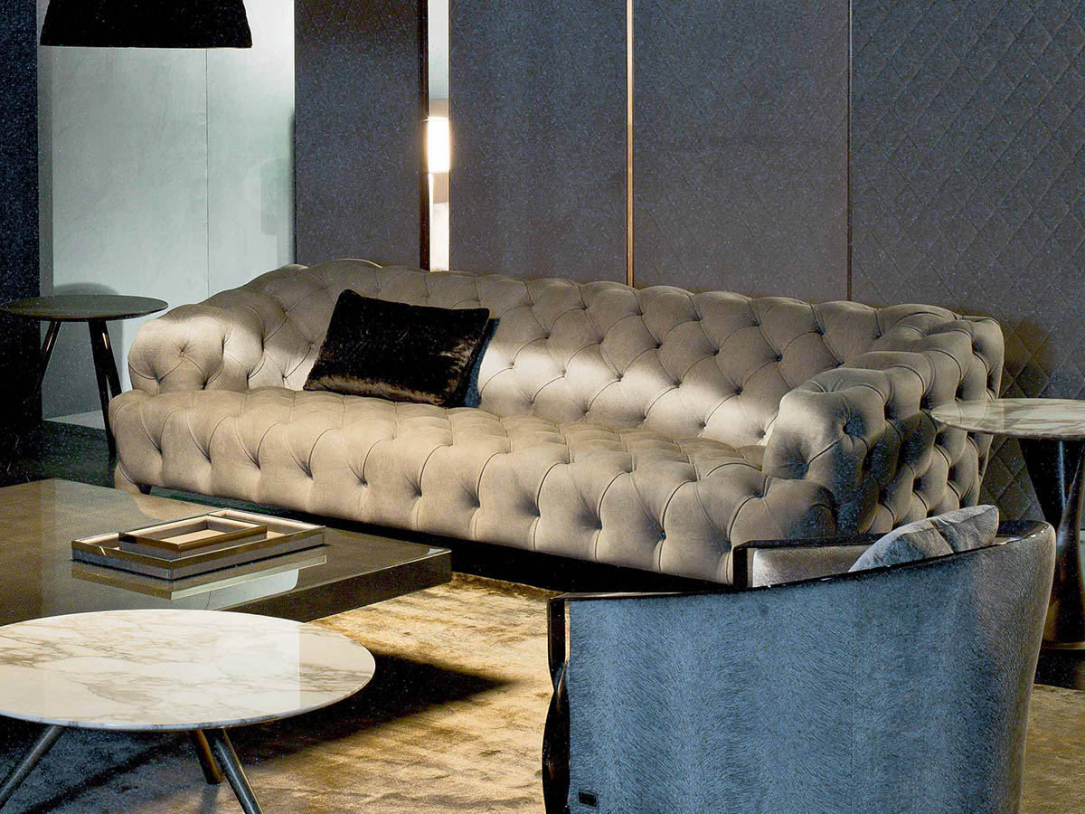 Un omaggio al più classico dei divani, il celebre divano Chesterfield la cui fisionomia ha segnato un’epoca, divenendo vero e proprio stereotipo dell’imbottito di alta gamma. Cloud è un divano di Rugiano dove spiccano le impunture capitonné, lavorazione che viene ripresa non solo nei braccioli e nello schienale, ma anche in tutta la struttura, creando un effetto totalizzante. La fisionomia è solida e lineare, sebbene i braccioli abbiamo una leggera tendenza verso il basso per alleggerire l’insieme e creare una rottura con la tradizione. Cloud presenta numerose varianti di colore e finiture oltre ad alcune aggiunte di complementi estremamente utili come un pouf capitonné la cui presenza rende l’esperienza di seduta comoda e avvolgente.