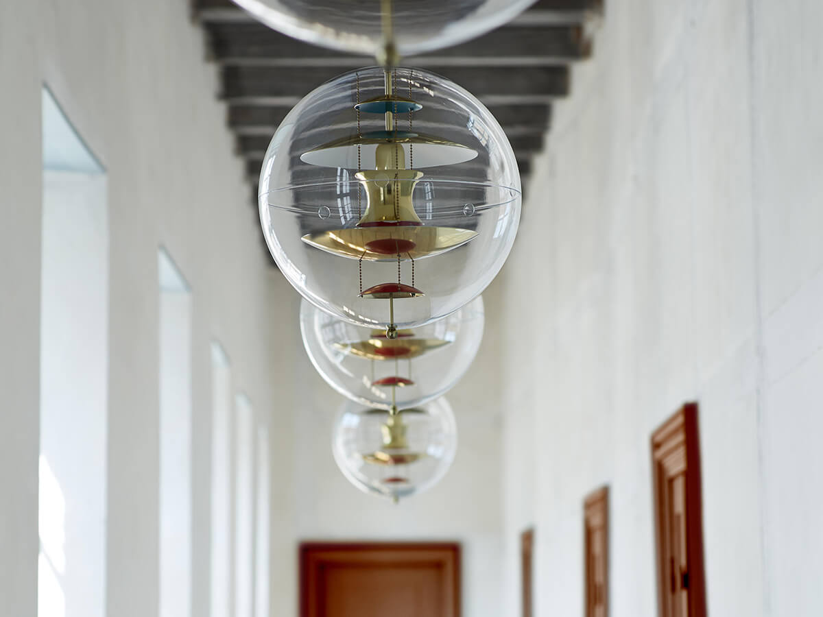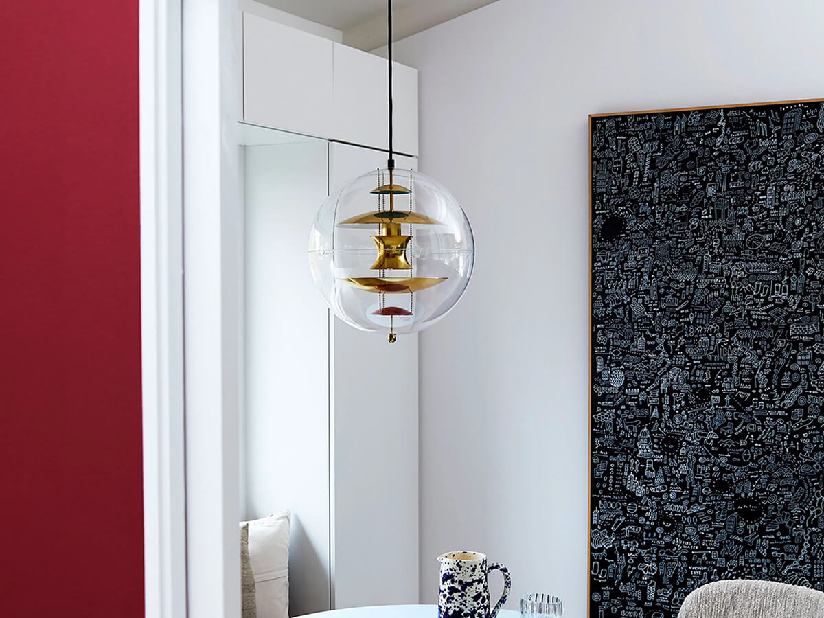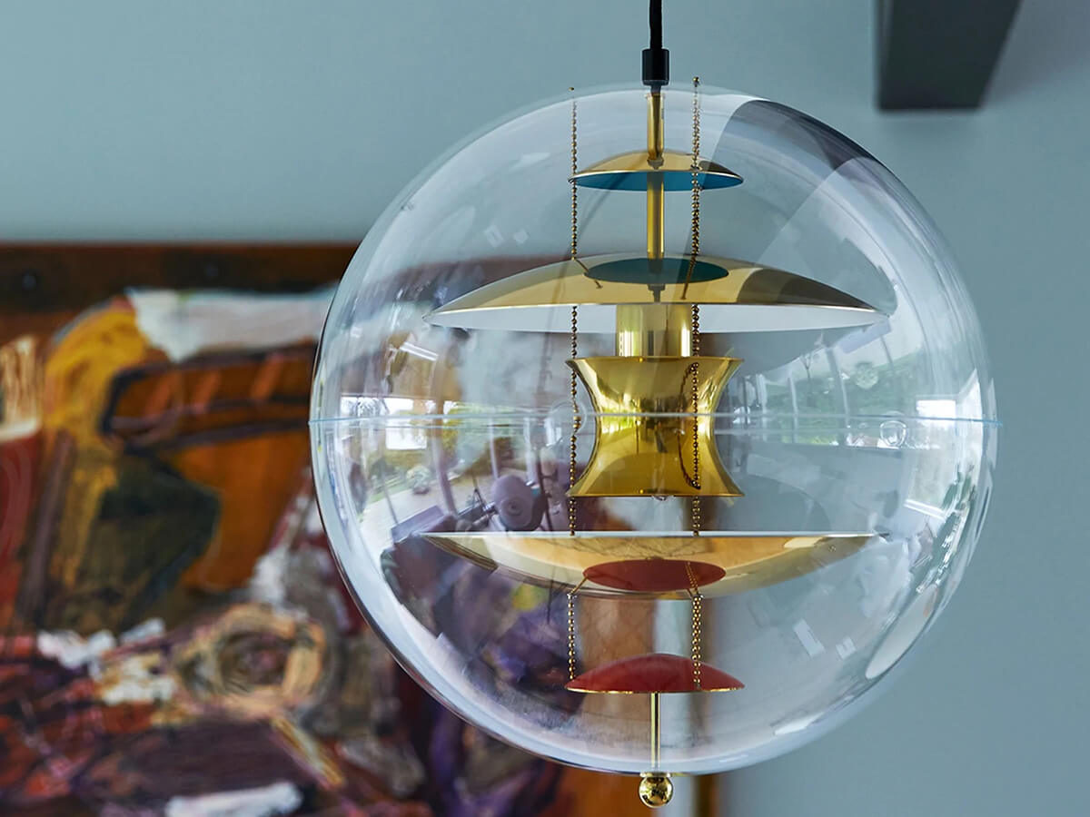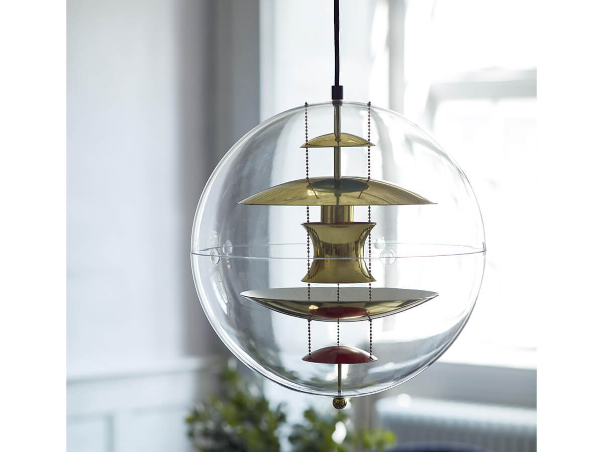 Icona dello stile Space Age, la lampada a sospensione VP Globe di Verpan è una delle creazioni più famose di Verner Panton. VP Globe, disegnata nel 1969, pare uscita da un film di fantascienza dell’epoca: è costituita da una sfera in acrilico trasparente che racchiude una serie di dischi e riflettori concavi in alluminio brillante, ingentiliti da alcuni tocchi di rosso e di blu e tenuti sospesi da tre piccole catenelle. Simmetrica, equilibrata e dal forte impatto scenografico, VP Globe fece il suo debutto nella mostra Visiona 2 allestita da Panton presso la Fiera di Colonia e può essere utilizzata in tanti ambienti differenti, sia da sola che accostandone diversi esemplari.