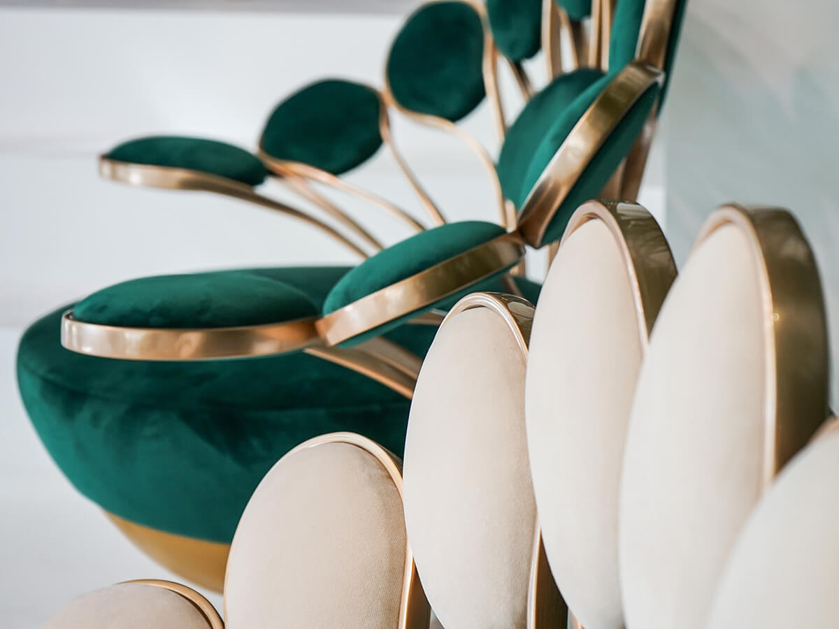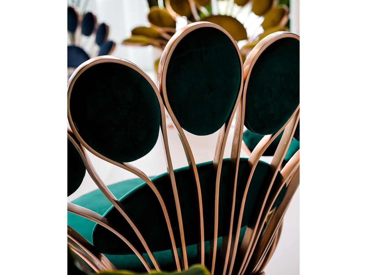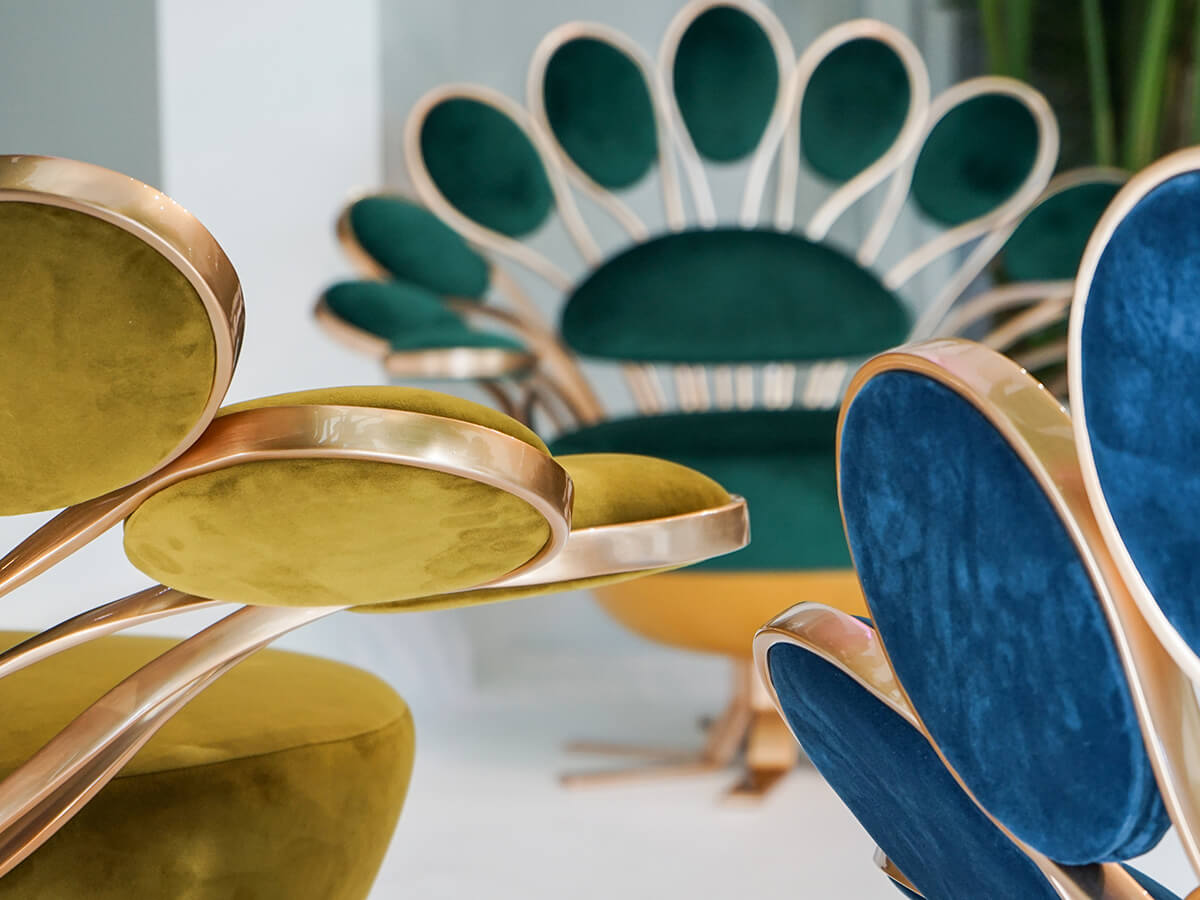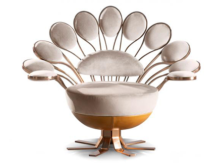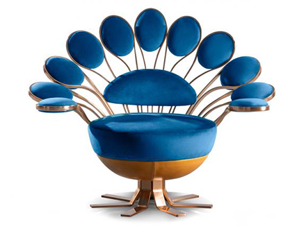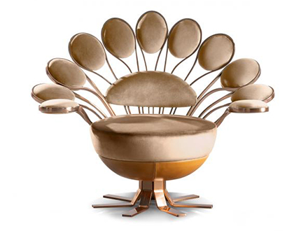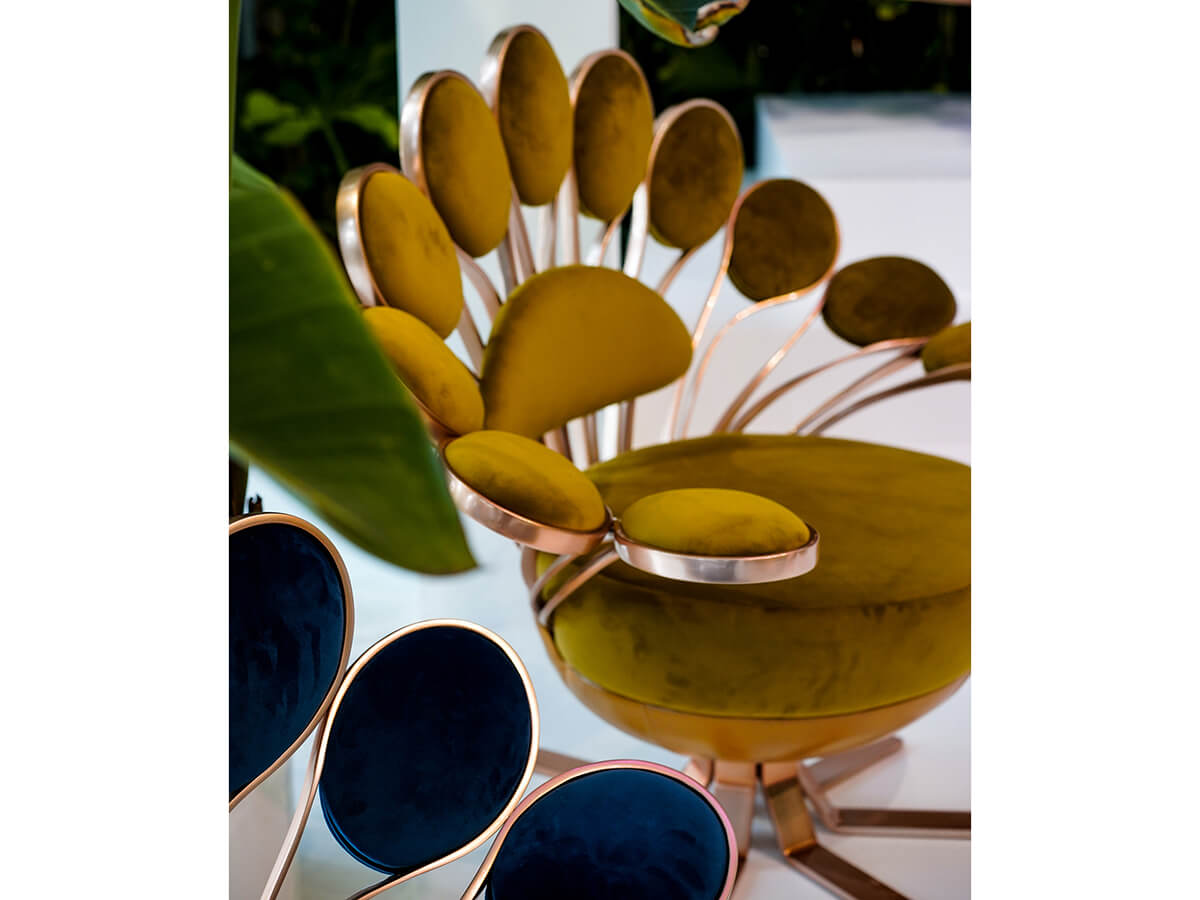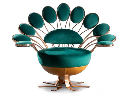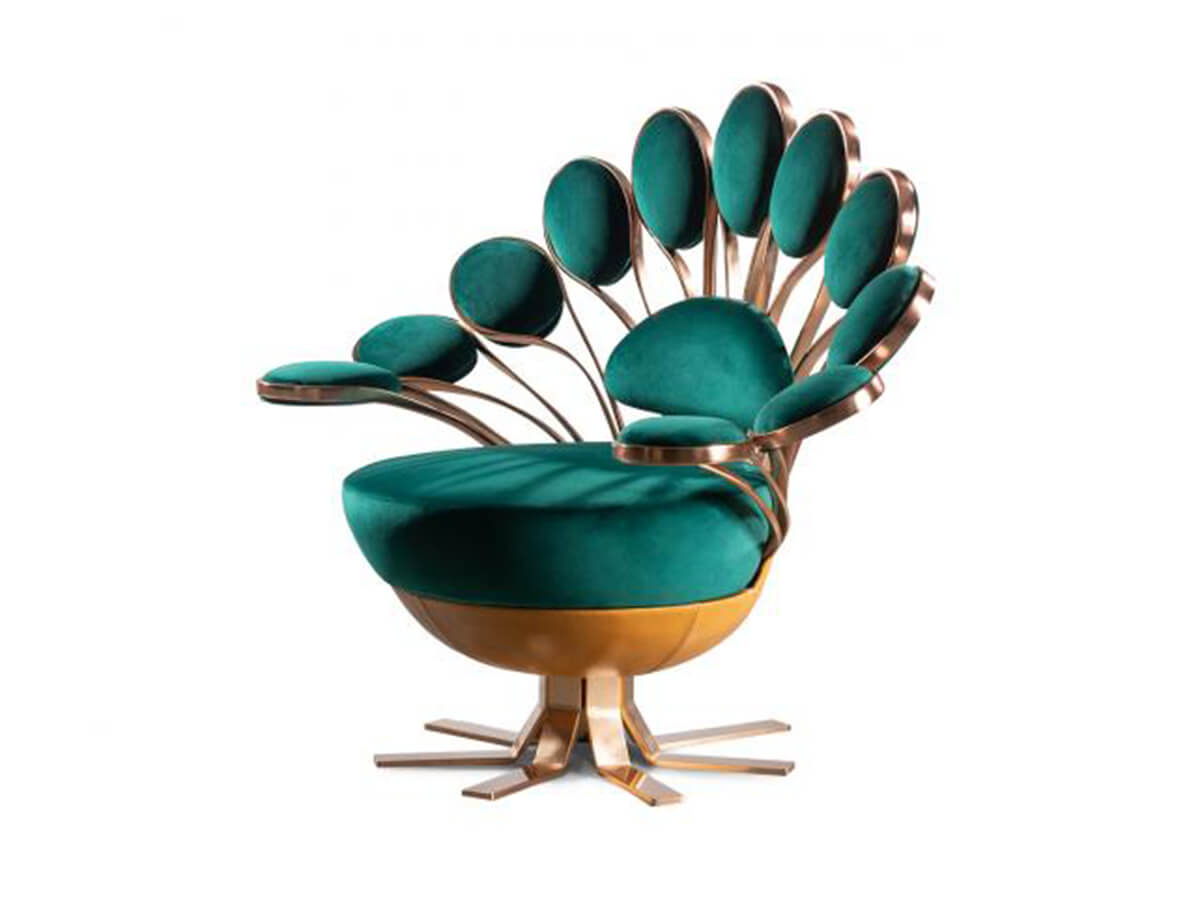Una seduta capace di catalizzare lo sguardo ed esprimere in un’unica soluzione eleganza, ricercatezza e suggestione. Pavone esprime dell’omonimo animale i colori ricercati, la forma e la suprema armonia delle forme, studiate così da creare qualcosa che potrebbe risultare un trono, così come un oggetto dal fascino esotico e indefinibile. La struttura è in ottone e acciaio lucido con finitura laccata bronzo satinato, imbottito in tessuto. Il bracciolo e lo schienale si compongono di elementi simili a petali realizzati in fusione di ottone lucidato a mano. La base è rivestita in pelle. La risultante è preziosa e caratteristica. Caratteristiche tecniche: struttura in ottone