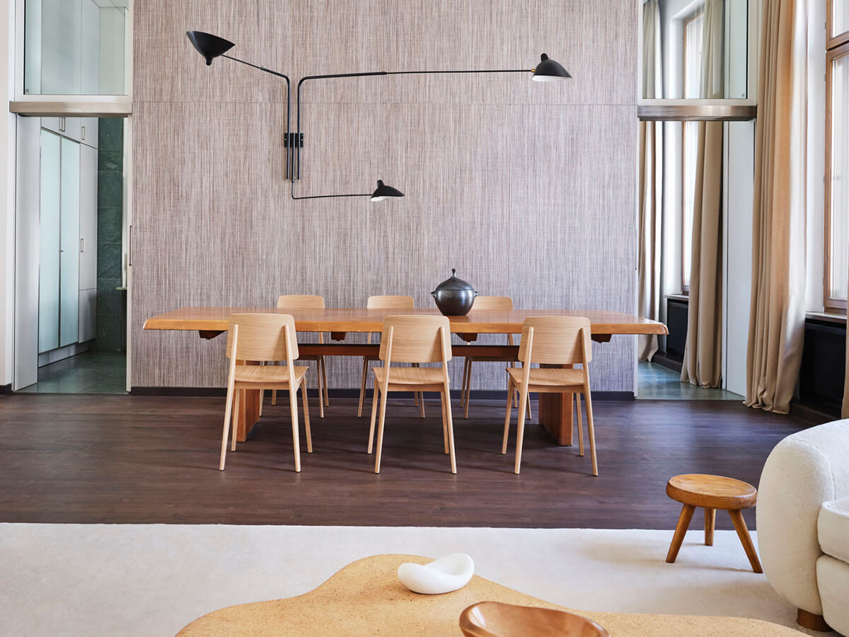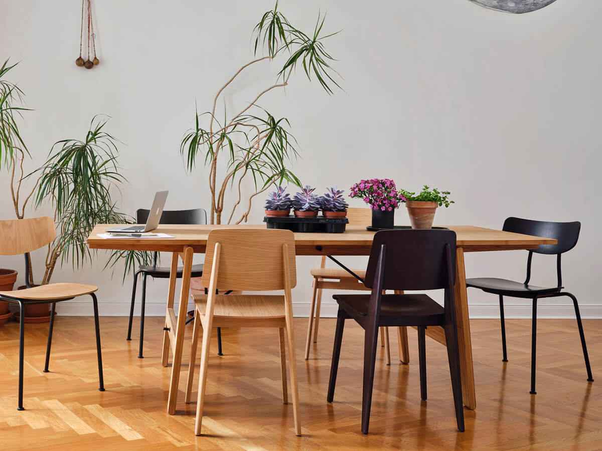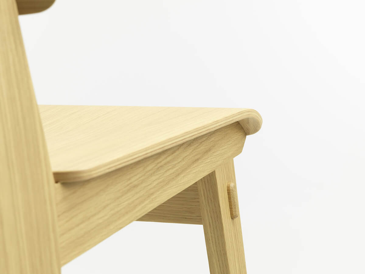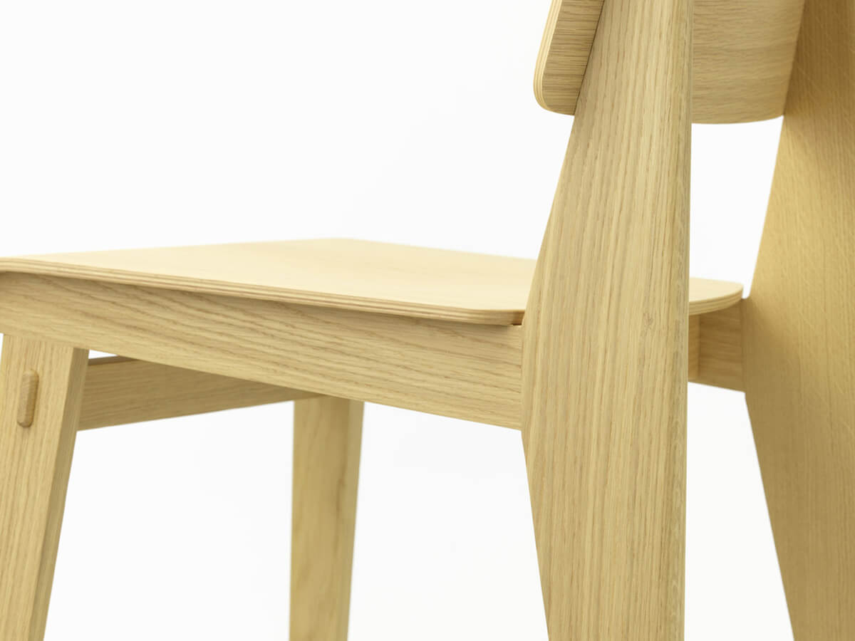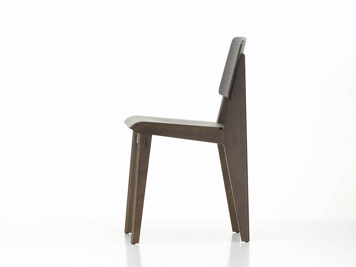 Realizzata interamente in legno, la sedia Chaise Tout Bois prende le sue forme dall’iconica sedia Standard di Jean Prouvé. Il design è figlio del suo tempo, un 1941 connotato dalla scarsità di metallo dovuta all’infuriare della Seconda Guerra Mondiale che rendeva necessario ridurre al minimo l’impiego di parti metalliche necessarie ad altri usi. Le gambe posteriori di questa seduta sono più forti di quelle anteriori, in quanto pensate per sostenere maggiormente il peso di chi si siede; anche lo schienale segue la stessa linea di pensiero, innestandosi sulla struttura principale con un incastro solido e privo di abbellimenti superflui.