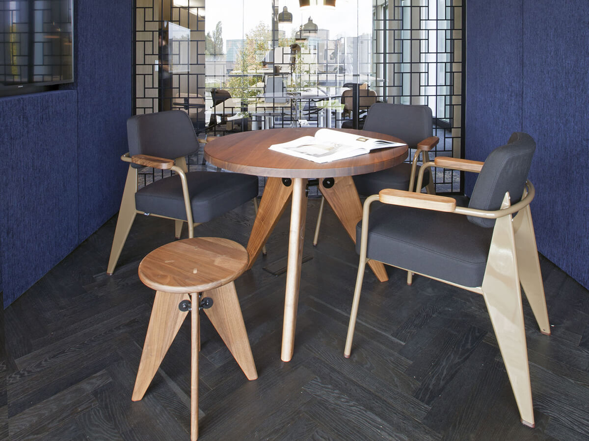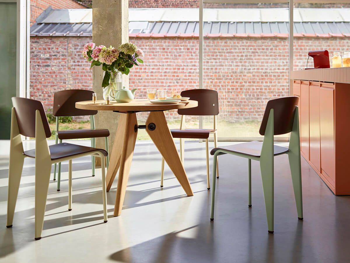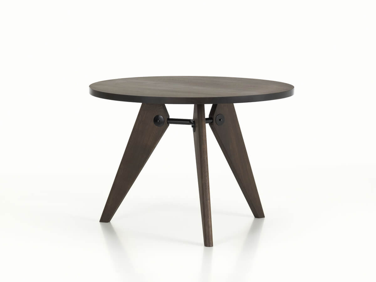 L’estetica di Jean Prouvé delinea nel 1949 le forme di questo tavolo dalle forme acute e svettanti, dove forte si percepisce il taglio ingegneristico del suo creatore. La filosofia di Guéridon si colloca all’interno delle altre numerose opere di Prouvé, celebri per definire le strutture non solo in base all’estetica ma anche e soprattutto all’utilizzo quotidiano. Questo tavolo rotondo presenta un top in legno massello e gambe abbinate, rigorosamente articolate a formare un supporto resistente all’uso quotidiano. Questa proposta dal gusto squisitamente classico non disdegna ambienti anche moderni, collocandosi come voce fuori dal coro in situazioni di stile eterogeneo.