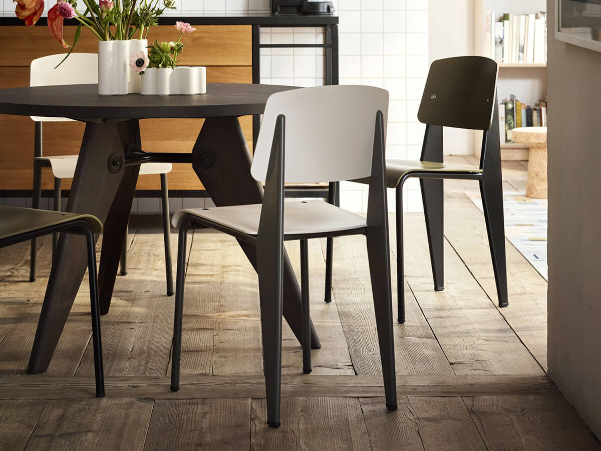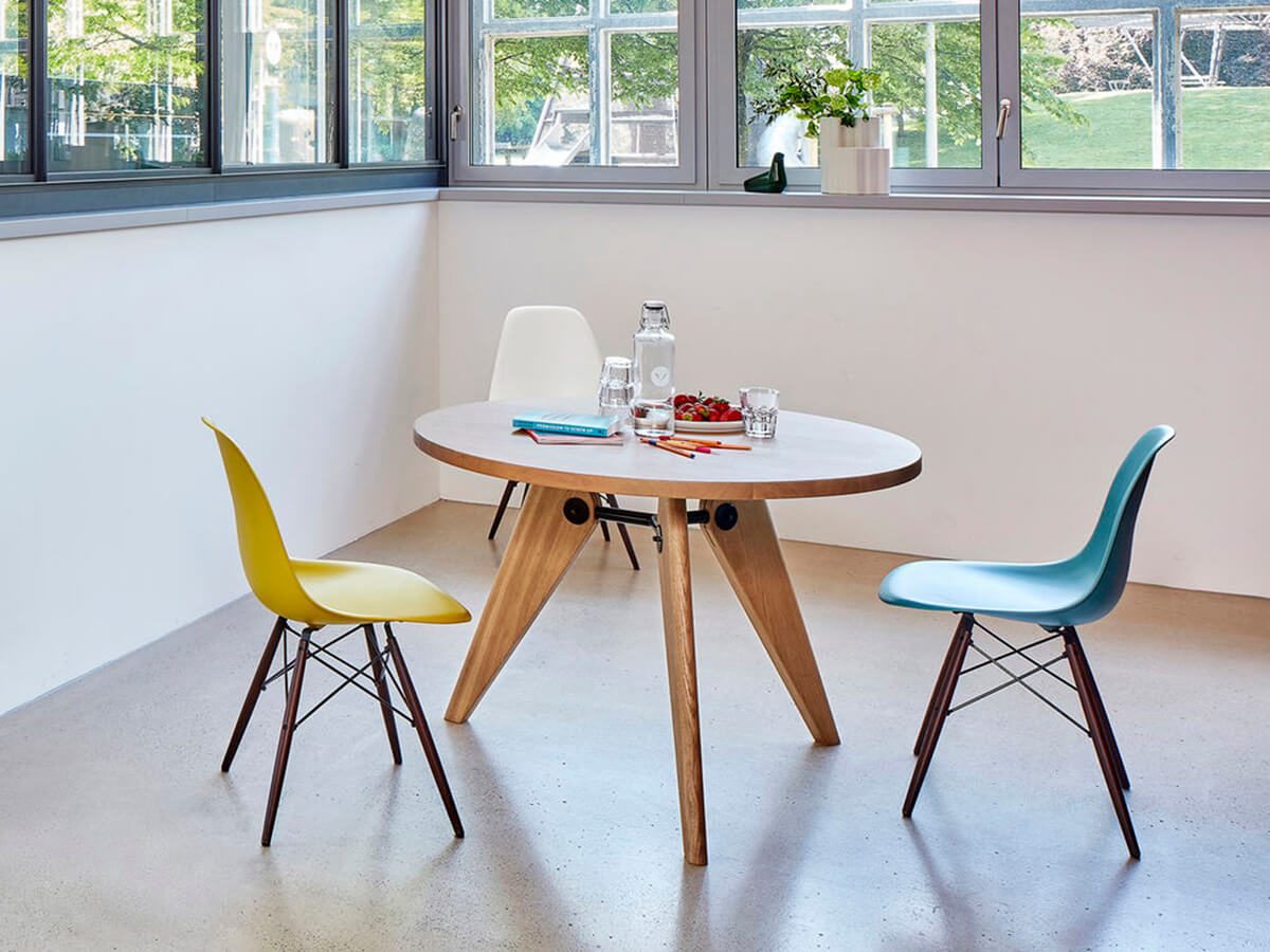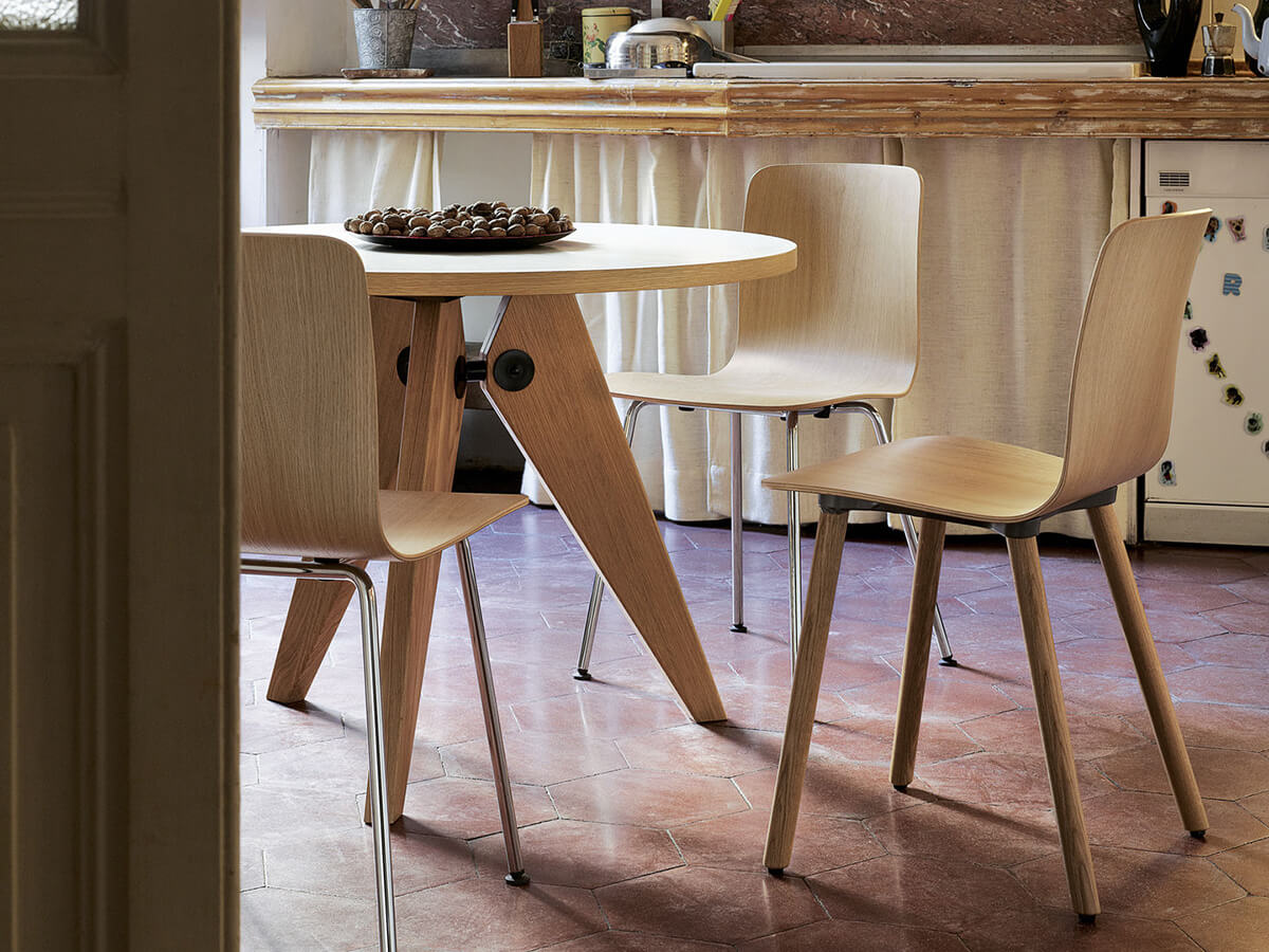L’estetica di Jean Prouvé delinea nel 1949 le forme di questo tavolo dalle forme acute e svettanti, dove forte si percepisce il taglio ingegneristico del suo creatore. La filosofia di Guéridon si colloca all’interno delle altre numerose opere di Prouvé, celebri per definire le strutture non solo in base all’estetica ma anche e soprattutto all’utilizzo quotidiano. Questo tavolo rotondo presenta un top in legno massello e gambe abbinate, rigorosamente articolate a formare un supporto resistente all’uso quotidiano. Questa proposta dal gusto squisitamente classico non disdegna ambienti anche moderni, collocandosi come voce fuori dal coro in situazioni di stile eterogeneo.