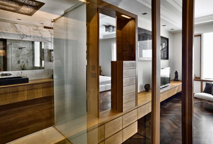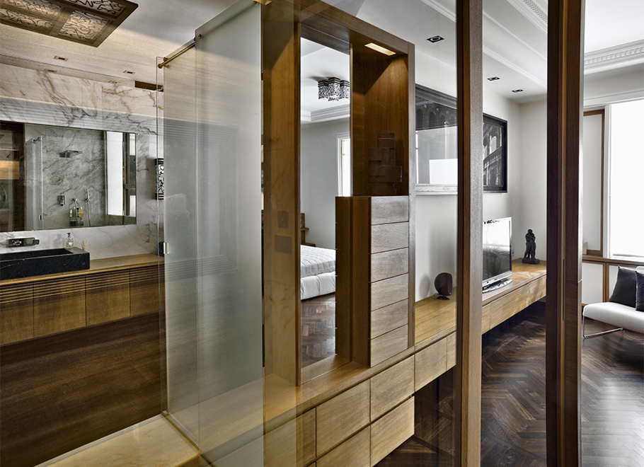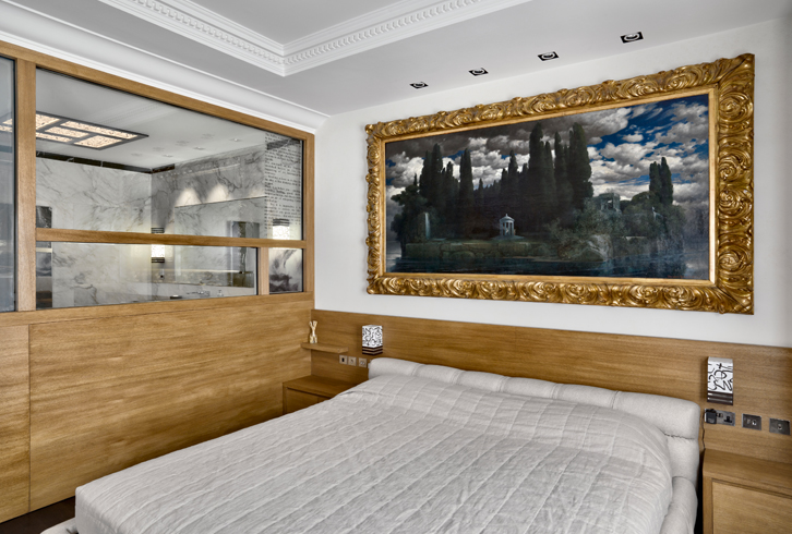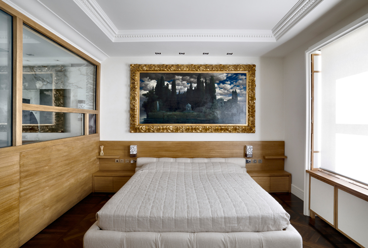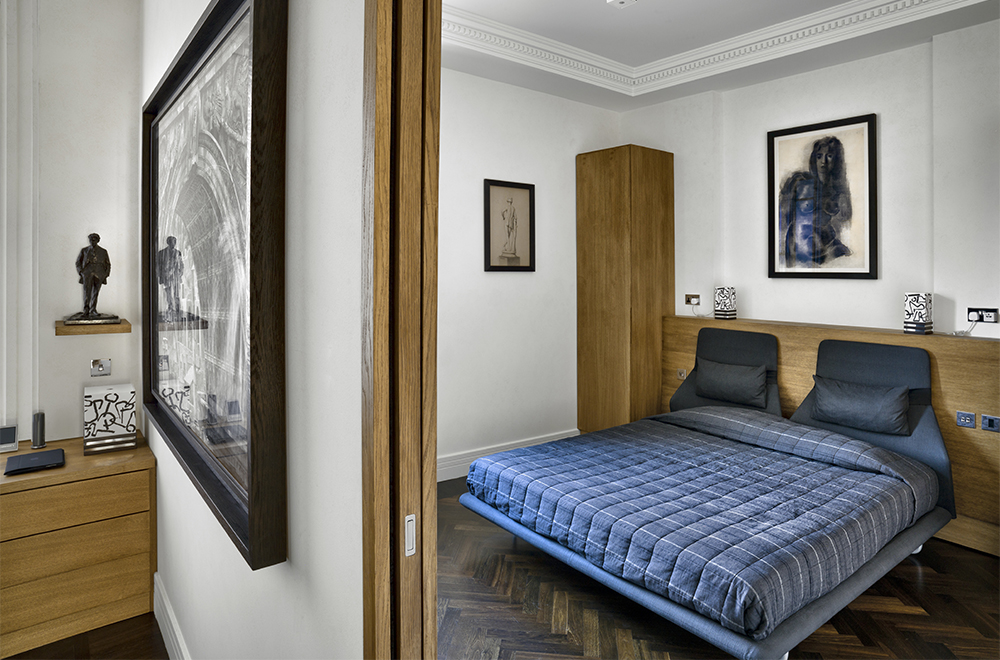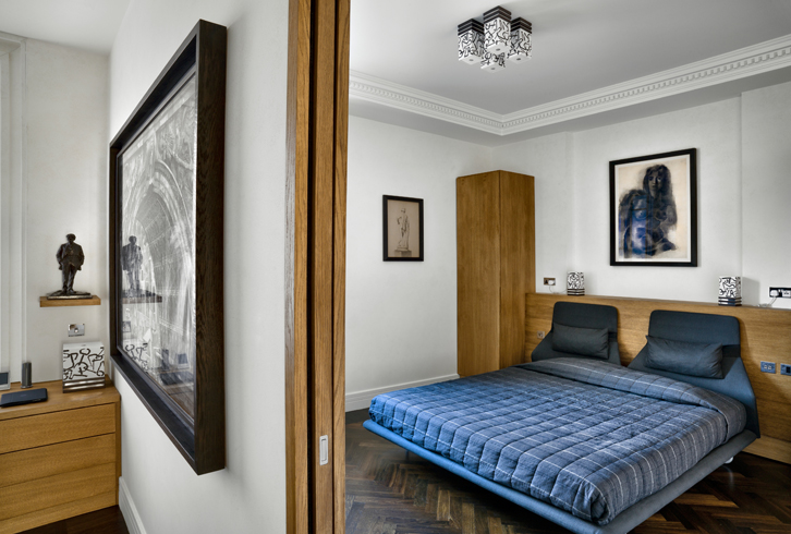 La zona notte è completamente realizzata su misura con la testata del letto e una parete in rovere oliato. Il bagno adiacente riceve luce dalla finestra della camera padronale attraverso un vetro Priva-Lite di Saint-Gobain, che può passare da trasparente a opalino a seconda delle esigenze.
