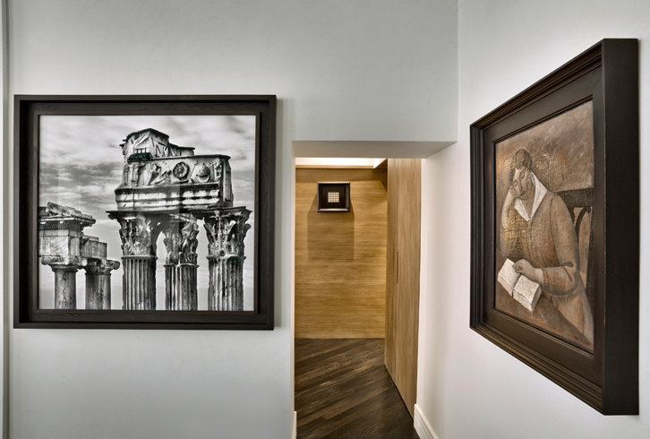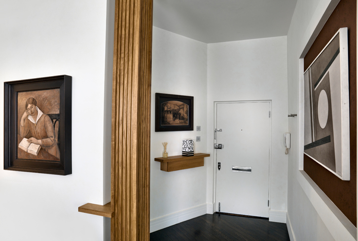 L’architetto è intervenuto inserendo cornici di gesso a soffitto e una pavimentazione in rovere fumigato che restituiscono alla casa il senso di appartenenza alla sua epoca.
