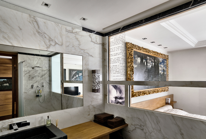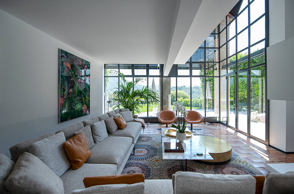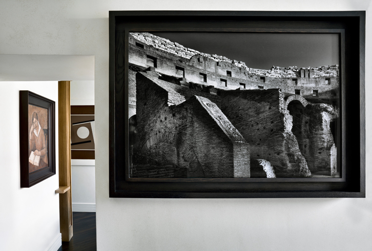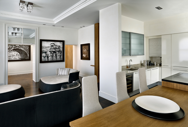 Nella zona giorno convivono atmosfere d’epoca con la presenza dei prodotti contemporanei di Patricia Urquiola per B&B Italia. Le pareti sono decorate con stampe fotografiche di Pino Musi.
