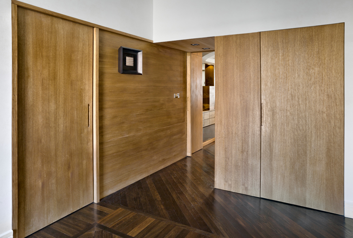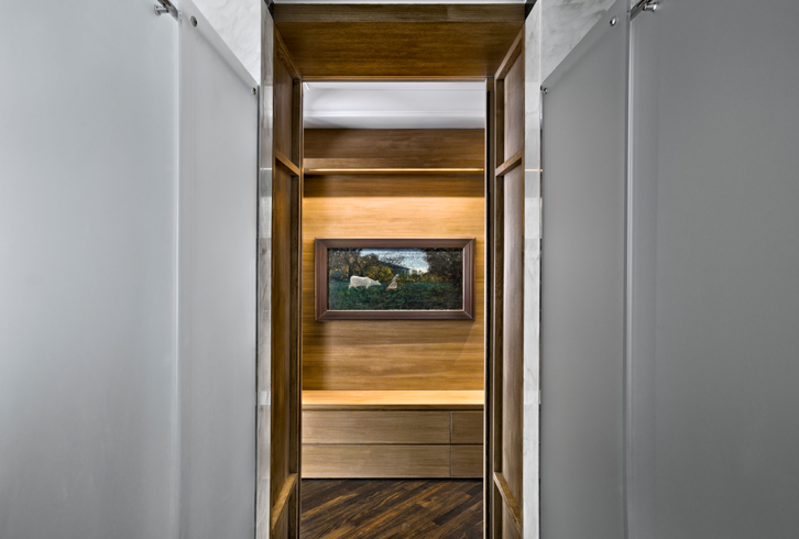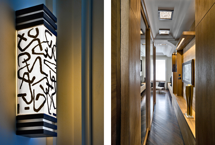 Nel corridoio pannelli scorrevoli in rovere e a specchio danno accesso a capienti vani con funzione di armadio.