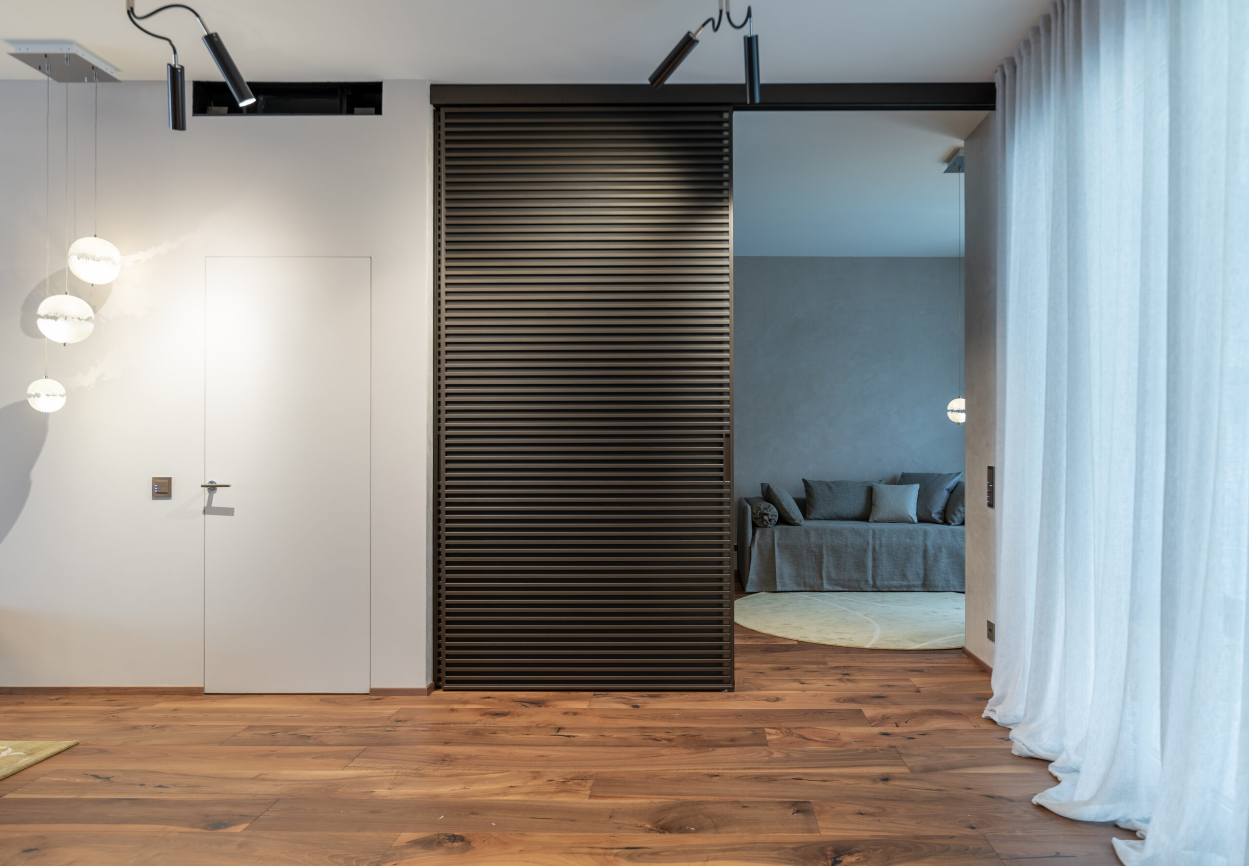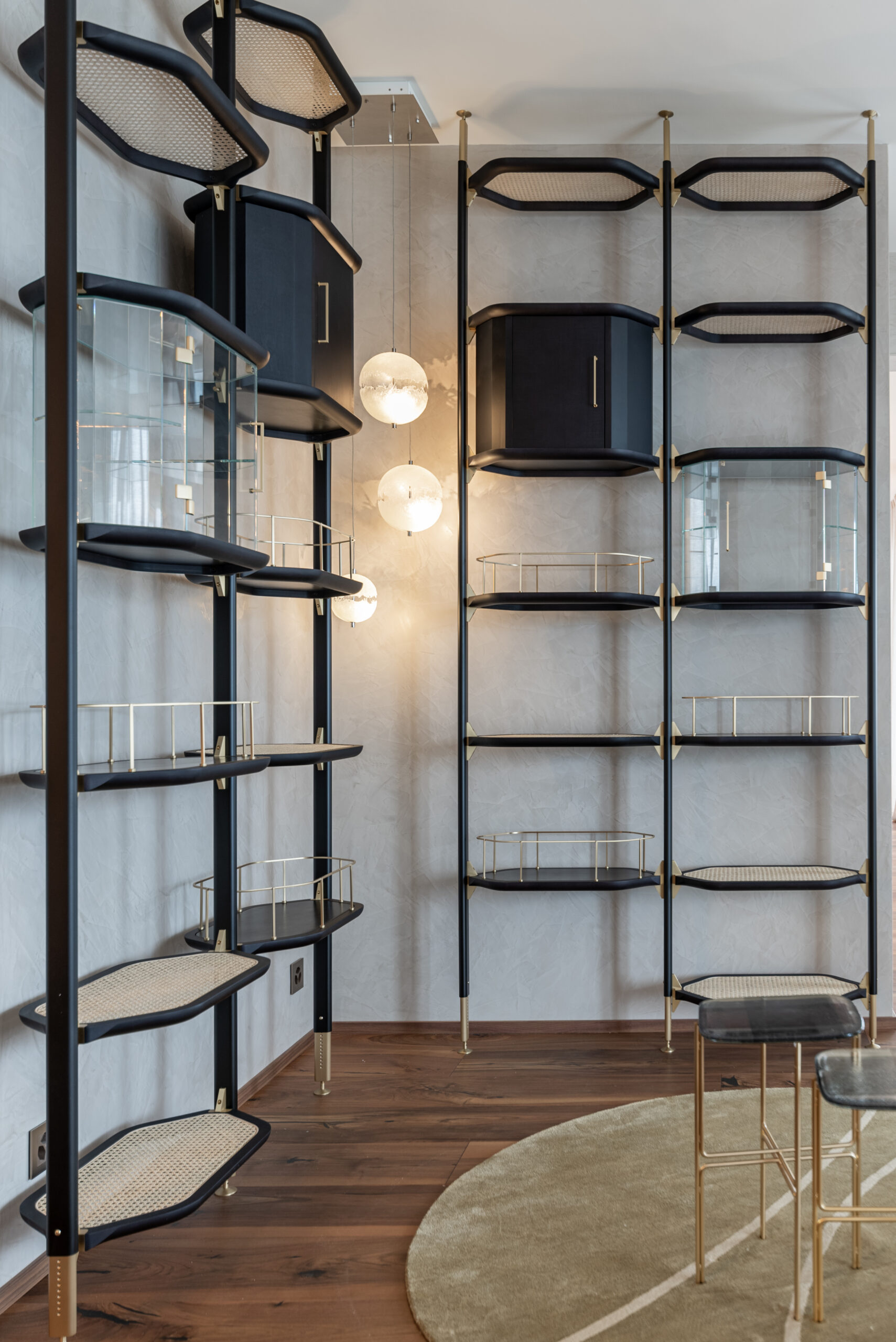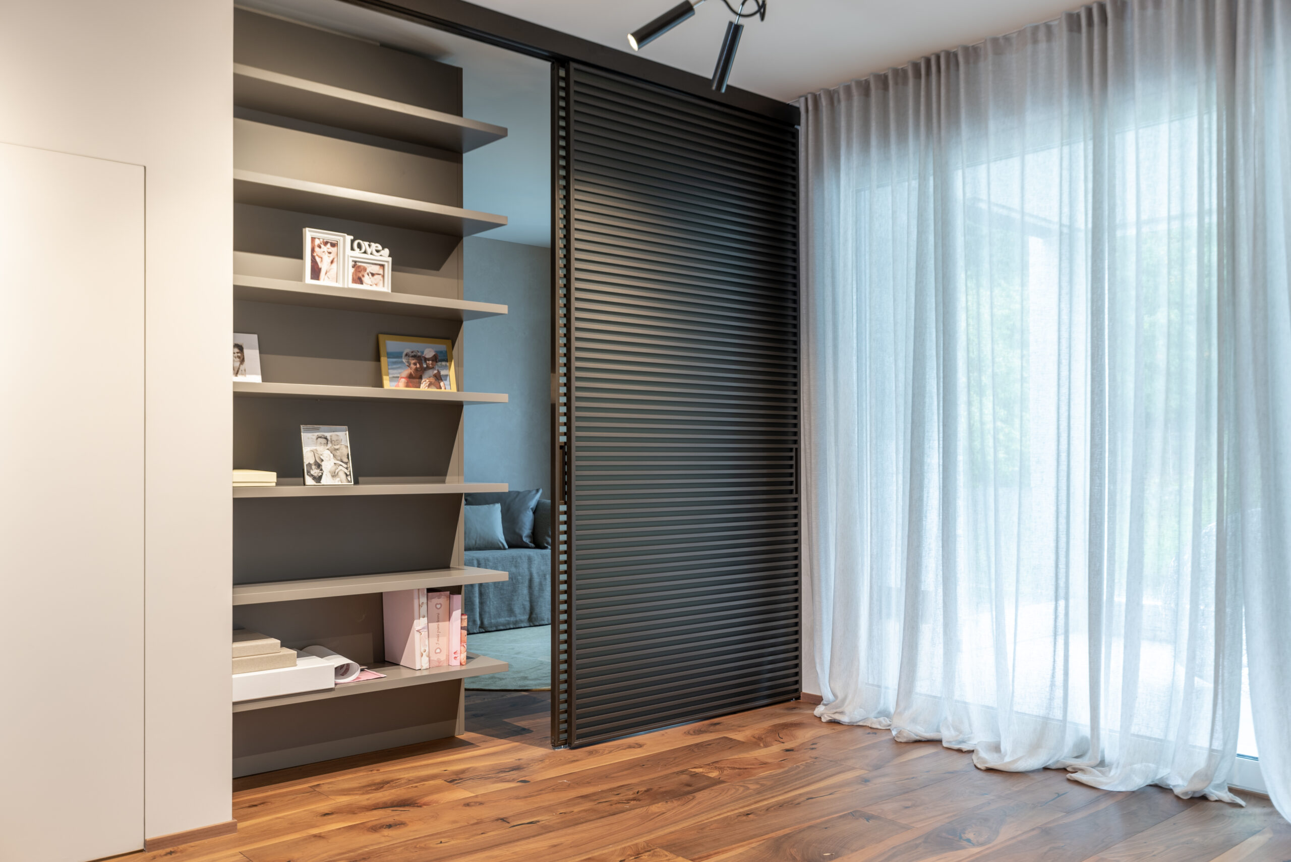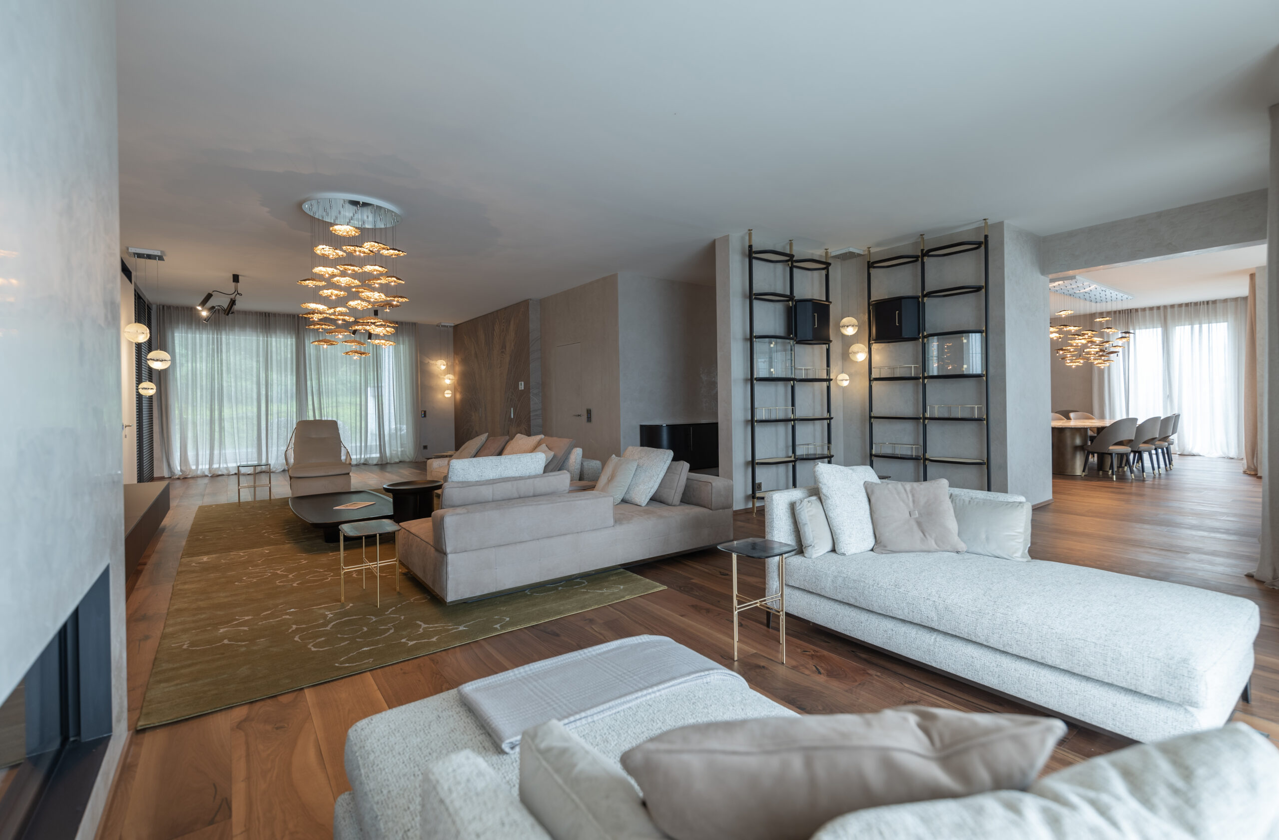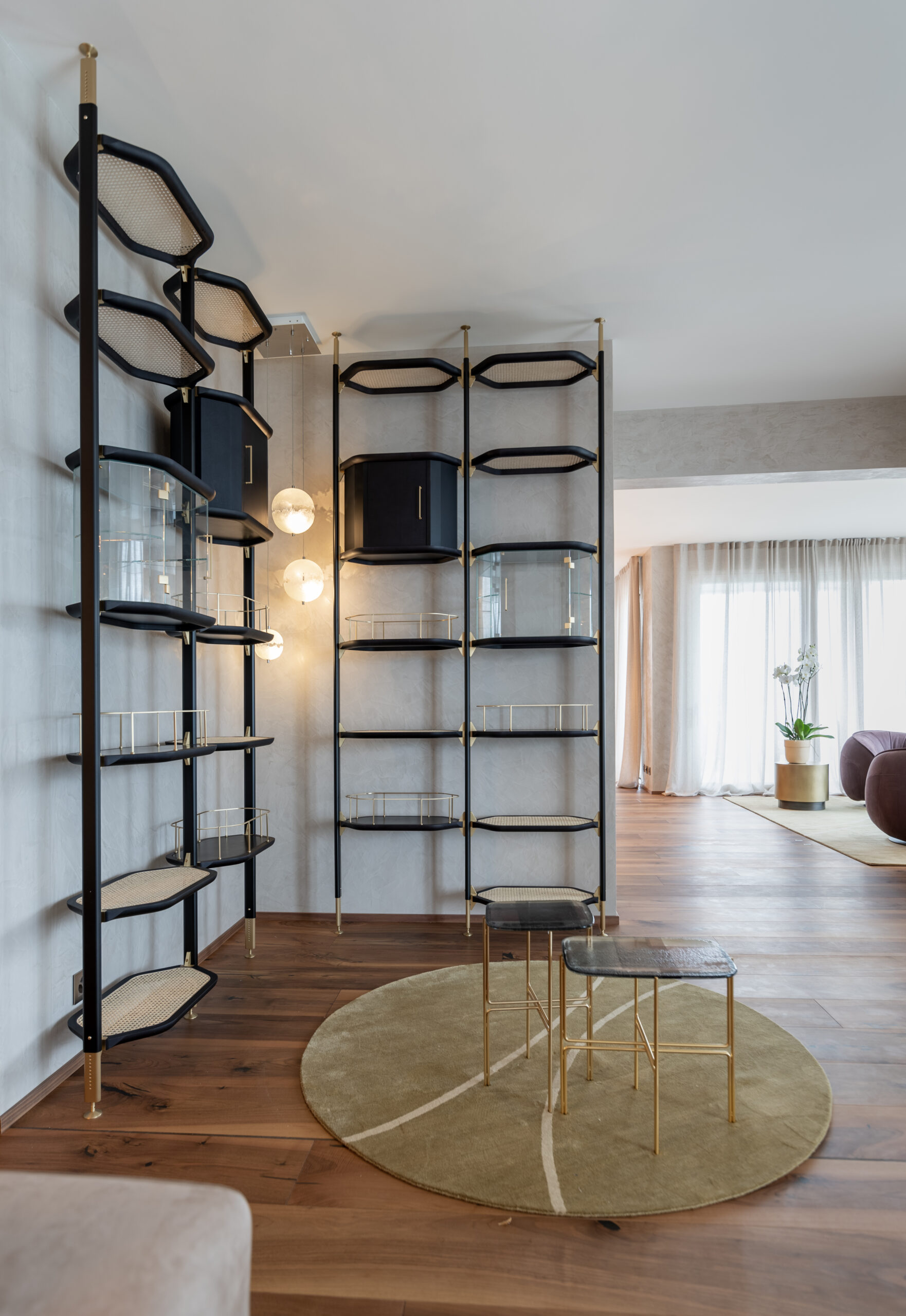 Ampia e ariosa, la zona giorno è la prima ad accogliere il visitatore, offrendogli un delicato assortimento di imbottiti Baxter e Minotti a loro volta coadiuvati da preziosi tappeti del marchio Kristiina Lassus in sfumature senape e sabbia. La composizione creata si presta a numerosi utilizzi, dai più conviviali e ricreativi ai più rilassanti grazie alla presenza di un ampio mobile tv Rimadesio e un caminetto poco distante, ideale per atmosfere e situazioni più intime. La scelta di nuance neutre coadiuvate da tavolini e complementi in legno non è casuale, ma volta a impostare un ambiente rilassante e poco impattante a livello visivo così da lasciar posto ai veri protagonisti della scena: le persone, il conversare, la quotidianità. Interessanti sono gli spunti offerti dalla parete scorrevole Rimadesio che dà sulla stanza ospiti, la carta da parati Glamora che arricchisce e nasconde la porta d’ingresso e l’ampia libreria a soffitto Baxter, ideale connessione fra zona giorno e sala da pranzo.
