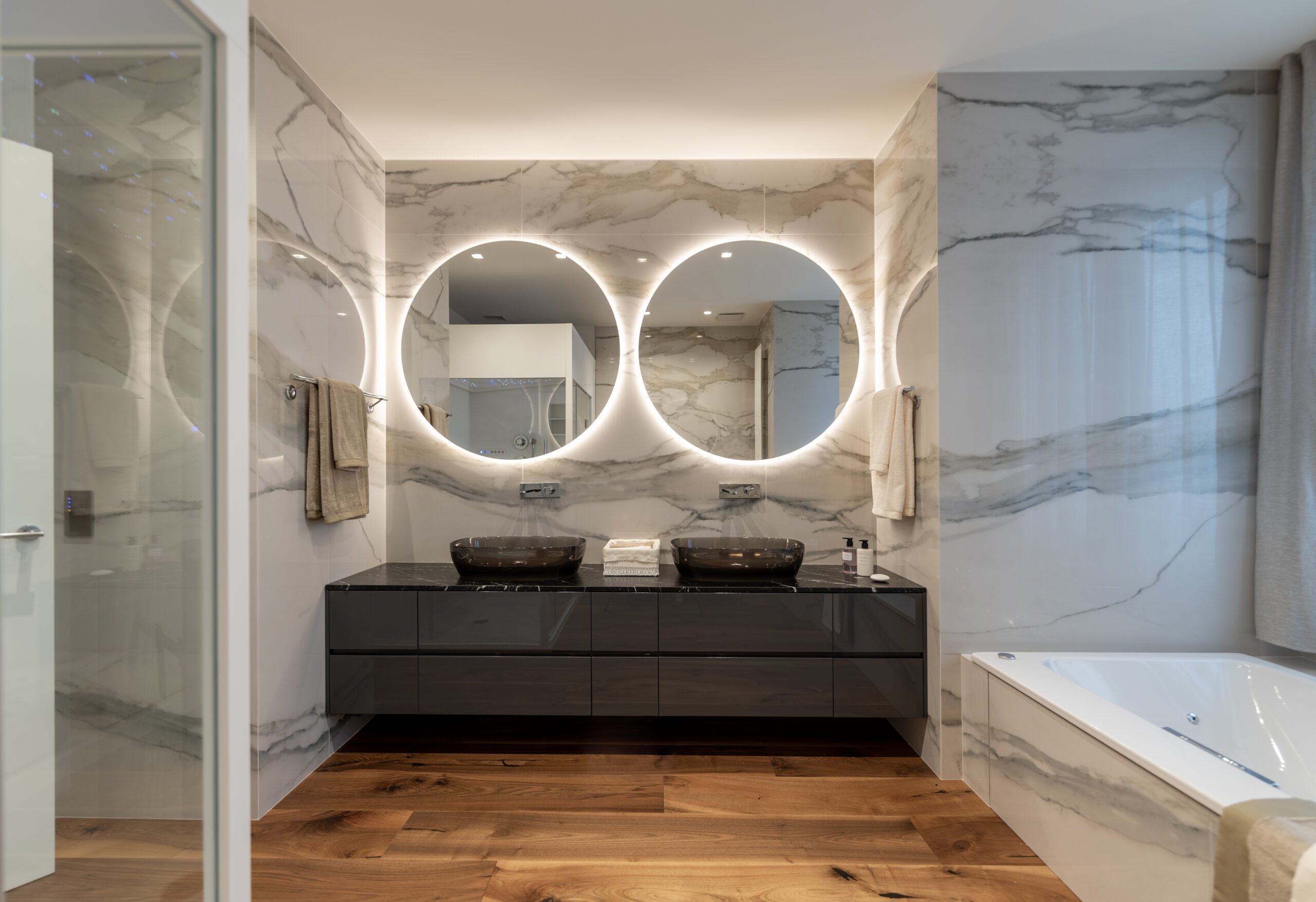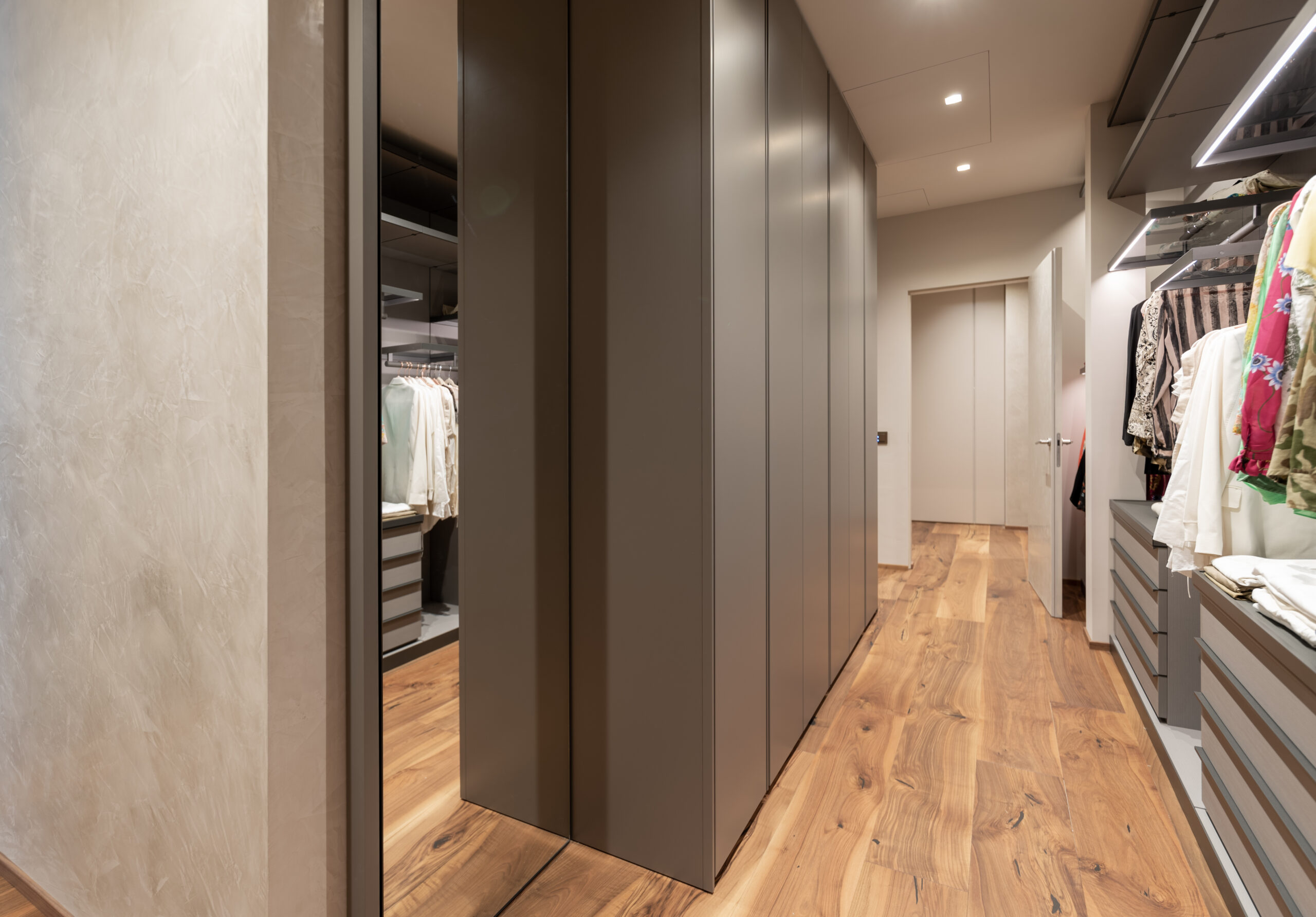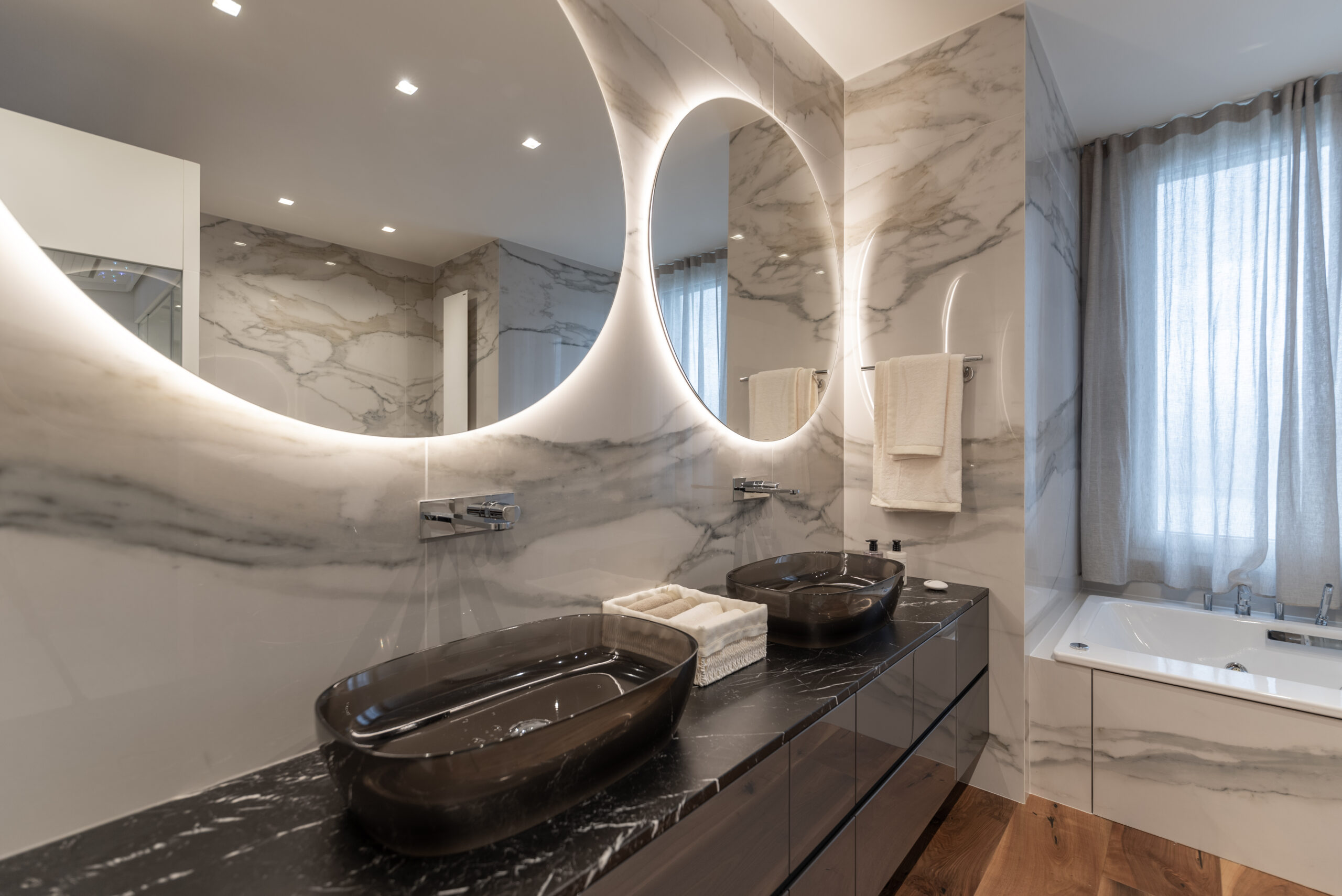 In ogni ambiente la scelta minuziosa di arredi provenienti dalle più prestigiose aziende di design internazionale si alterna a realizzazioni su misura di alta ebanisteria che Salvioni ha commissionato a esperti del settore la cui esperienza ha saputo incontrare al meglio le esigenze del committente. Ogni stanza presenta inoltre una scelta coordinata di tessuti e biancherie Roberto Molteni, pensate per creare un linguaggio unico e particolareggiato. I bagni antoniolupi completano le proposte d’arredo offrendo uno spunto di classe anche all’aspetto più riservato della casa.
