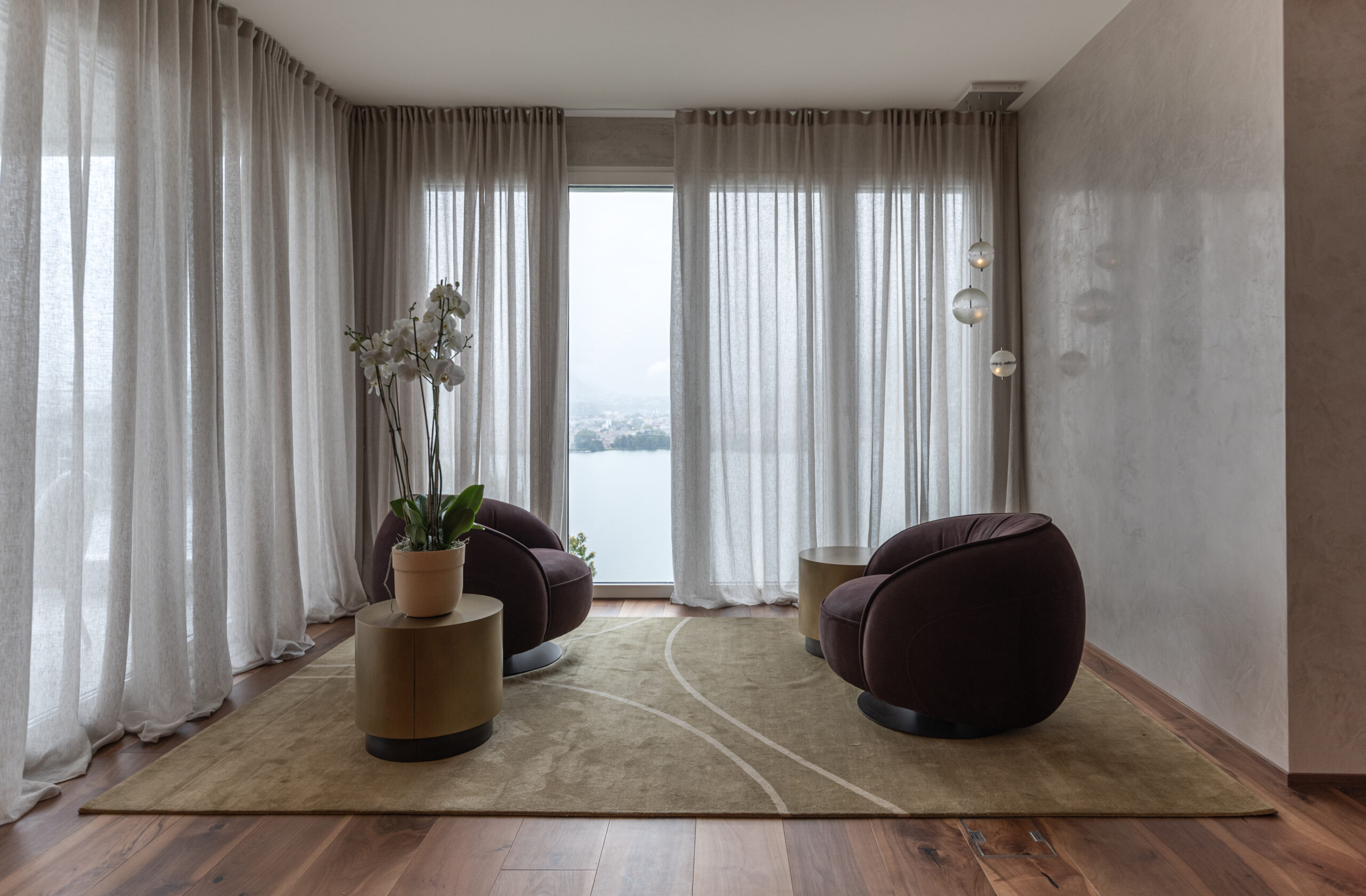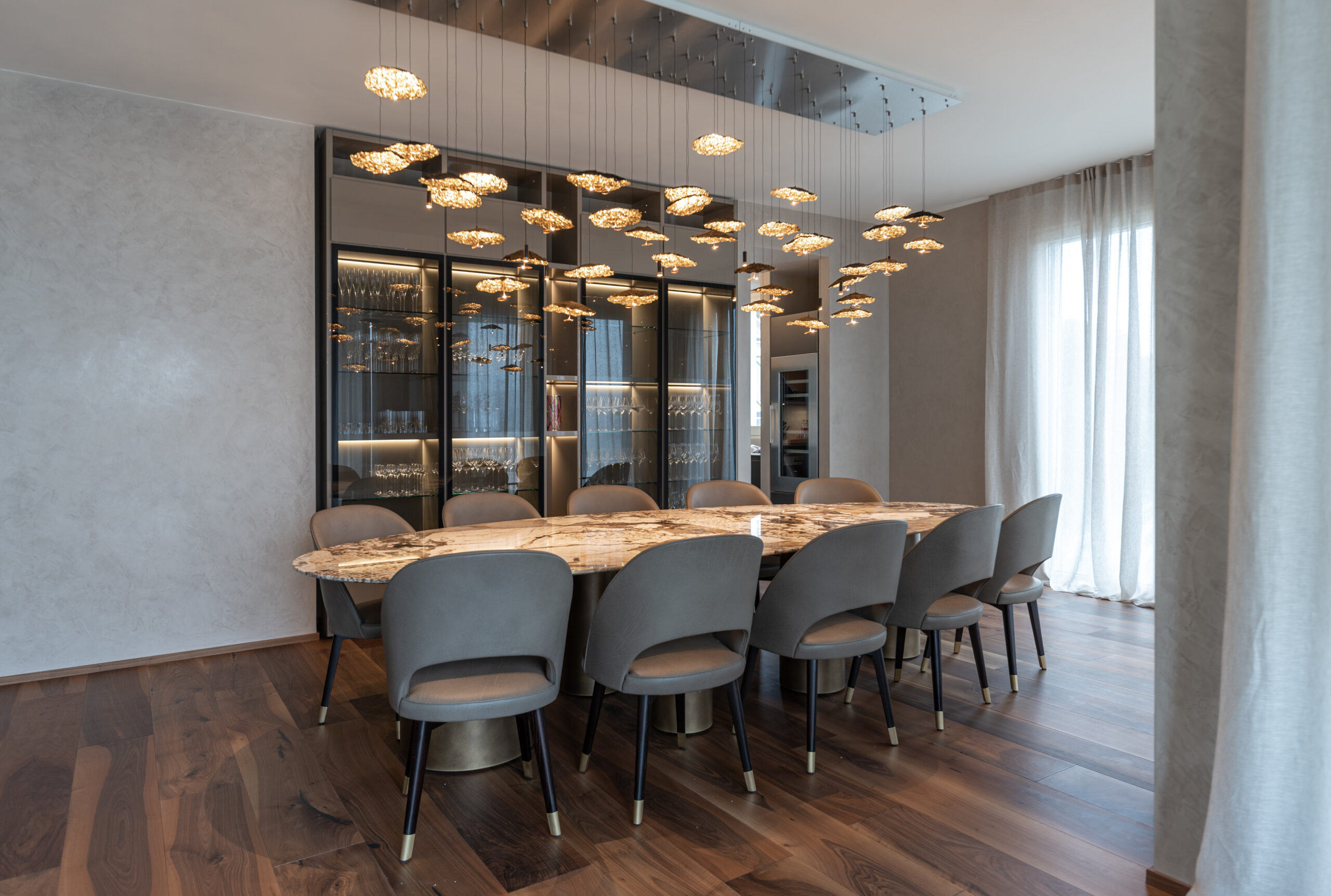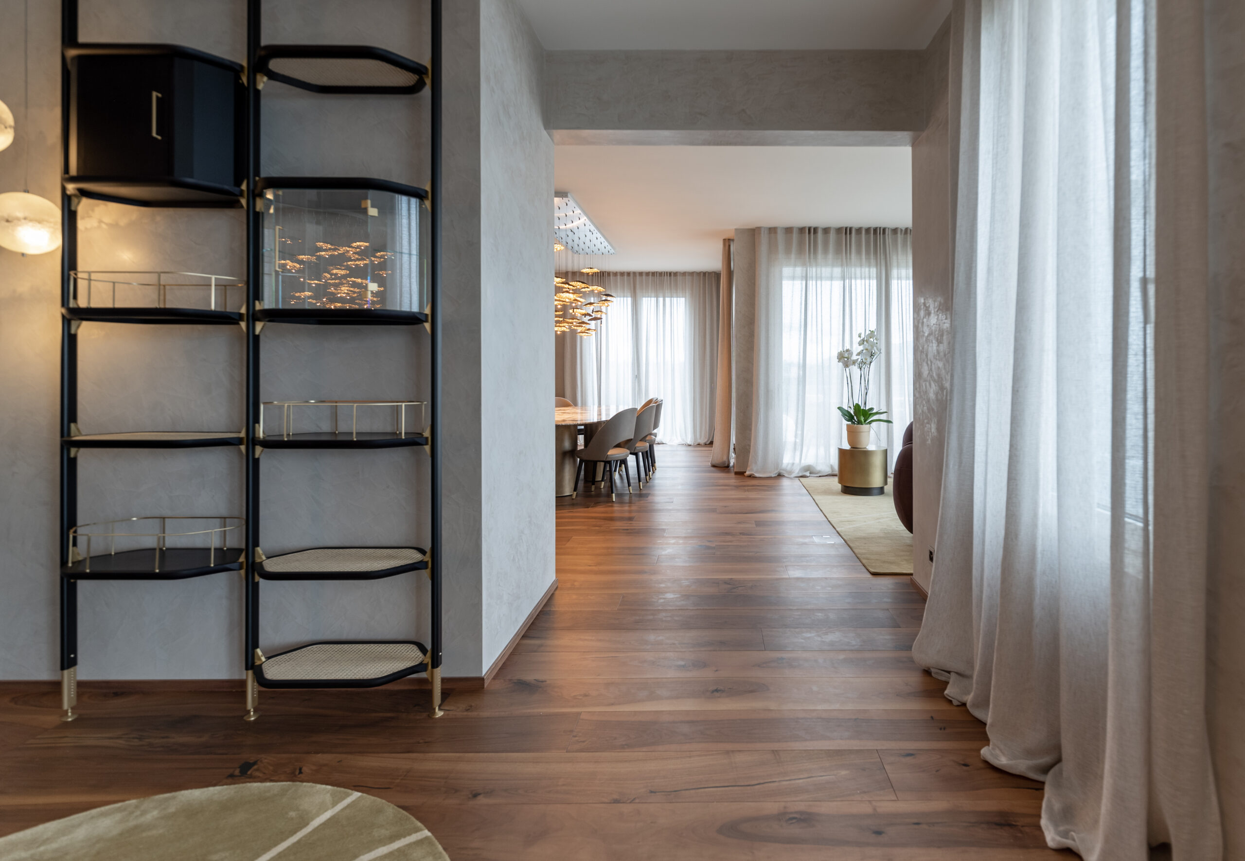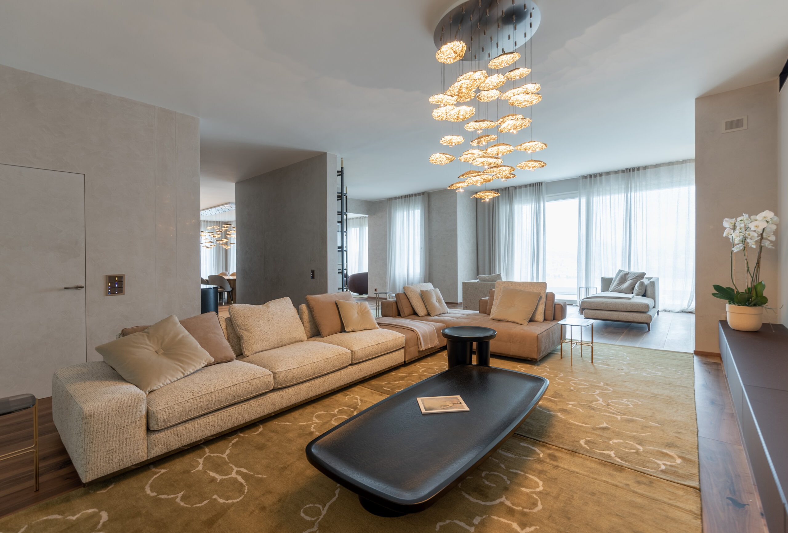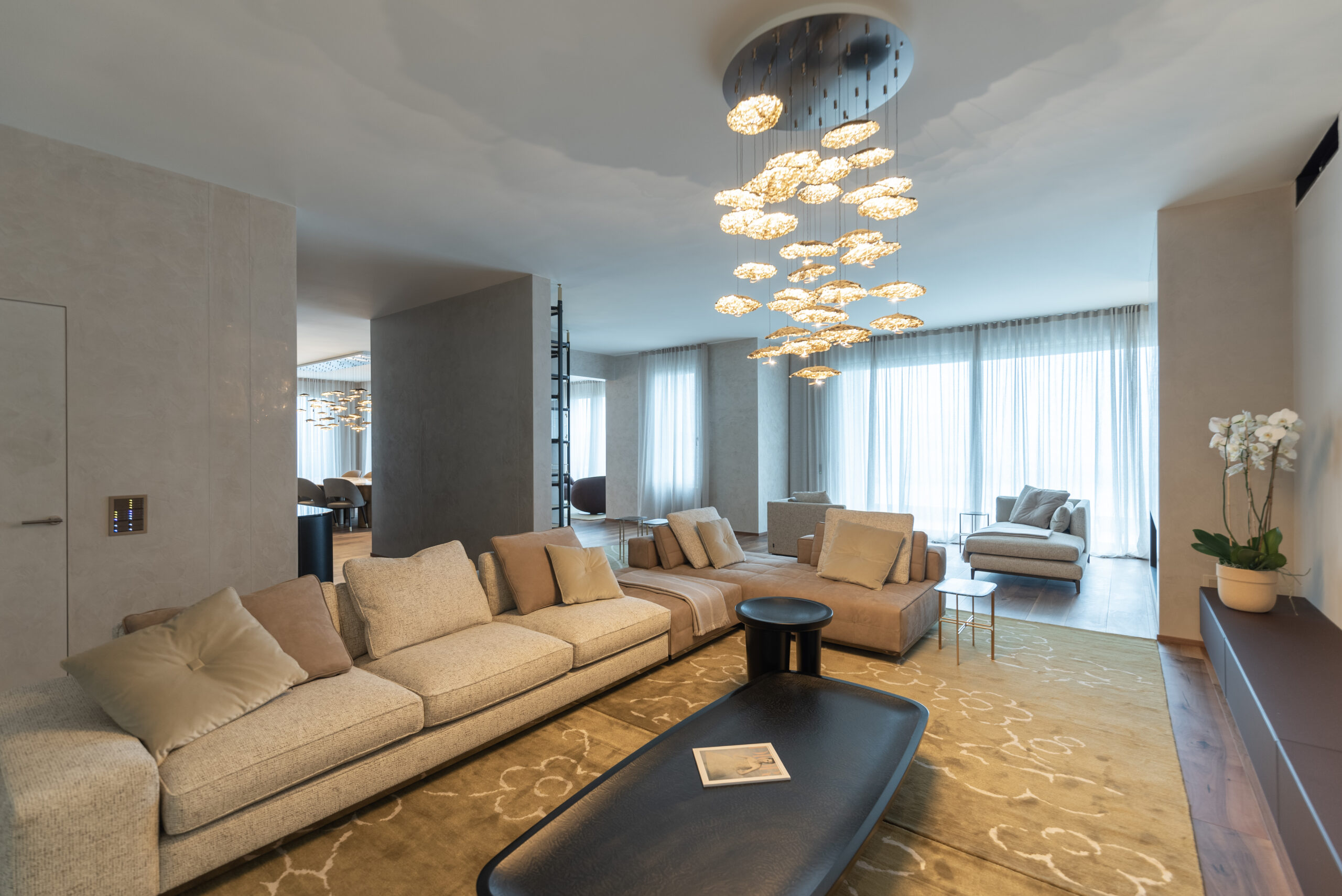 La spettacolare vista di Lugano Paradiso fa da sfondo a questo attico mozzafiato dove design ed eleganza si intrecciano dando vita a uno spazio unico, elegante e soprattutto inaspettato. Il progetto nasce interamente in “casa” Salvioni e si sviluppa grazie a un meticoloso studio delle proporzioni dove determinanti sono state le esigenze del cliente e le diverse funzionalità attribuite a ogni ambiente. L’attenzione verso i dettagli si è coniugata a una visione d’insieme volta a considerare i numerosi elementi strutturali quali pavimenti e pareti, fino alle preziose carte da parati Glamora e i tendaggi di Roberto Molteni. Non meno peculiari sono state le scelte dell’illuminazione articolata interamente sul marchio Catellani&Smith e le sue diverse declinazioni di catalogo.