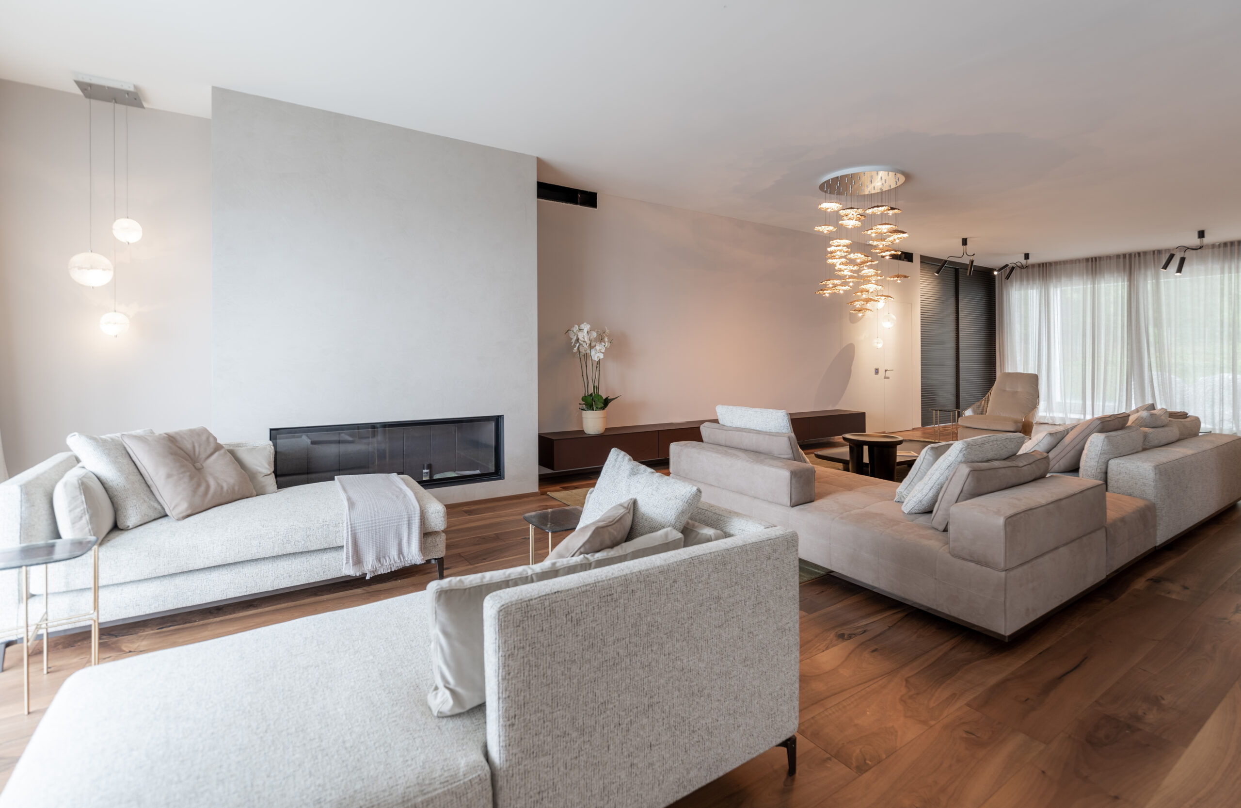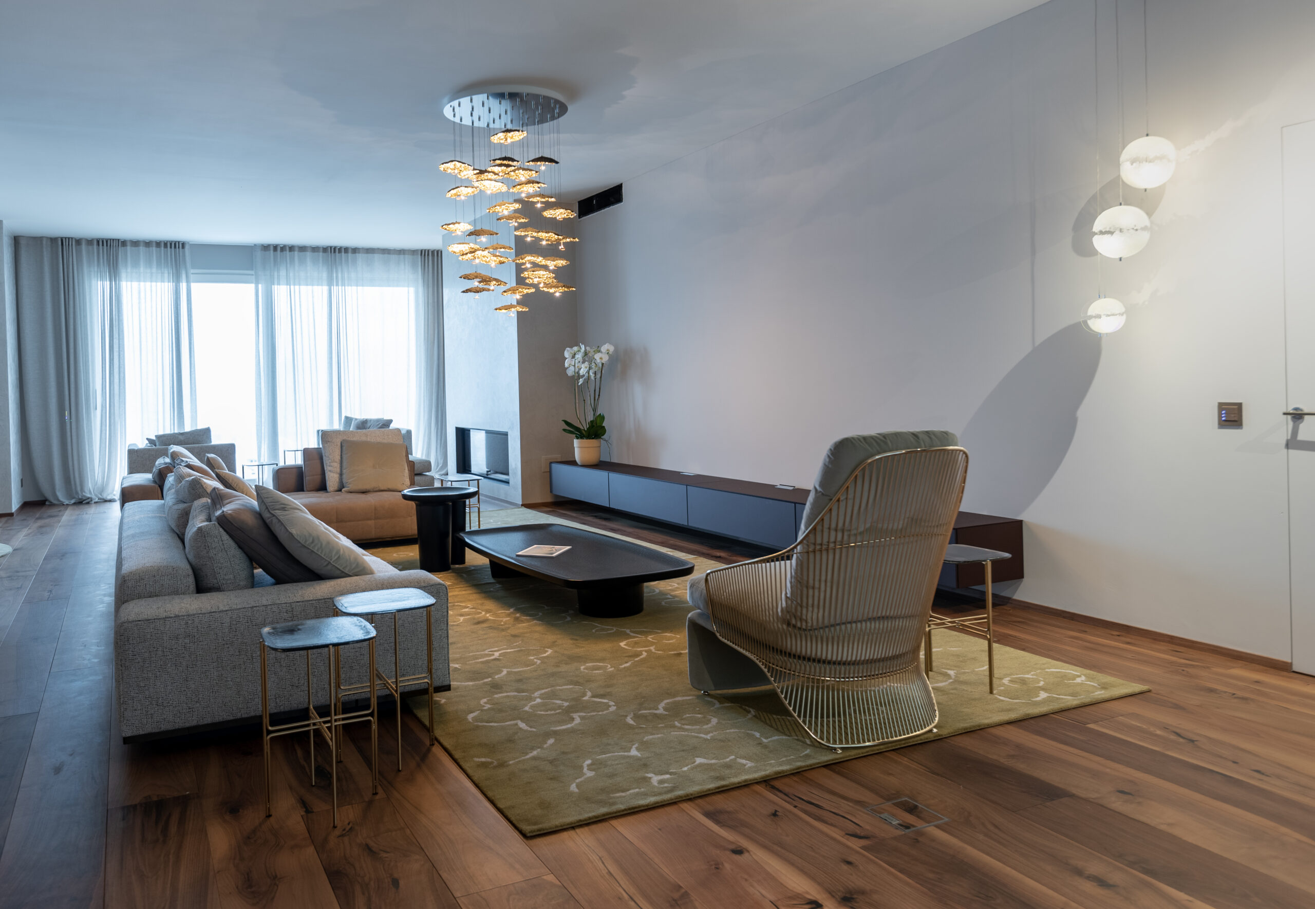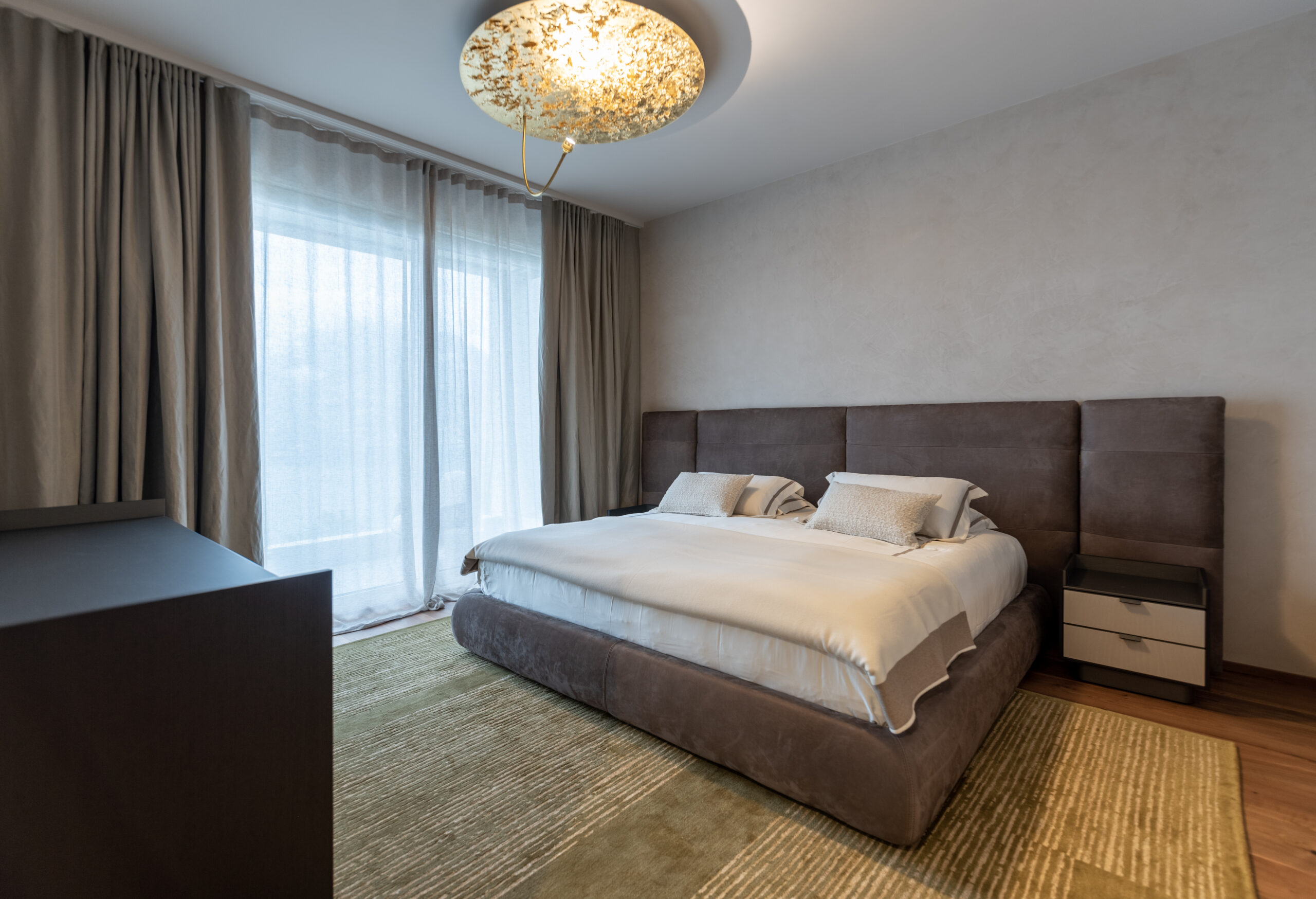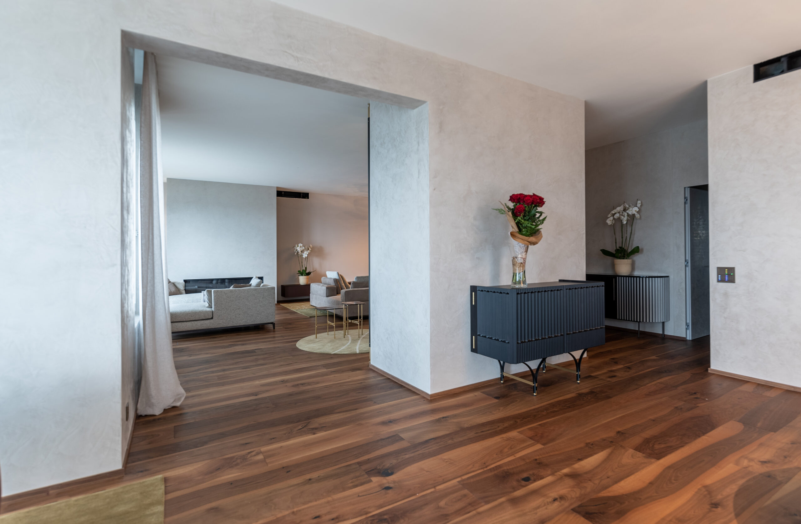 La spettacolare vista di Lugano Paradiso fa da sfondo a questo attico mozzafiato dove design ed eleganza si intrecciano dando vita a uno spazio unico, elegante e soprattutto inaspettato. Il progetto nasce interamente in “casa” Salvioni e si sviluppa grazie a un meticoloso studio delle proporzioni dove determinanti sono state le esigenze del cliente e le diverse funzionalità attribuite a ogni ambiente. L’attenzione verso i dettagli si è coniugata a una visione d’insieme volta a considerare i numerosi elementi strutturali quali pavimenti e pareti, fino alle preziose carte da parati Glamora e i tendaggi di Roberto Molteni. Non meno peculiari sono state le scelte dell’illuminazione articolata interamente sul marchio Catellani&Smith e le sue diverse declinazioni di catalogo.