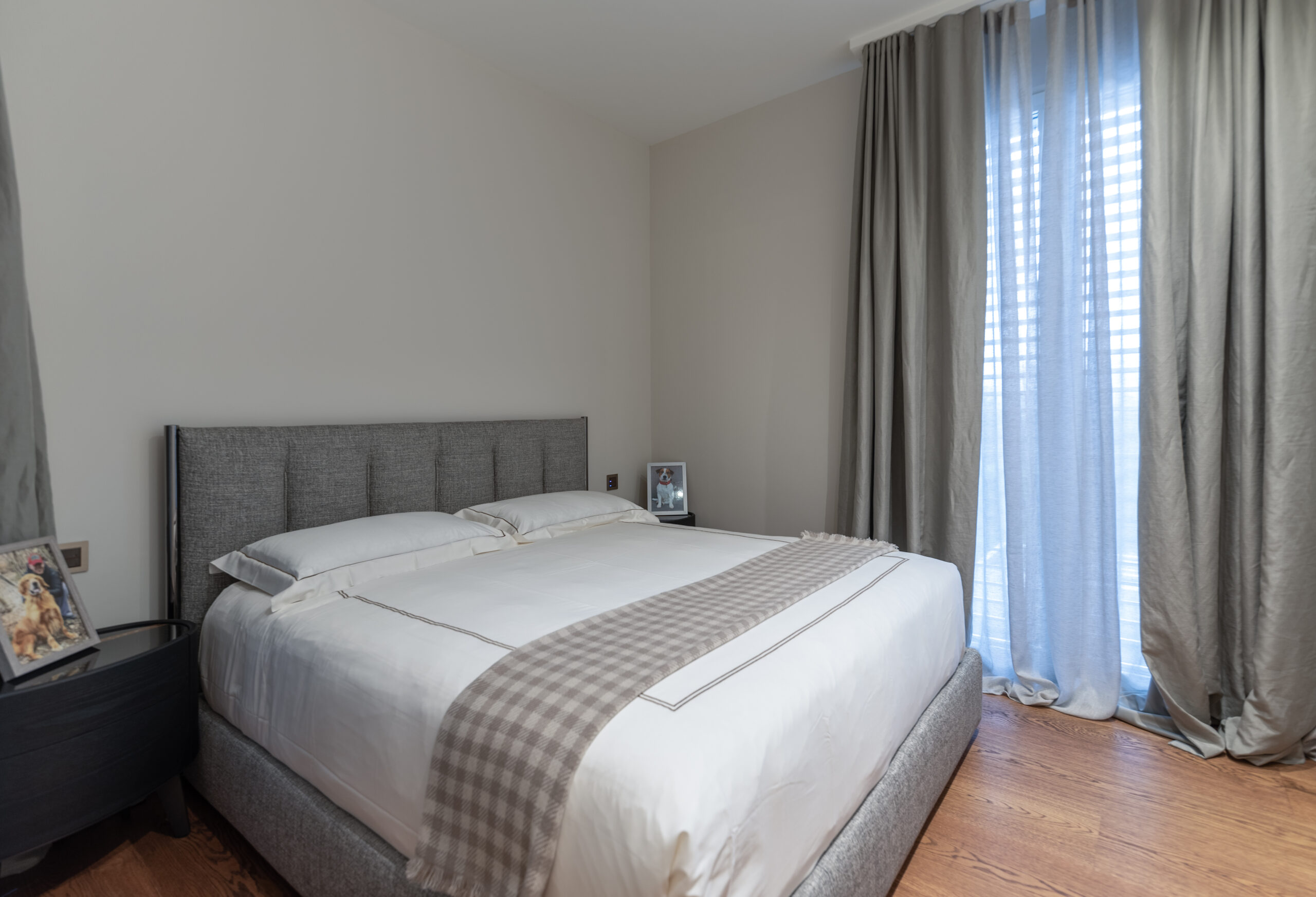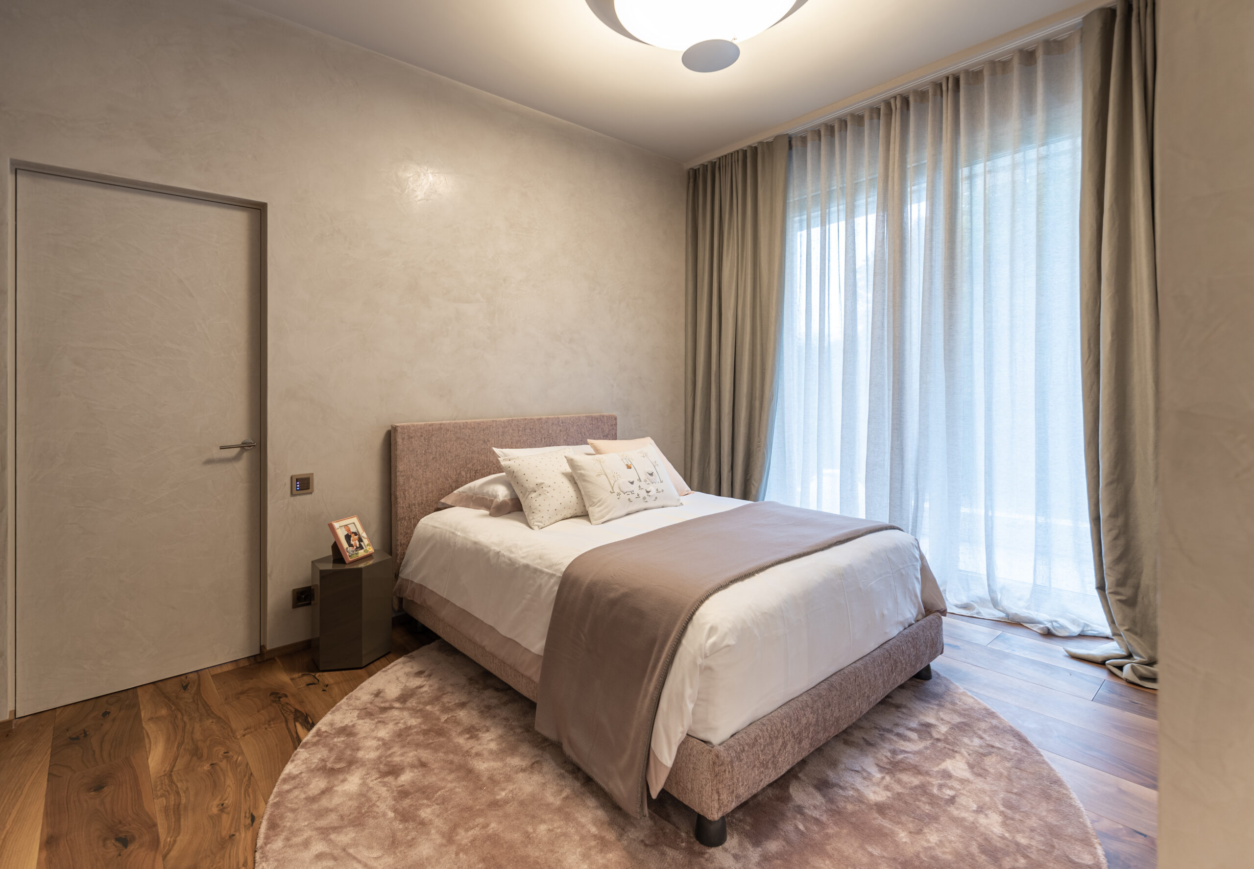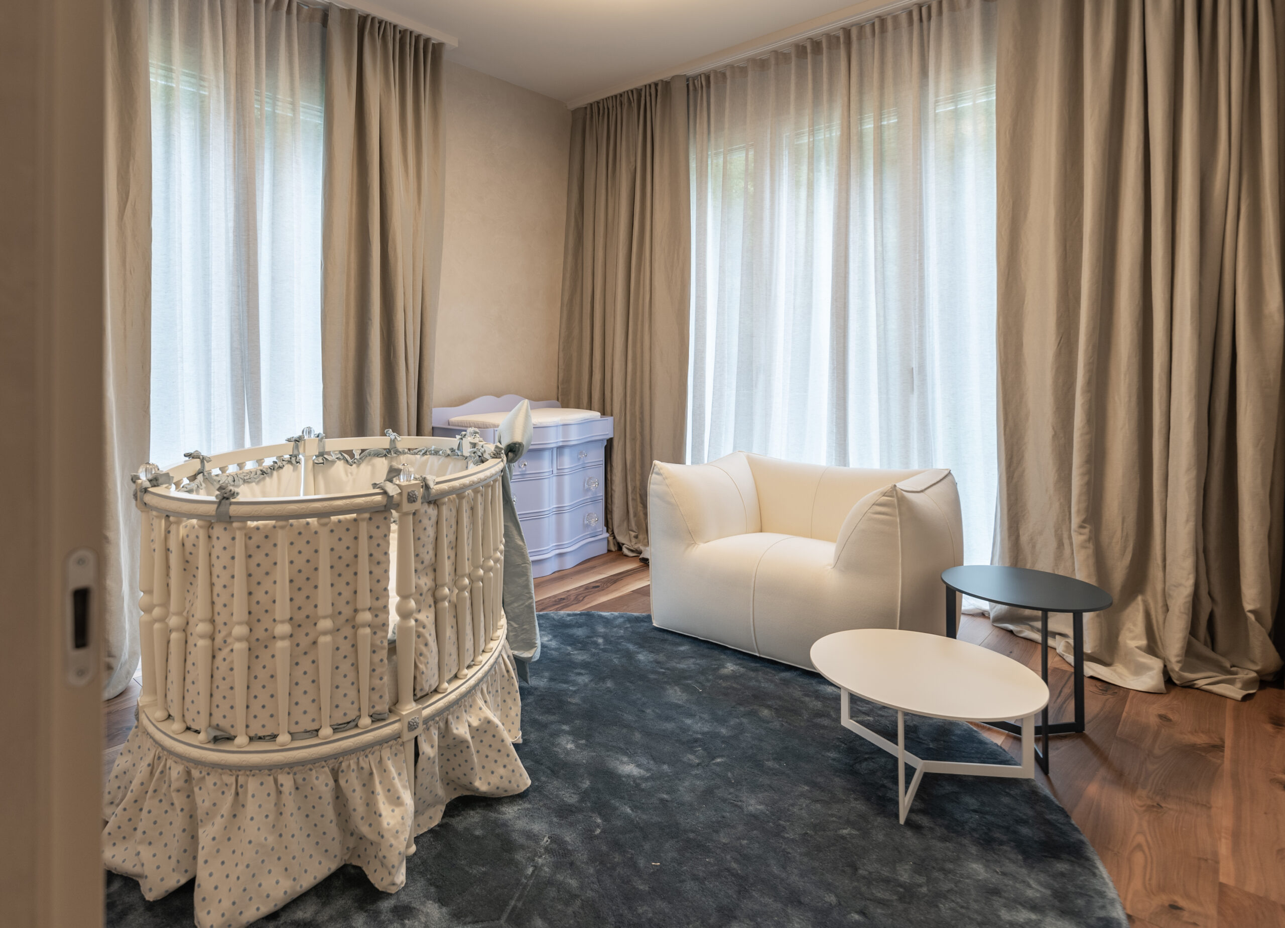 Più intima, la zona notte si snoda in un percorso affacciato su una elegante cabina armadio Poliform dalla quale si giunge all’ampia camera padronale e alle camerette dei bambini. Le nuance qui presenti, pastellate e gentili, sono state scelte per esaltare i gusti e la personalità dei diversi componenti della famiglia, offrendo per ogni camera un assortimento di letti, tappeti e armadi volti a rispecchiare le abitudini di ognuno. I preziosi tappeti di Kristiina Lassus si alternano a scelte squisitamente minimali offerte dal catalogo di GT Design. Il grande letto matrimoniale Baxter con contenitori Minotti della camera padronale coordina le proporzioni più contenute del due piazze Flou e del delizioso lettino Dolfi, vera e propria chicca dal gusto retrò.