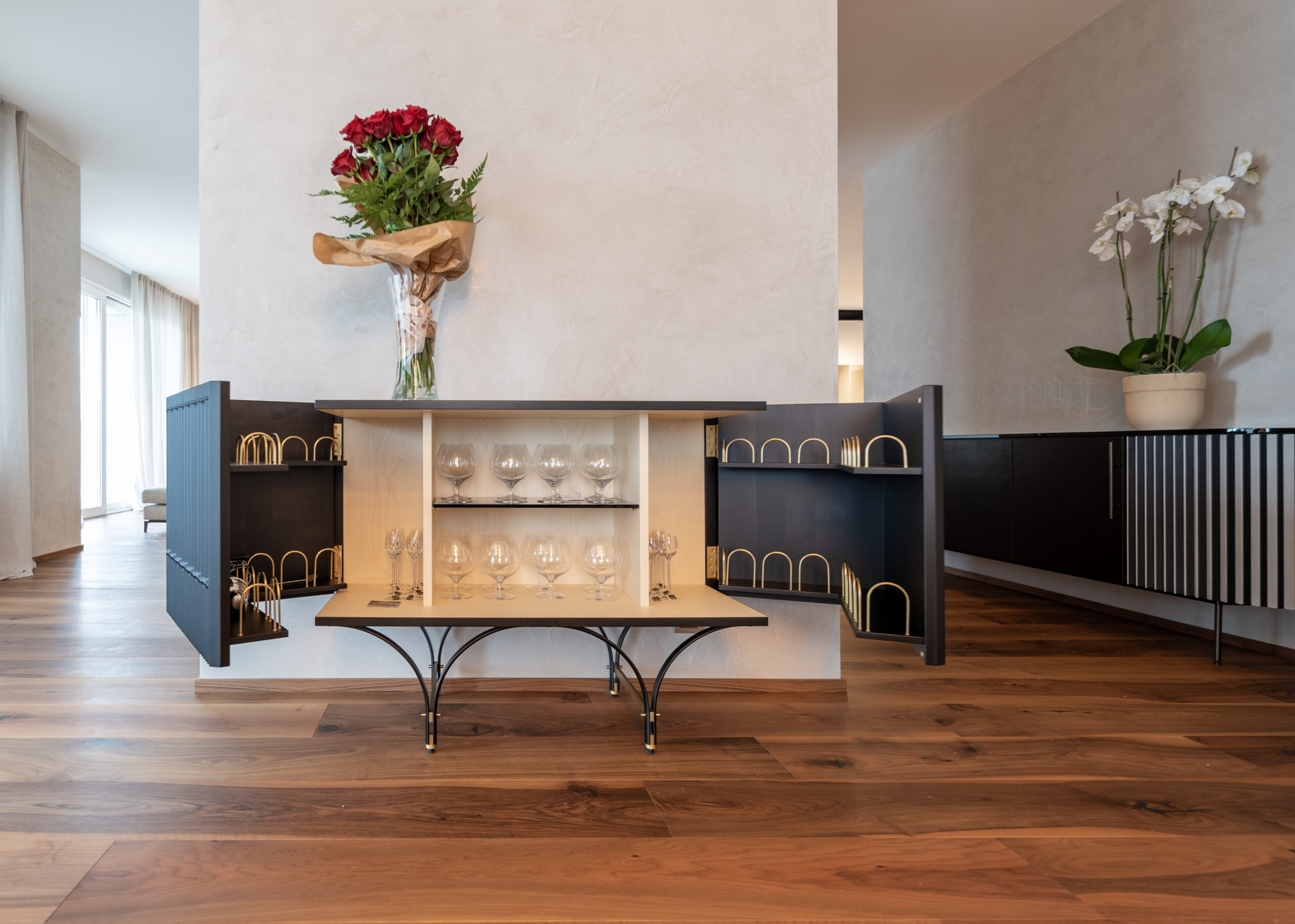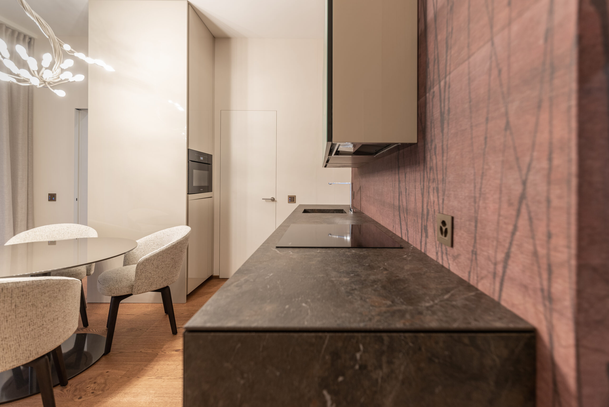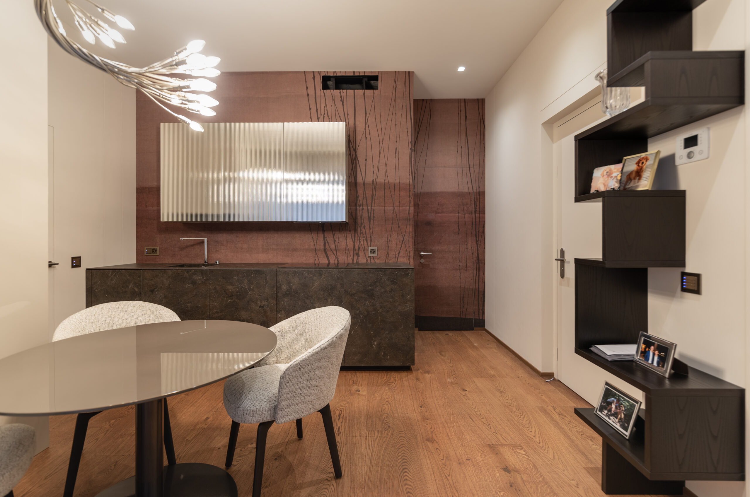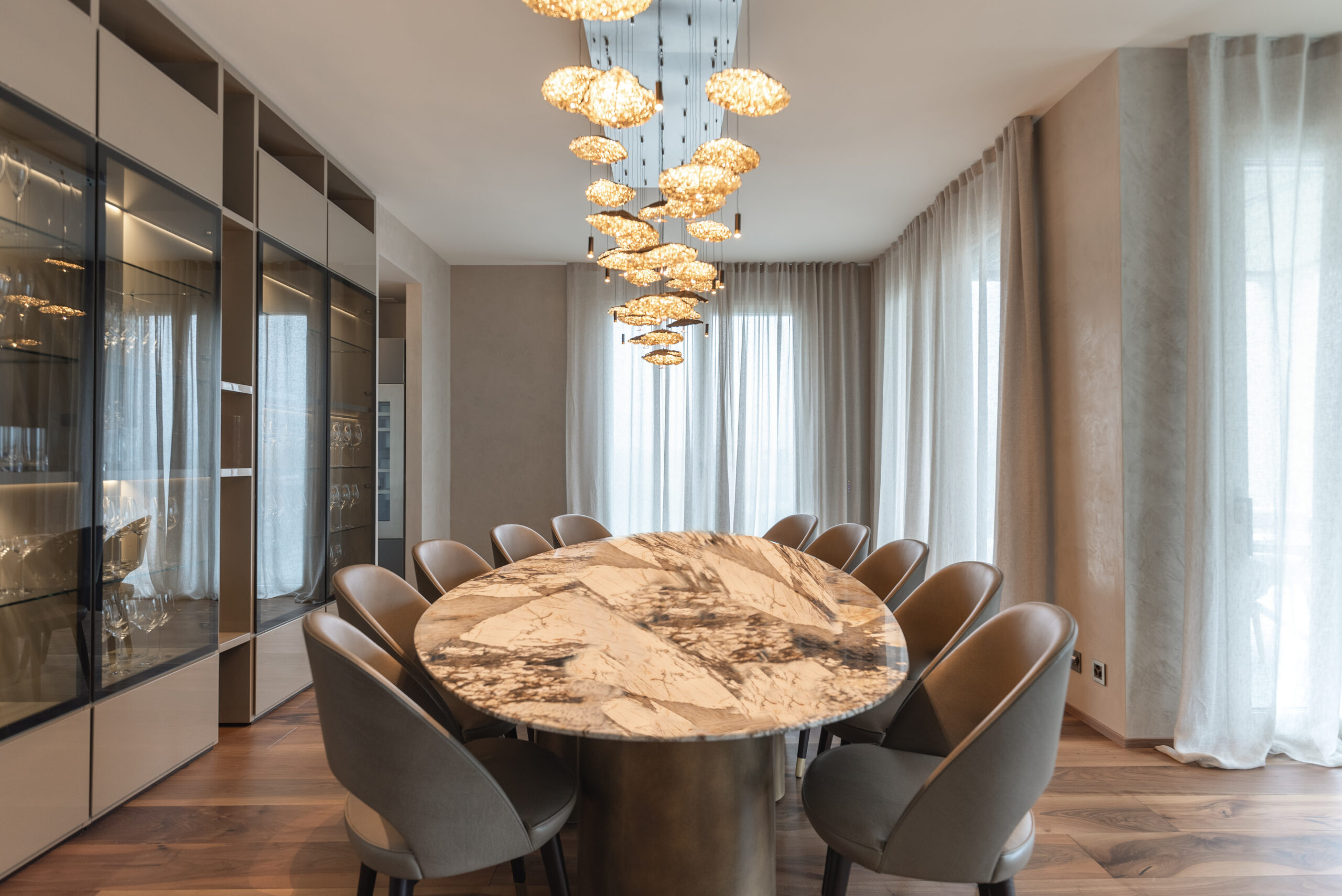 Un imponente tavolo Baxter accoglie il visitatore nella sala da pranzo arricchita da un ampio contenitore a vetri Poliform dove è possibile ammirare un assortimento di calici per vini rossi e bianchi declinati in tutte le più squisite diramazioni di gusto. Poco distante si dipana uno spazio relax con poltroncine e tavolini Baxter affacciati sul panorama mozzafiato di Lugano Paradiso e uno spazio più riservato, dedicato ai professionisti della casa, con una cucina sullo sfondo di una carta da parati Glamora.