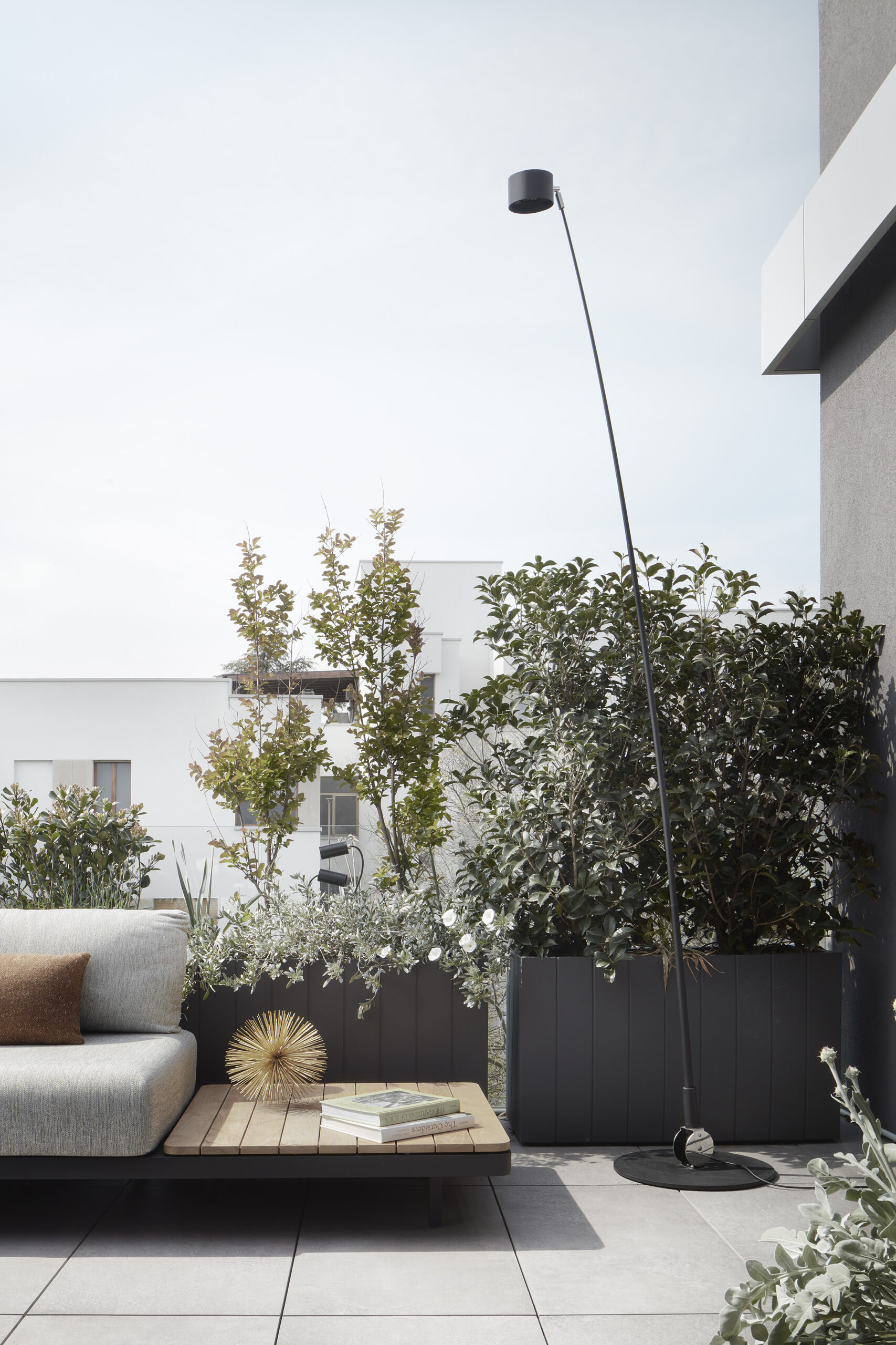Un’ultima suggestione è offerta dalla terrazza ricca di piante multiformi e profumi mediterranei che come un piccolo hortus conclusus domestico invita a godersi l’illusione di un’oasi di pace lontana dalla città. Divanetti e tavolini di Royal Botania creano uno scorcio di estremo pregio.