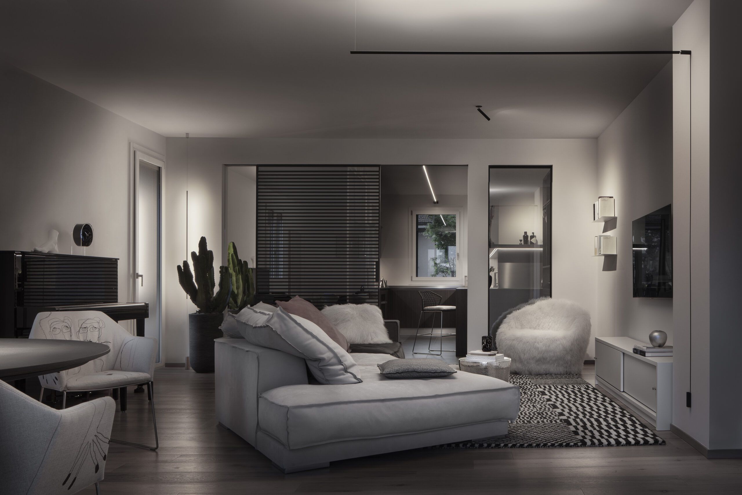 Toni e sfumature di estrema morbidezza incontrano sedie Vitra, letti Flou e armadi Poliform uniti nel sottile legame di un comparto luci di estrema suggestione offerto da Davide Groppi, Artemide e Fontana Arte. In questo contesto è facile apprezzare la cura di ogni dettaglio superbamente progettato per conciliare gusto e ricercatezza estetica.